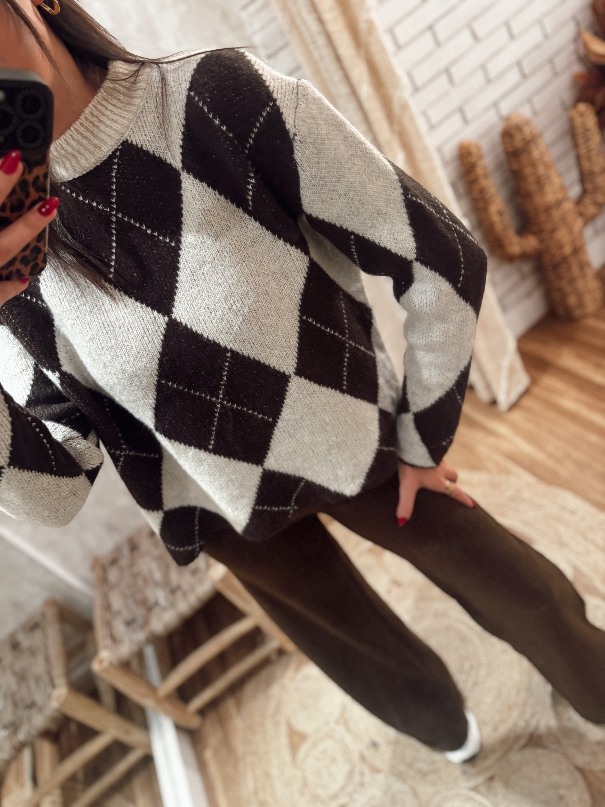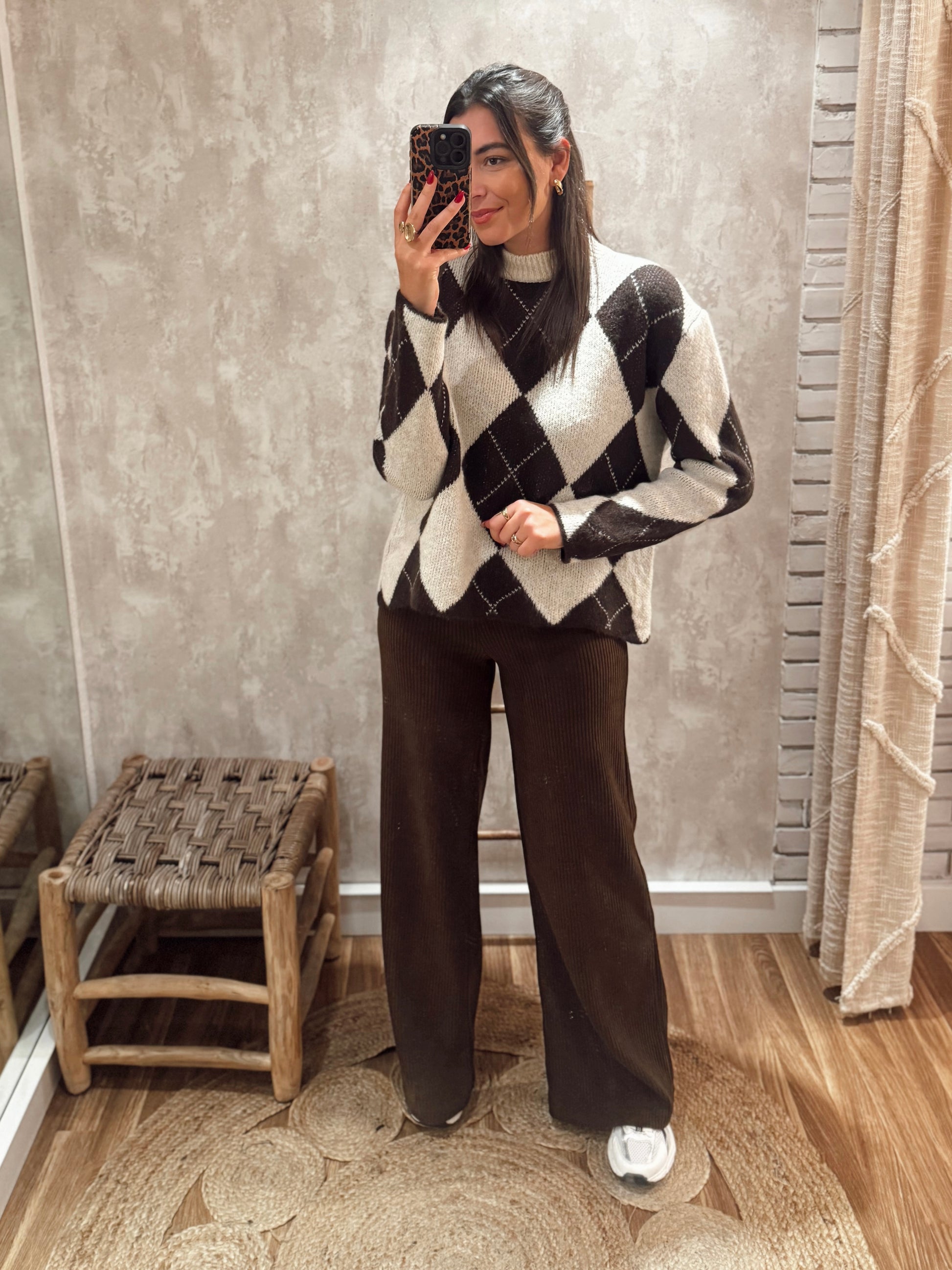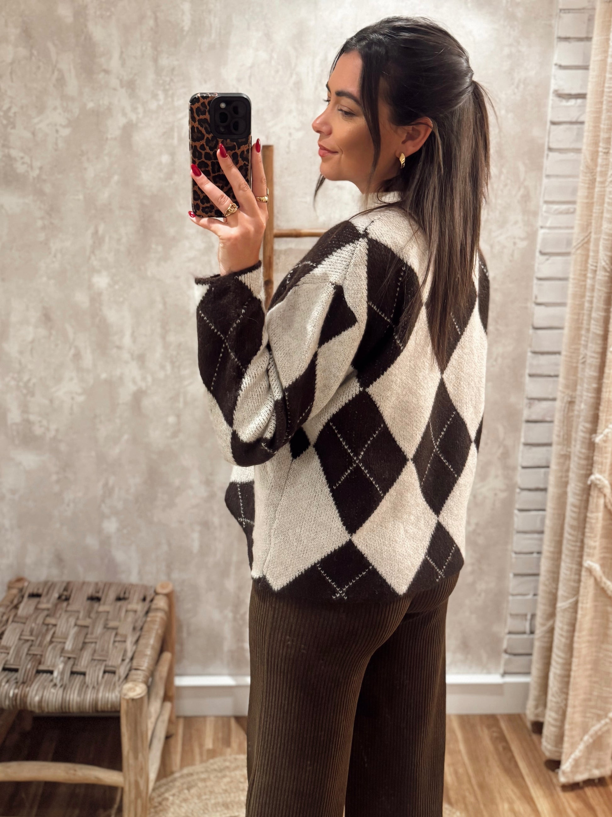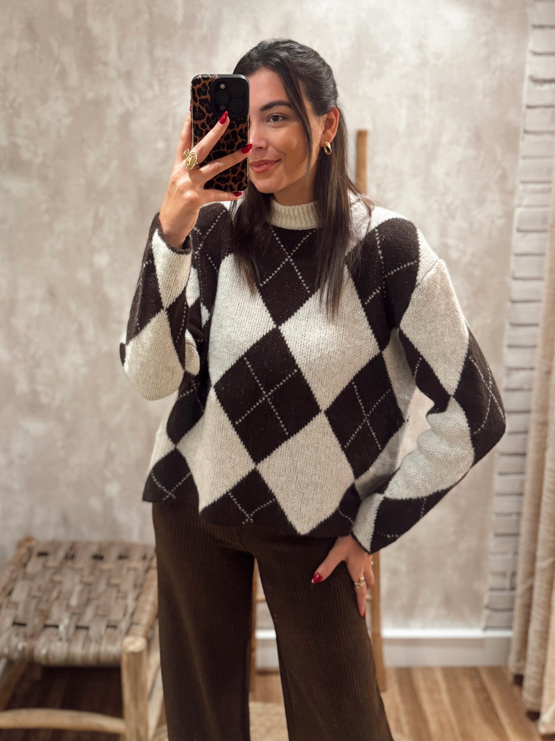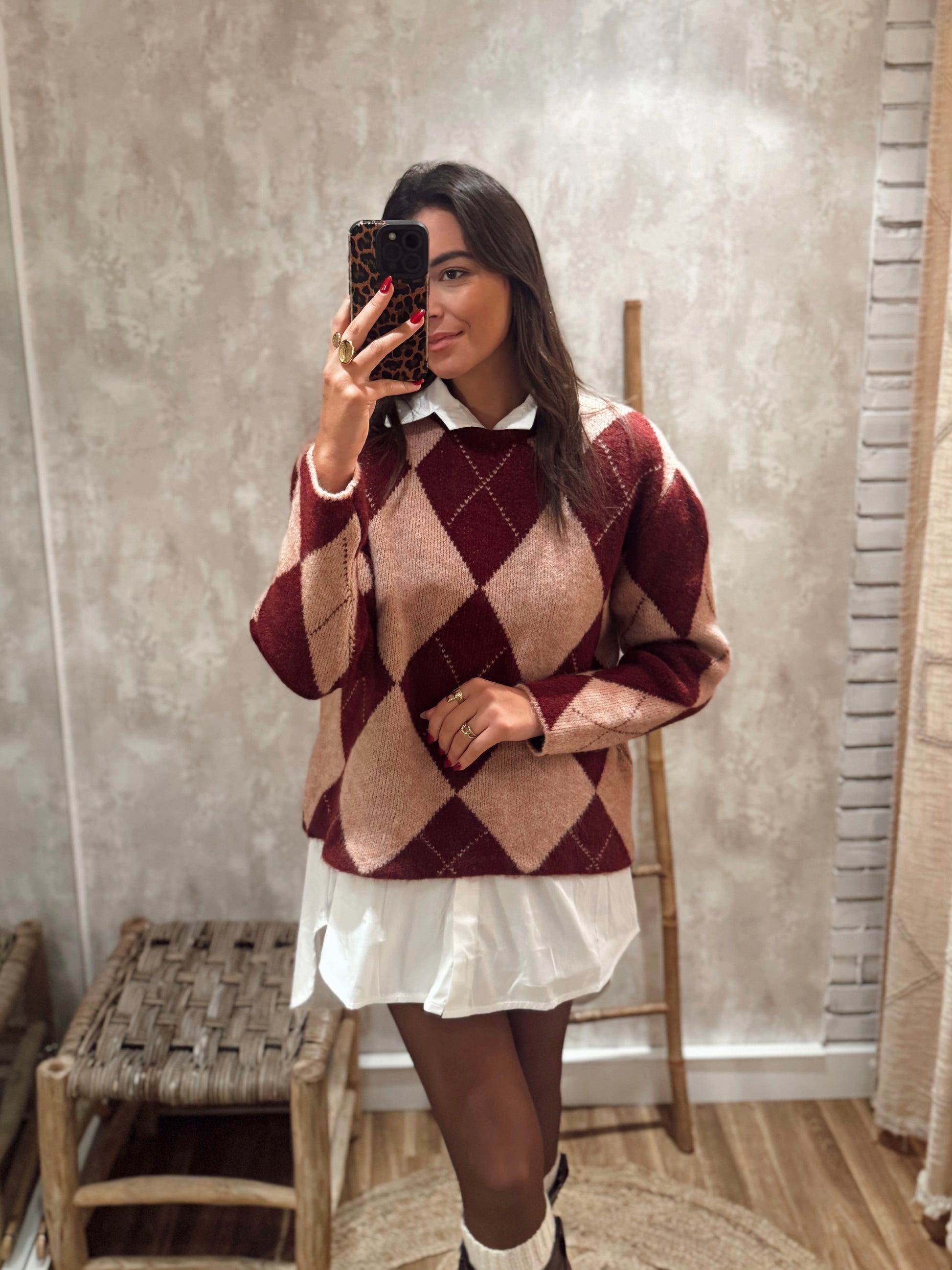 Malha de meia gola com padrão de losangos em relevo, modelo confortável e com ótimo caimento. Um clássico atualizado que resulta bem em looks descontraídos ou mais compostos. Disponível em castanho com bege e também em bordeaux com rosa.