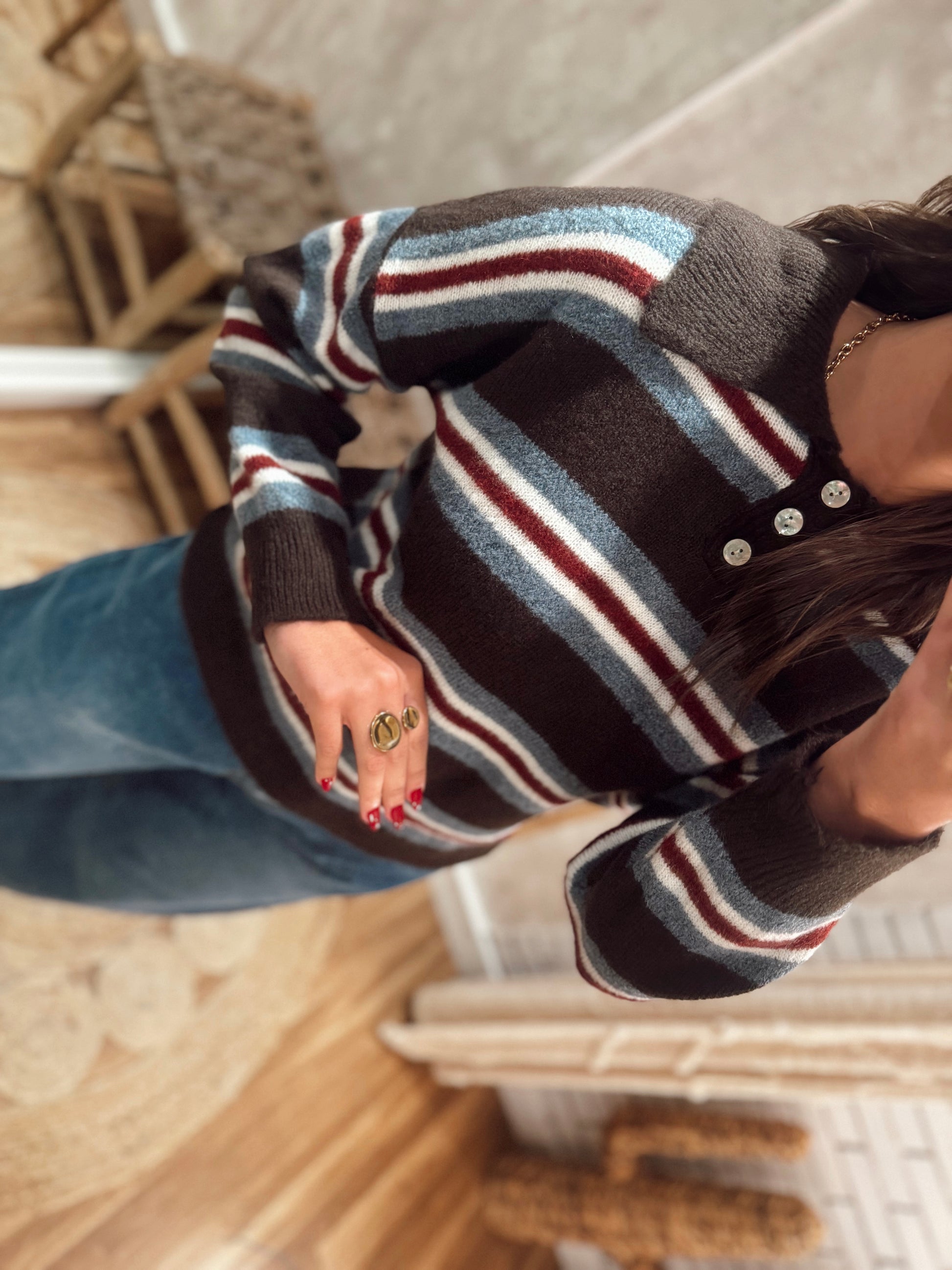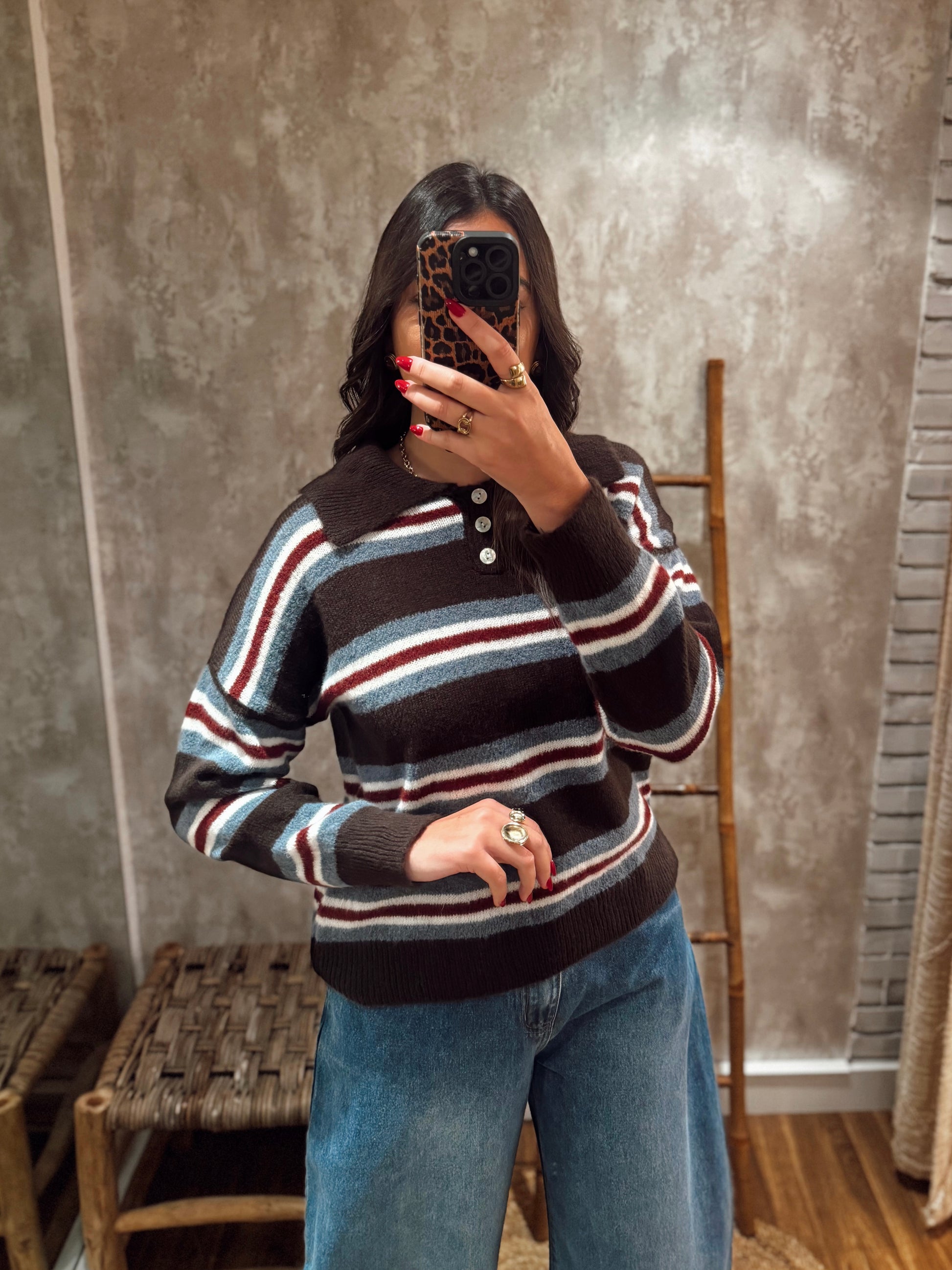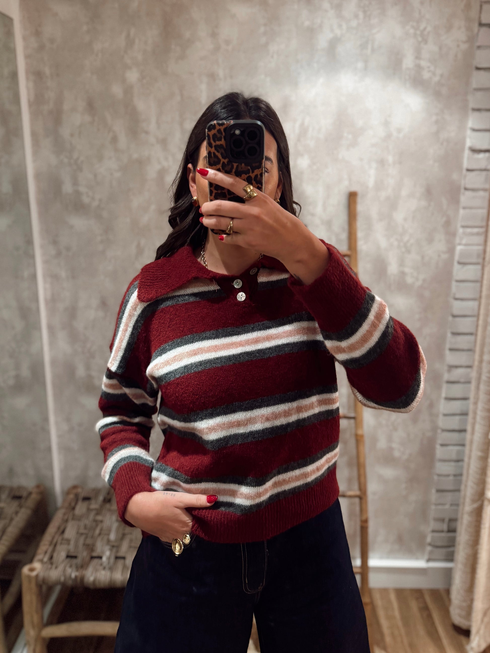 Camisola em malha estilo pólo, super confortável e com aquele ar vintage que está totalmente em alta. O modelo combina riscas em tons suaves com fundo castanho ou bordô, criando duas versões igualmente fáceis de conjugar. A gola pólo com botões dá um toque mais arrumado, enquanto o corte é descontraído e perfeito para usar no dia a dia com ganga, calças largas ou até por baixo de casacos mais estruturados.