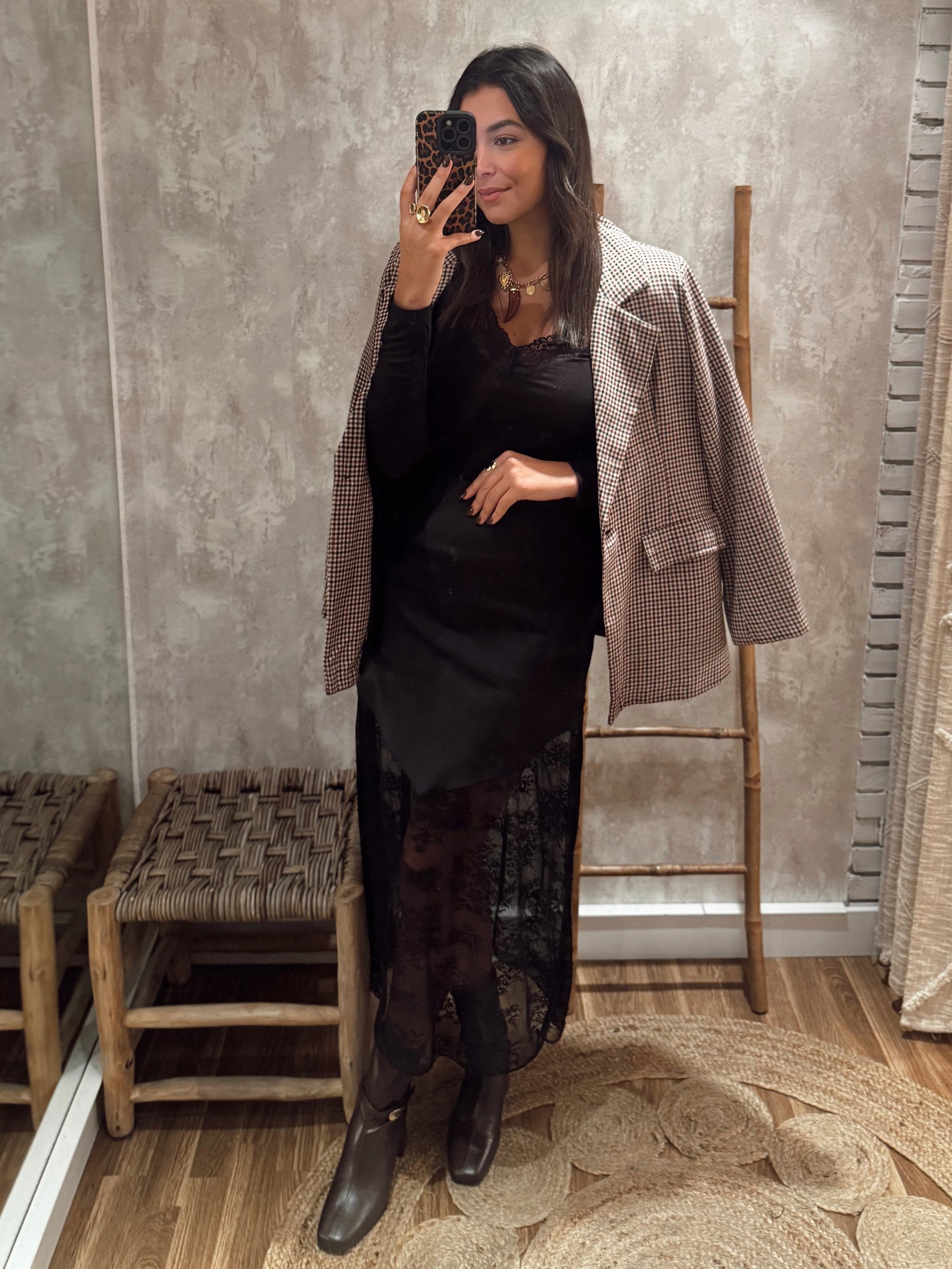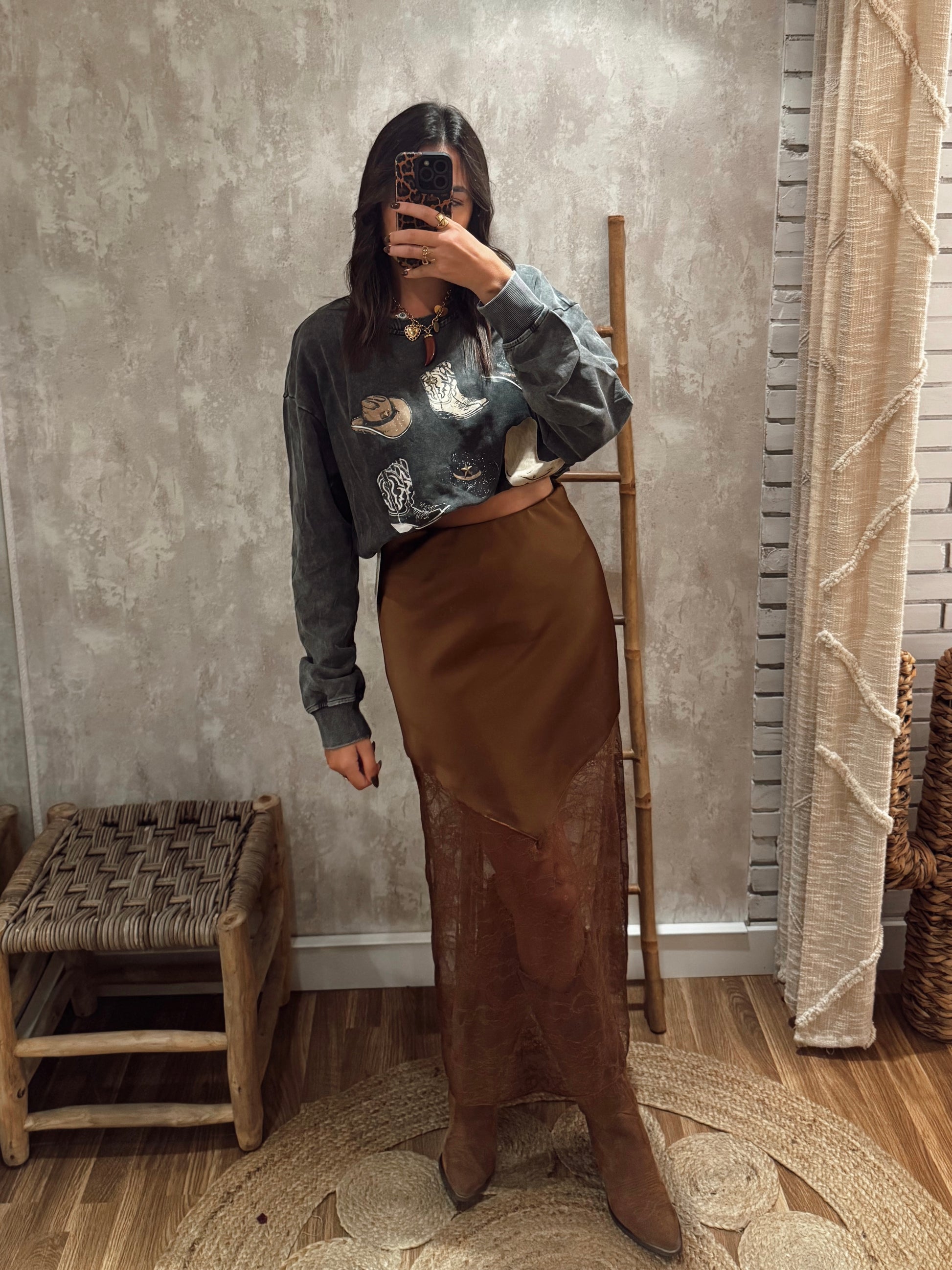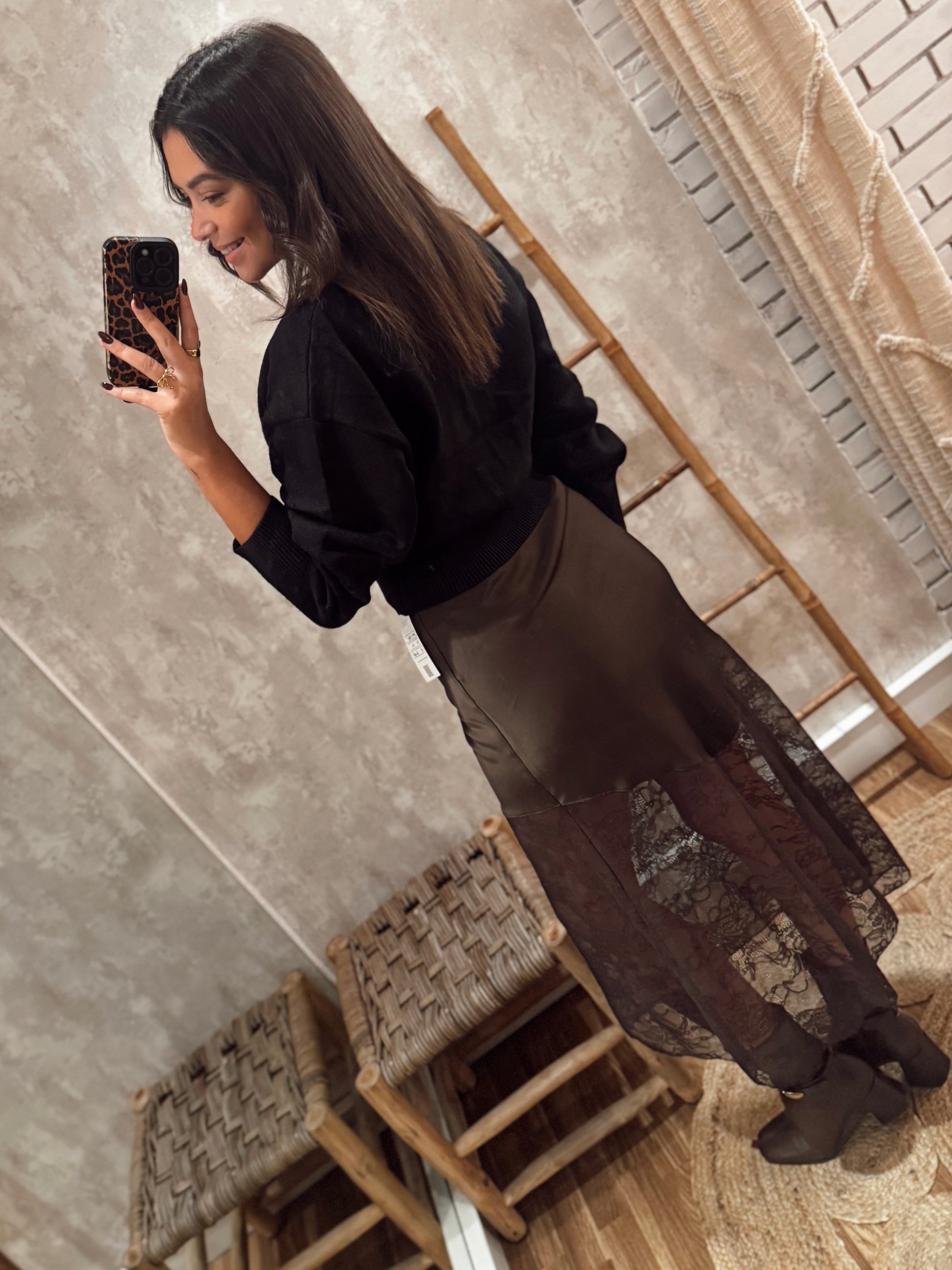 Saia acetinada com detalhe de renda, super feminina e elegante. O modelo é fluido, com um toque acetinado e transparência subtil que cria um efeito lindo em movimento. Pode ser usada em looks mais descontraídos com sweatshirts ou em coordenados mais sofisticados com camisas ou tops acetinados.