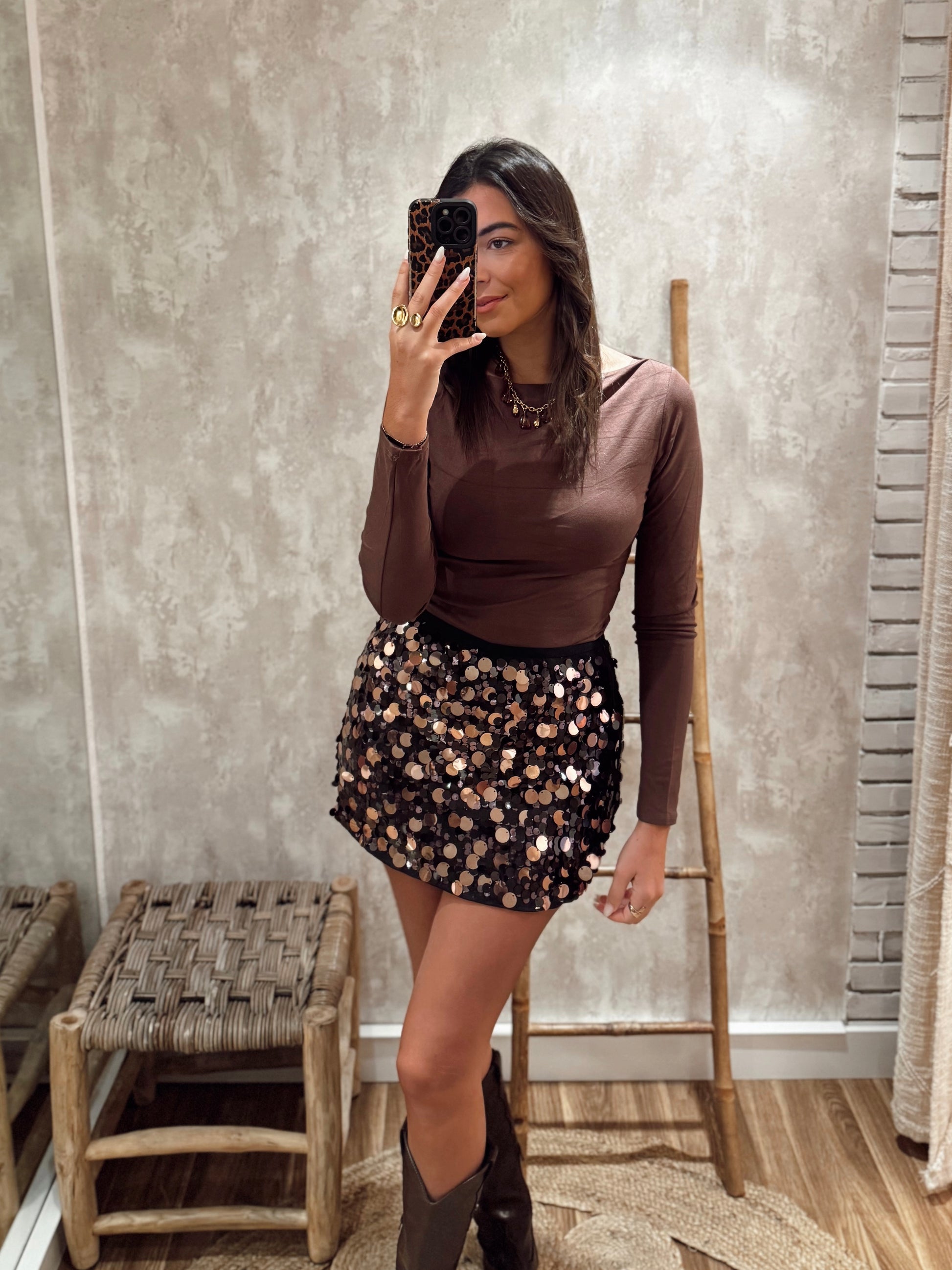 Saia curta com lantejoulas grandes em tons de castanho e preto, que criam um efeito de brilho forte e super moderno. O modelo tem forro em calção, garantindo conforto e segurança ao usar, mesmo sendo uma peça mais curta. A cintura assenta bem e a estrutura mantém a saia firme, perfeita para coordenados de festa ou looks mais ousados com botas ou saltos.