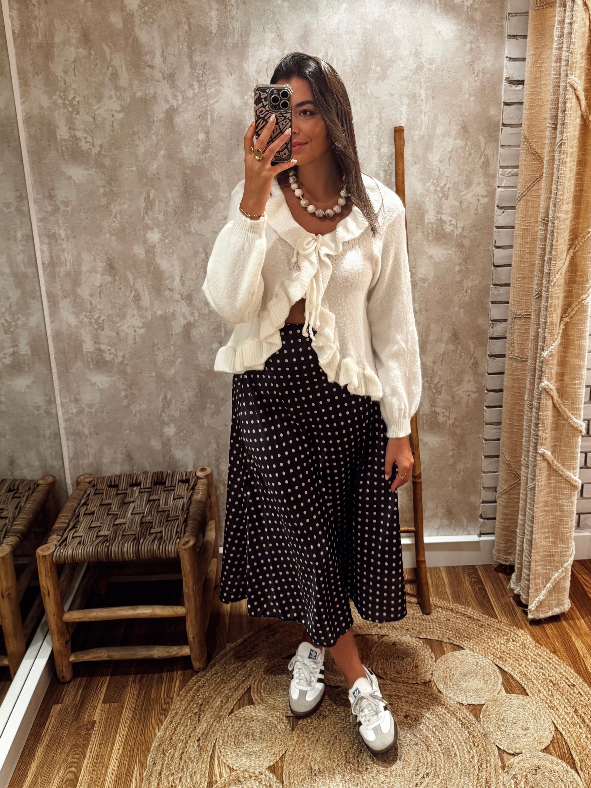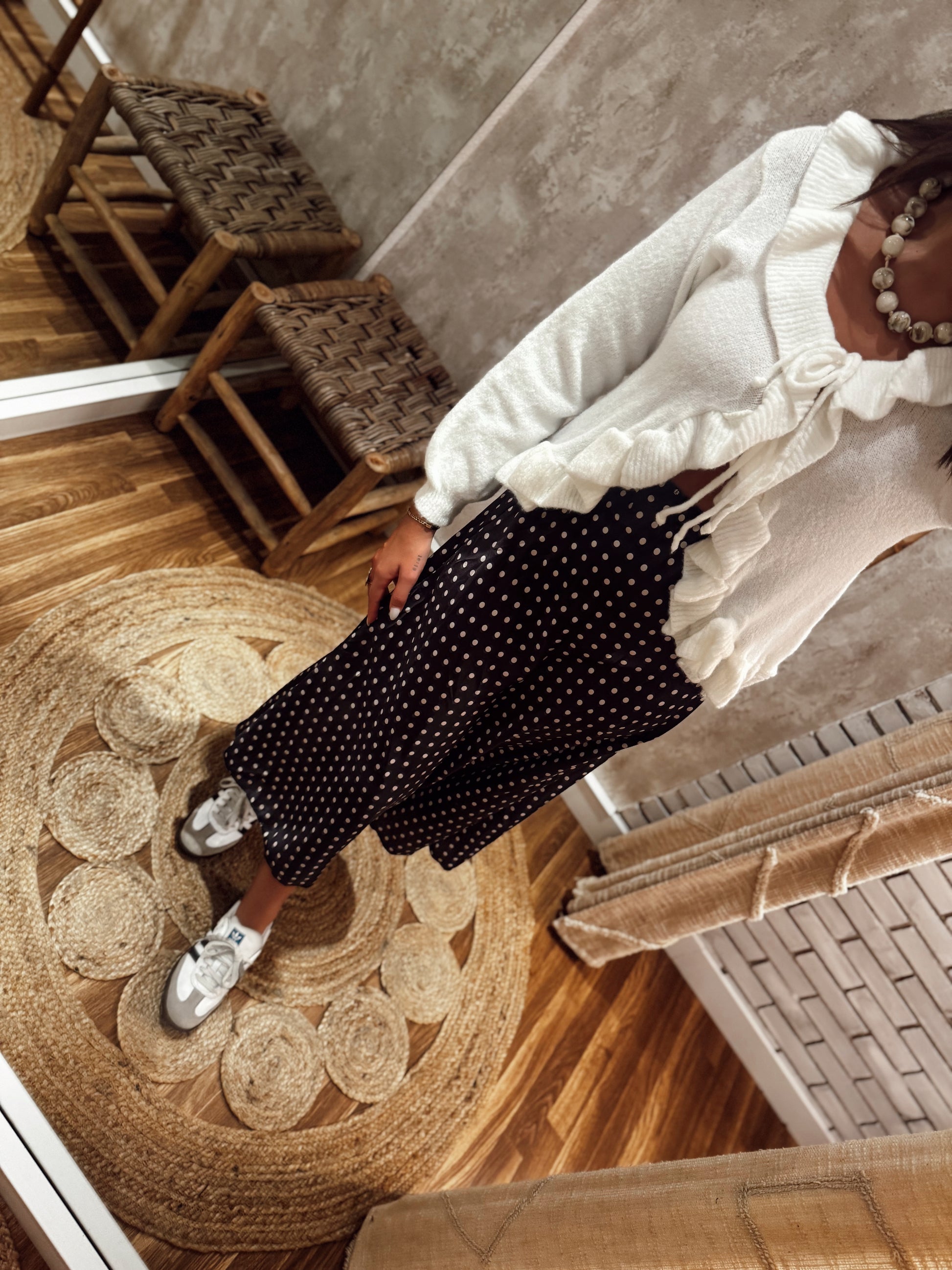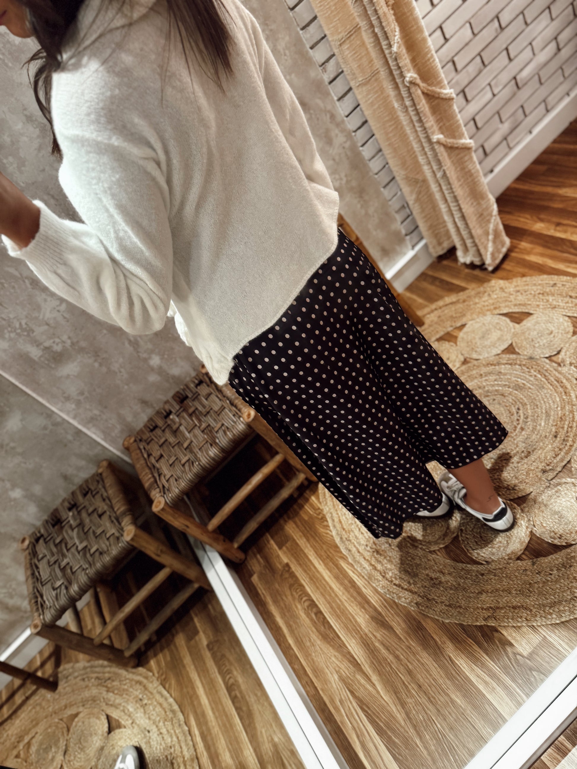 Saia midi acetinada com padrão de bolinhas, num estilo intemporal e feminino que nunca sai de moda. O corte é leve e confortável, garantindo movimento elegante em cada passo. Uma peça versátil que pode ser usada tanto em looks casuais com ténis, como em coordenados mais arrumados com sandálias ou botas.