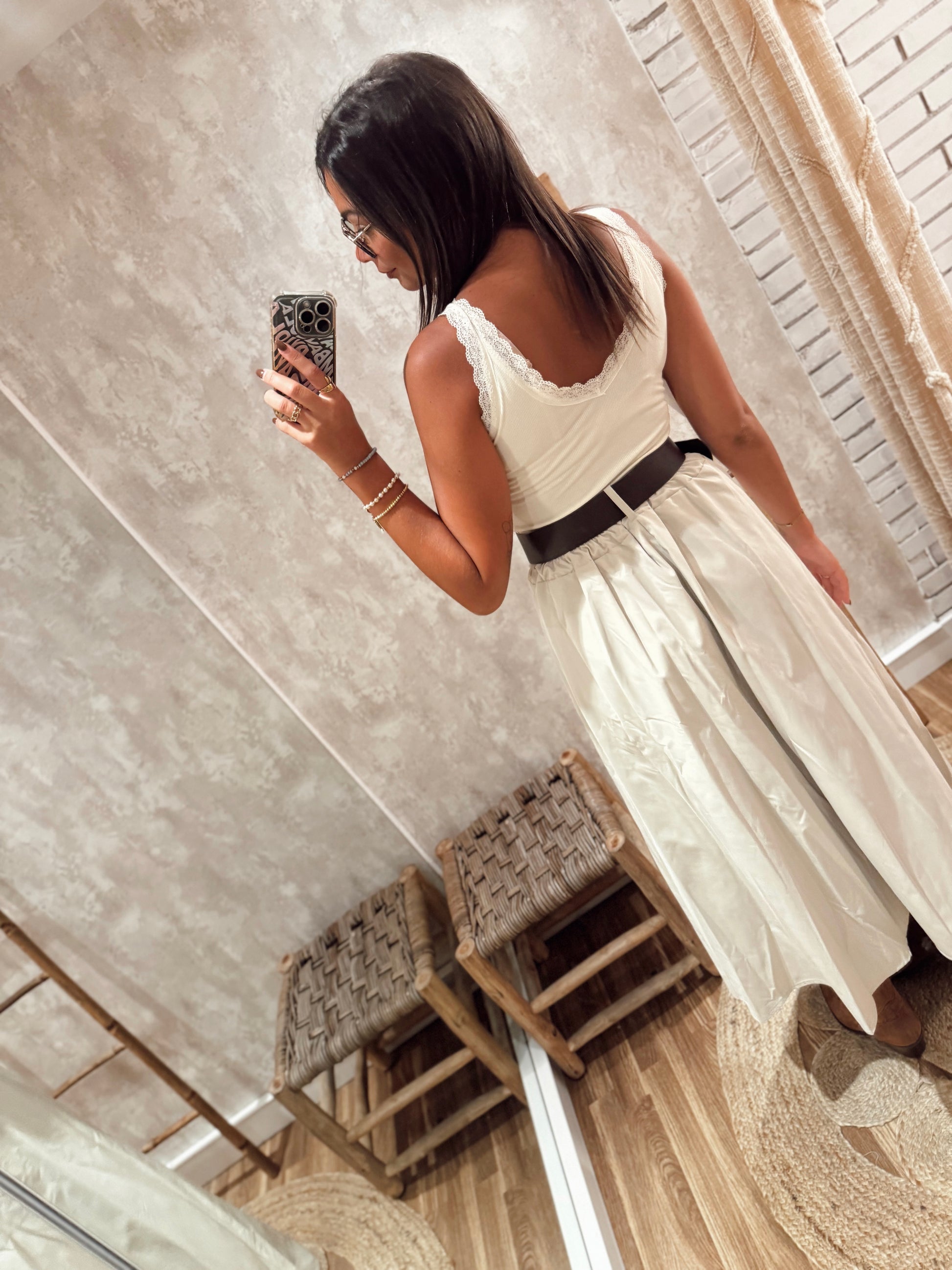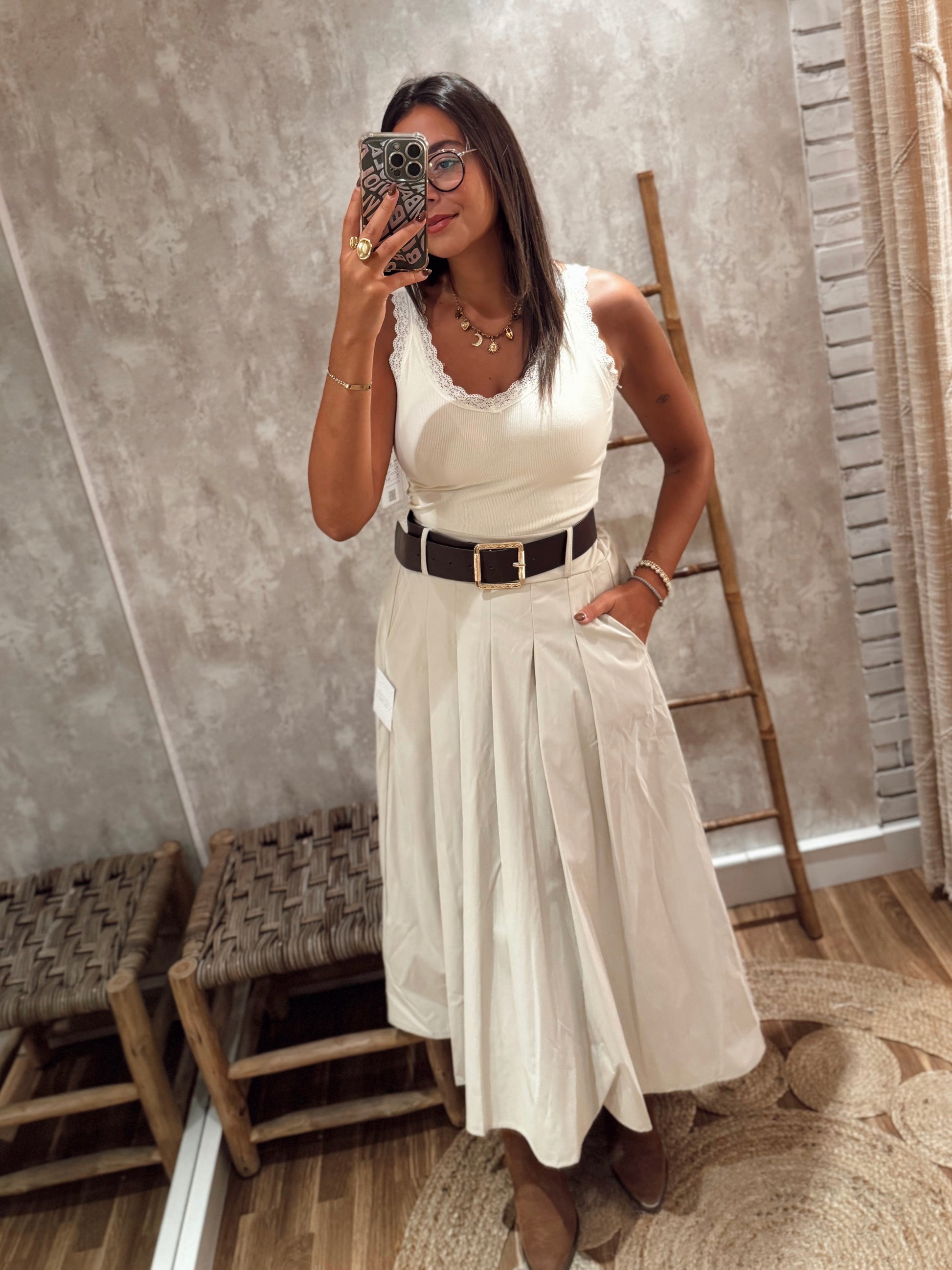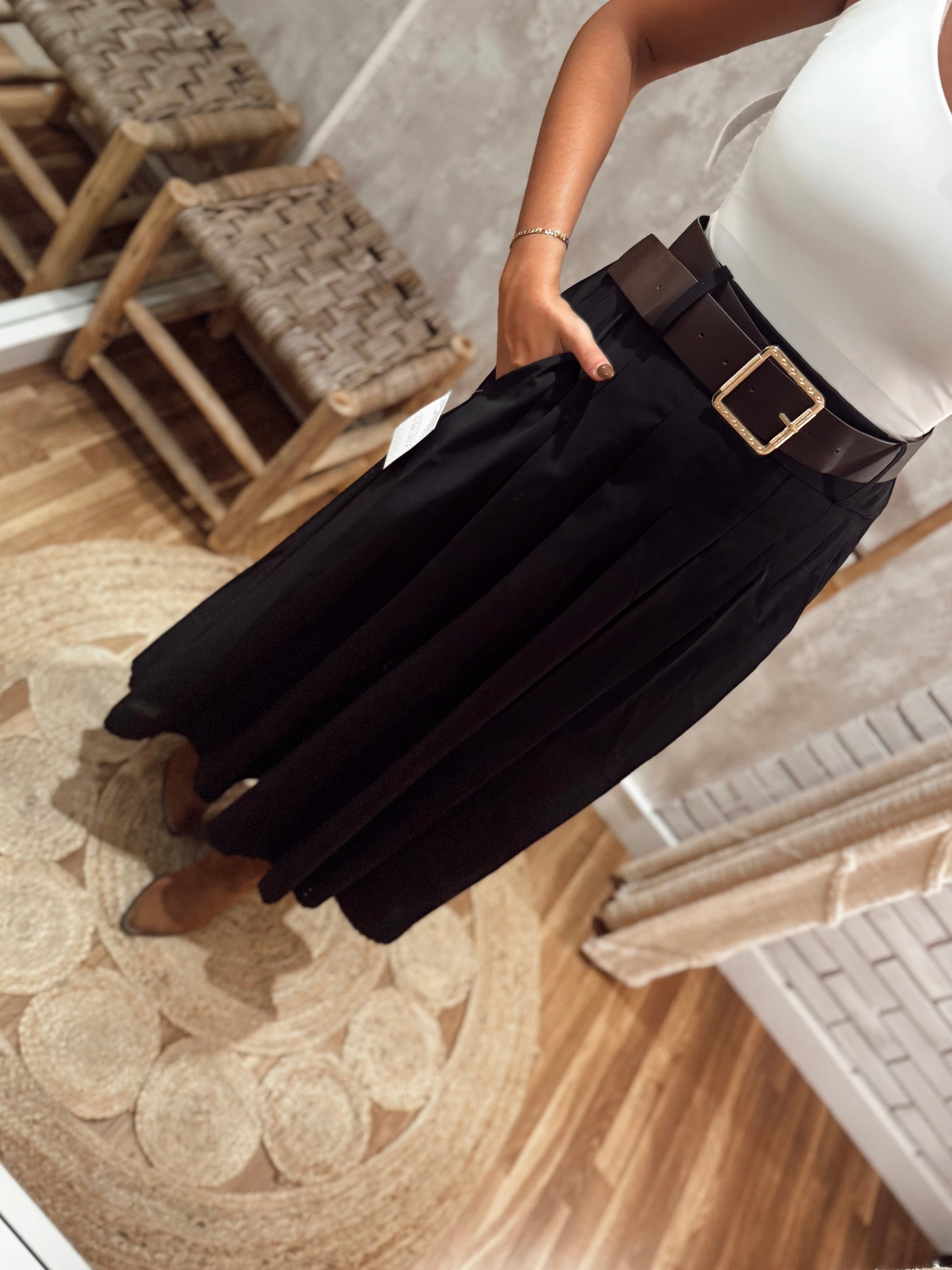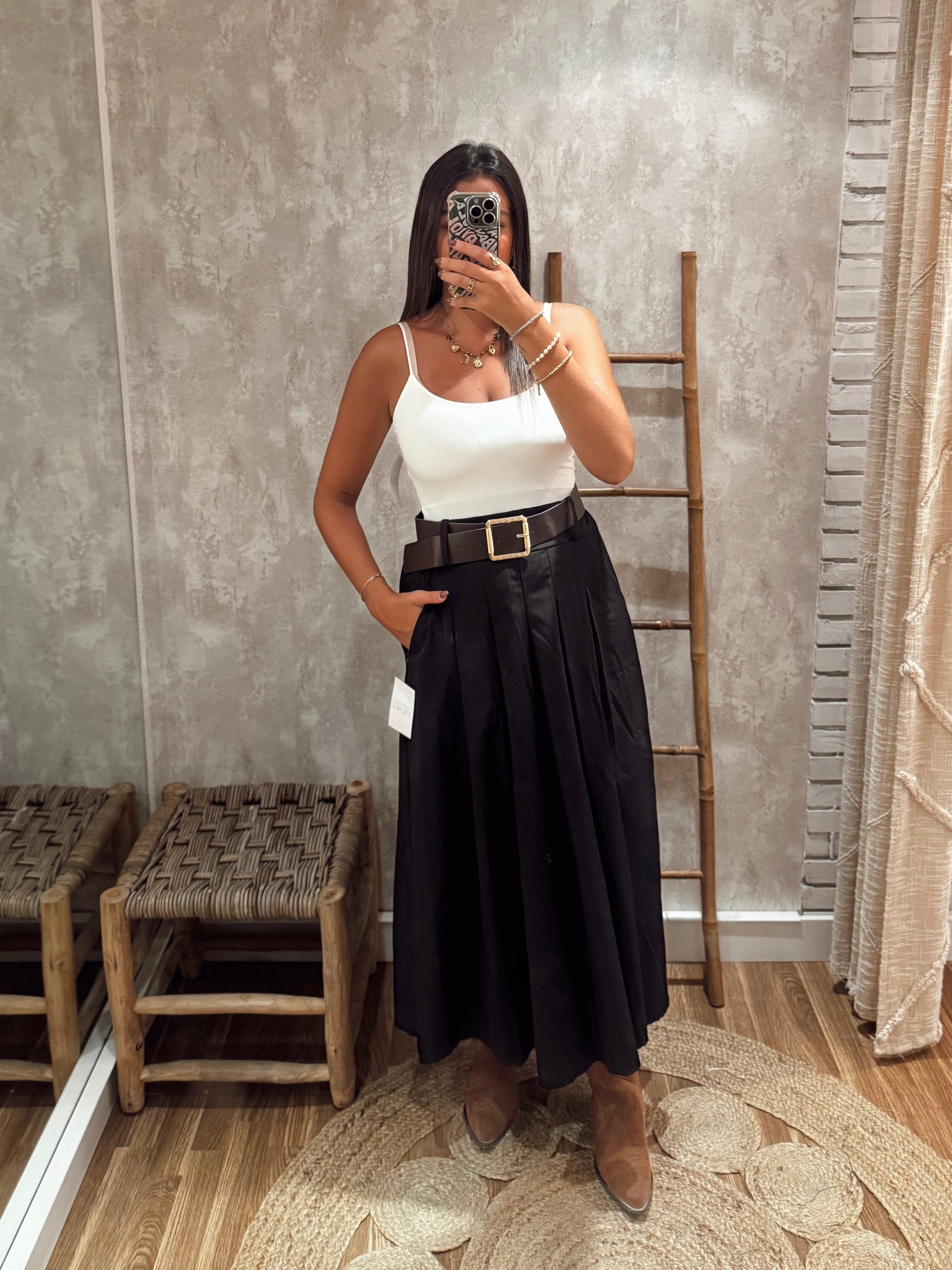 Saia midi em tecido estilo gabardine, estruturado e com excelente caimento. O modelo apresenta pregas frontais que lhe dão volume e movimento, bolsos laterais práticos e elástico na parte de trás da cintura para maior conforto. Inclui cinto largo no mesmo tom, com fivela dourada, para realçar a silhueta. Disponível em preto e bege.