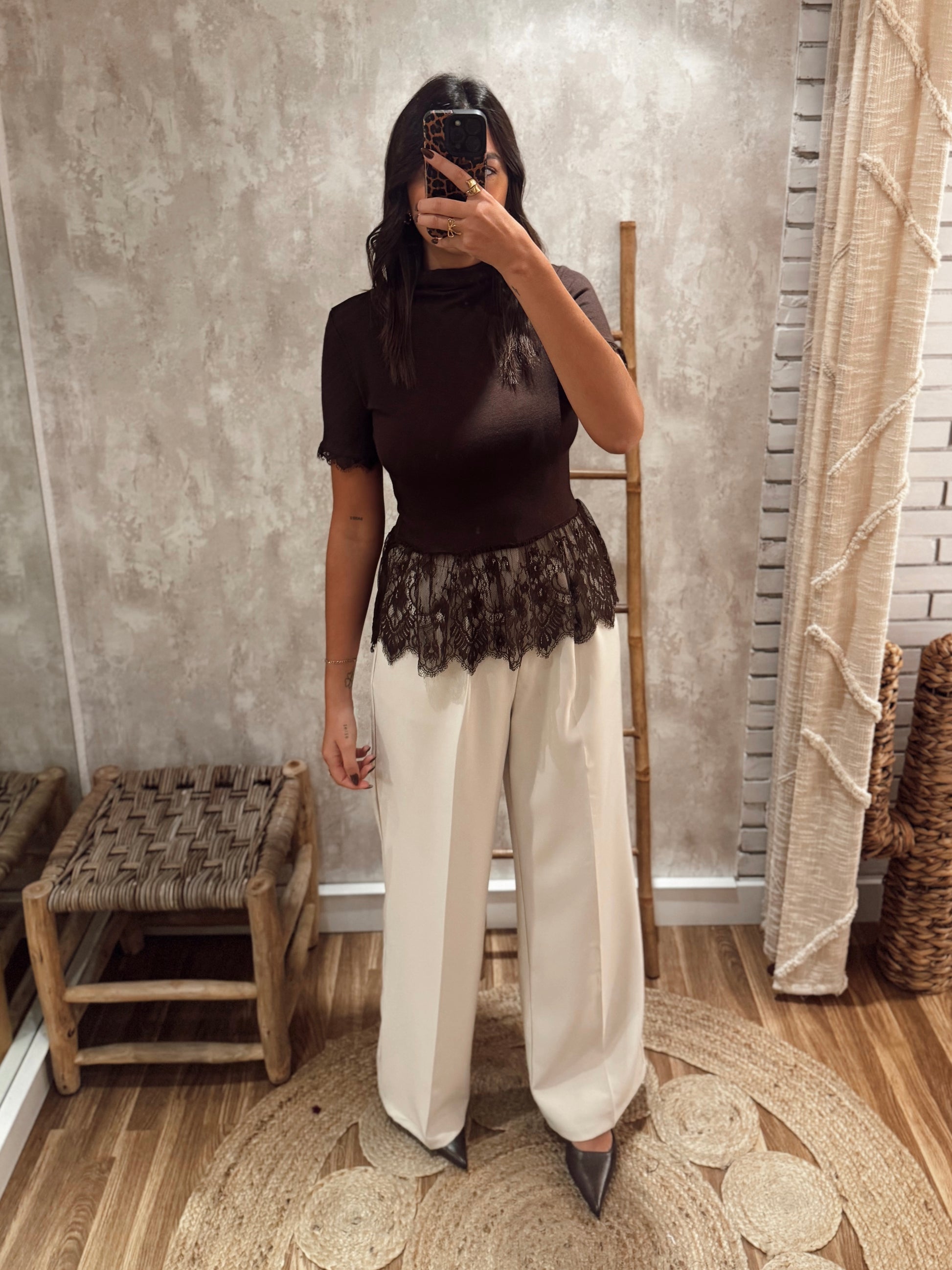 T-shirt em malha suave com detalhe de renda na zona inferior e nas mangas — um toque feminino e delicado que faz toda a diferença. O corte ajustado valoriza a silhueta, tornando-a perfeita para conjugar com calças, saias ou por baixo de blazers.