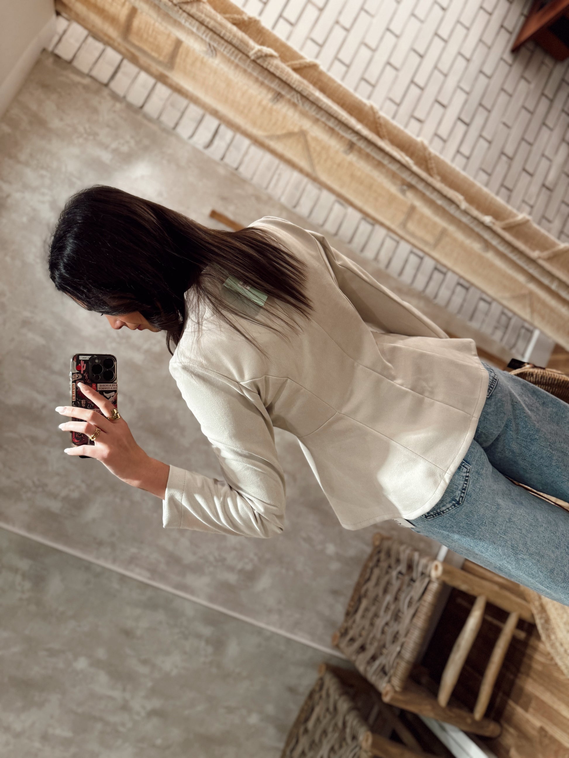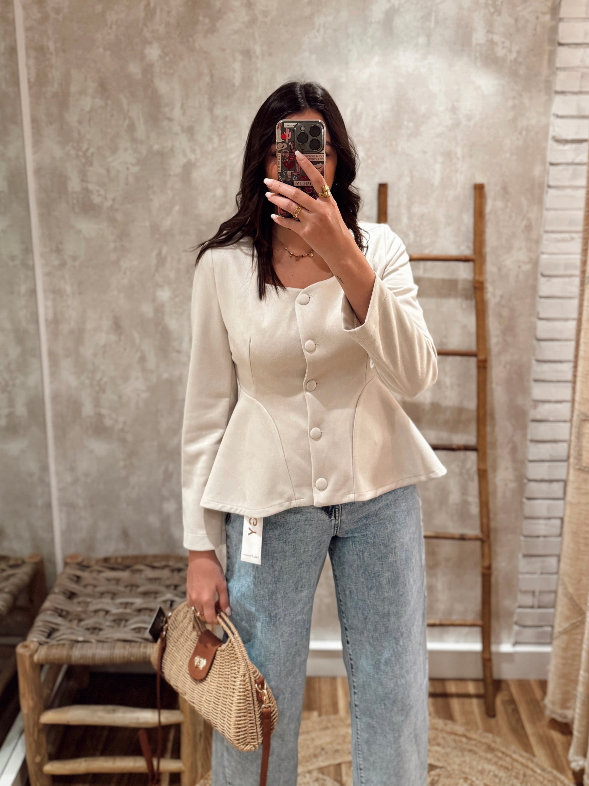 Blazer em tecido tipo pele de pêssego, super macio ao toque e com acabamento elegante. Modelo cintado com corte peplum, que realça a silhueta. Fecha com botões forrados a condizer e tem um ar feminino e sofisticado, perfeito para elevar qualquer look — desde jeans a vestidos mais clássicos.