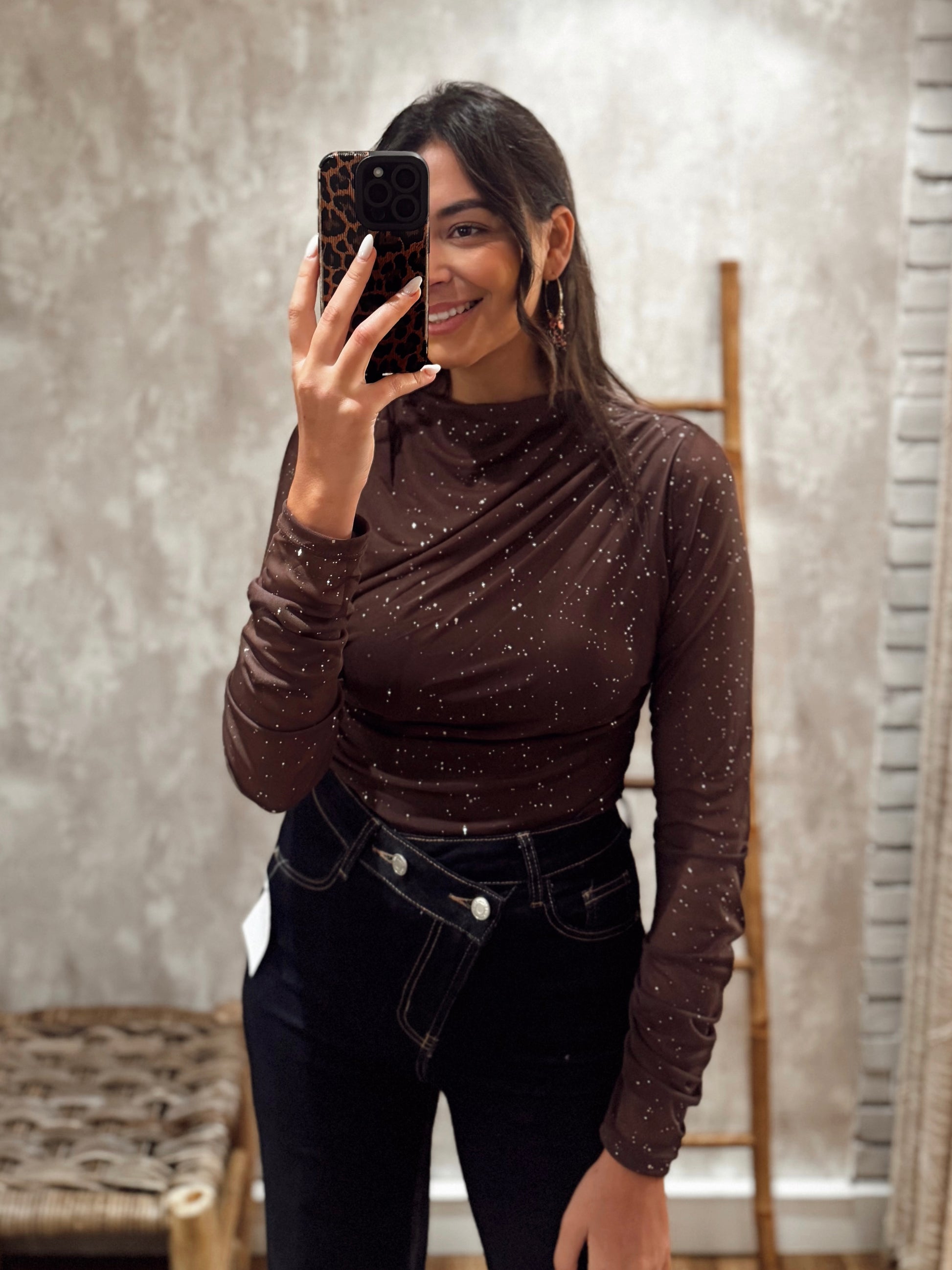 Top em tule com efeito de brilhos, perfeito para dar aquele toque especial ao look. As mangas são transparentes, deixando o tule à mostra, enquanto a zona do peito e da barriga tem forro, garantindo conforto e cobertura. O drapeado frontal cria um caimento muito bonito e elegante, valorizando a silhueta de forma subtil.