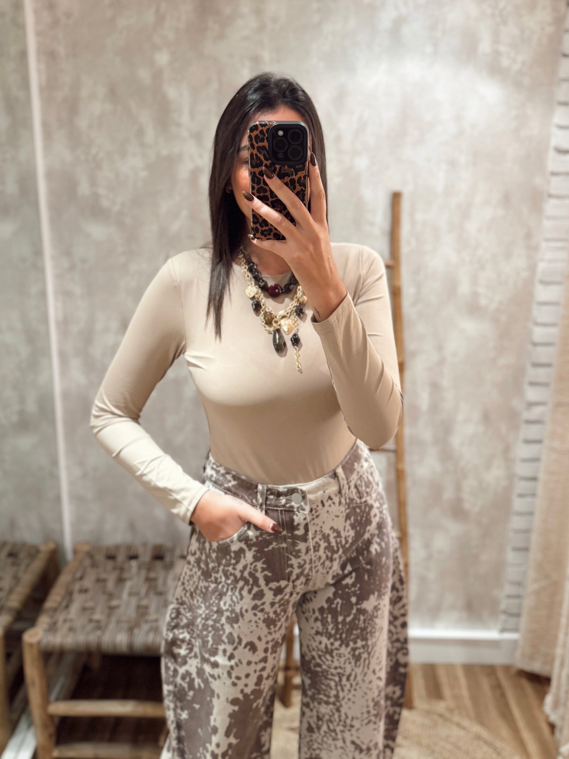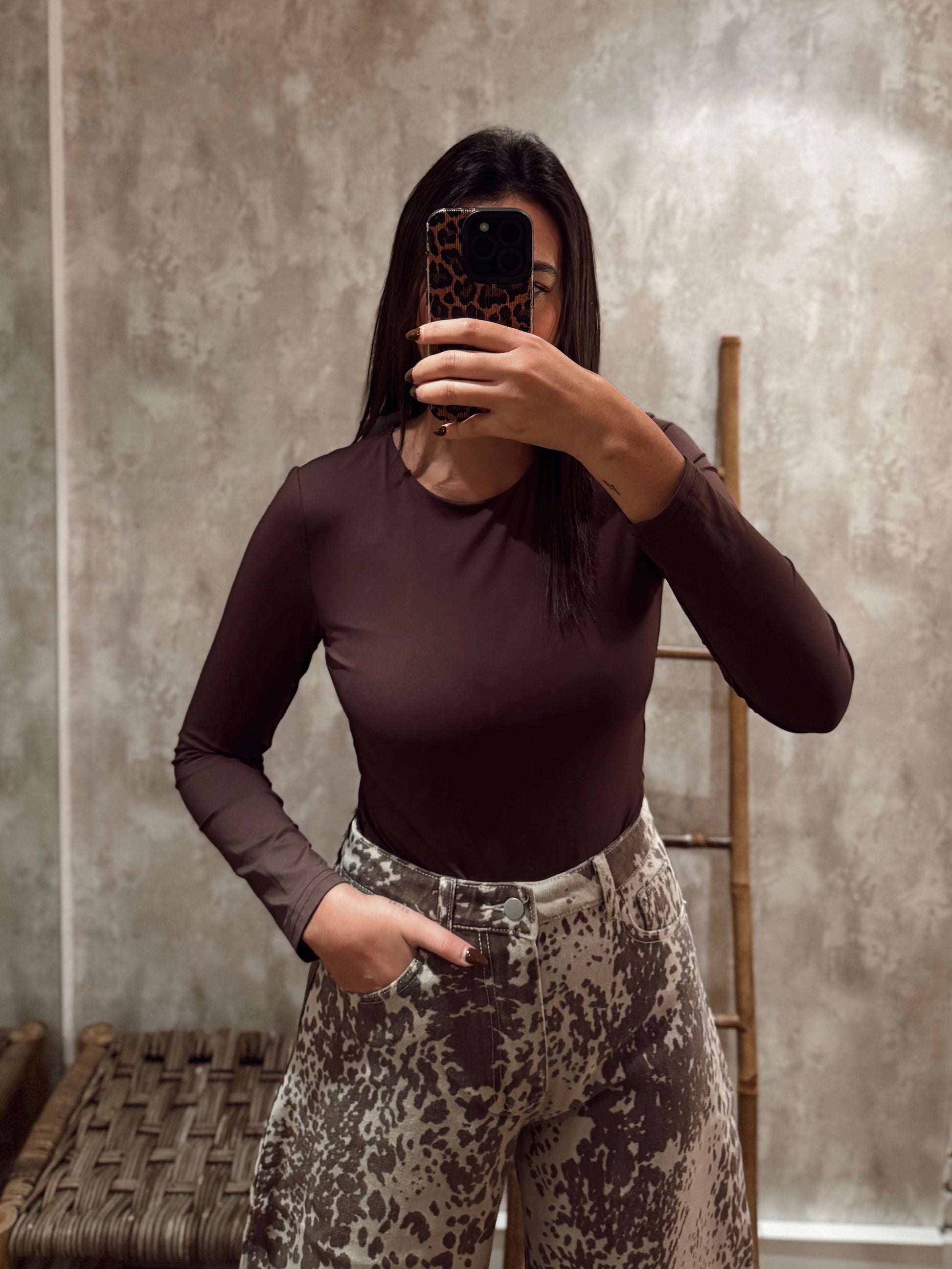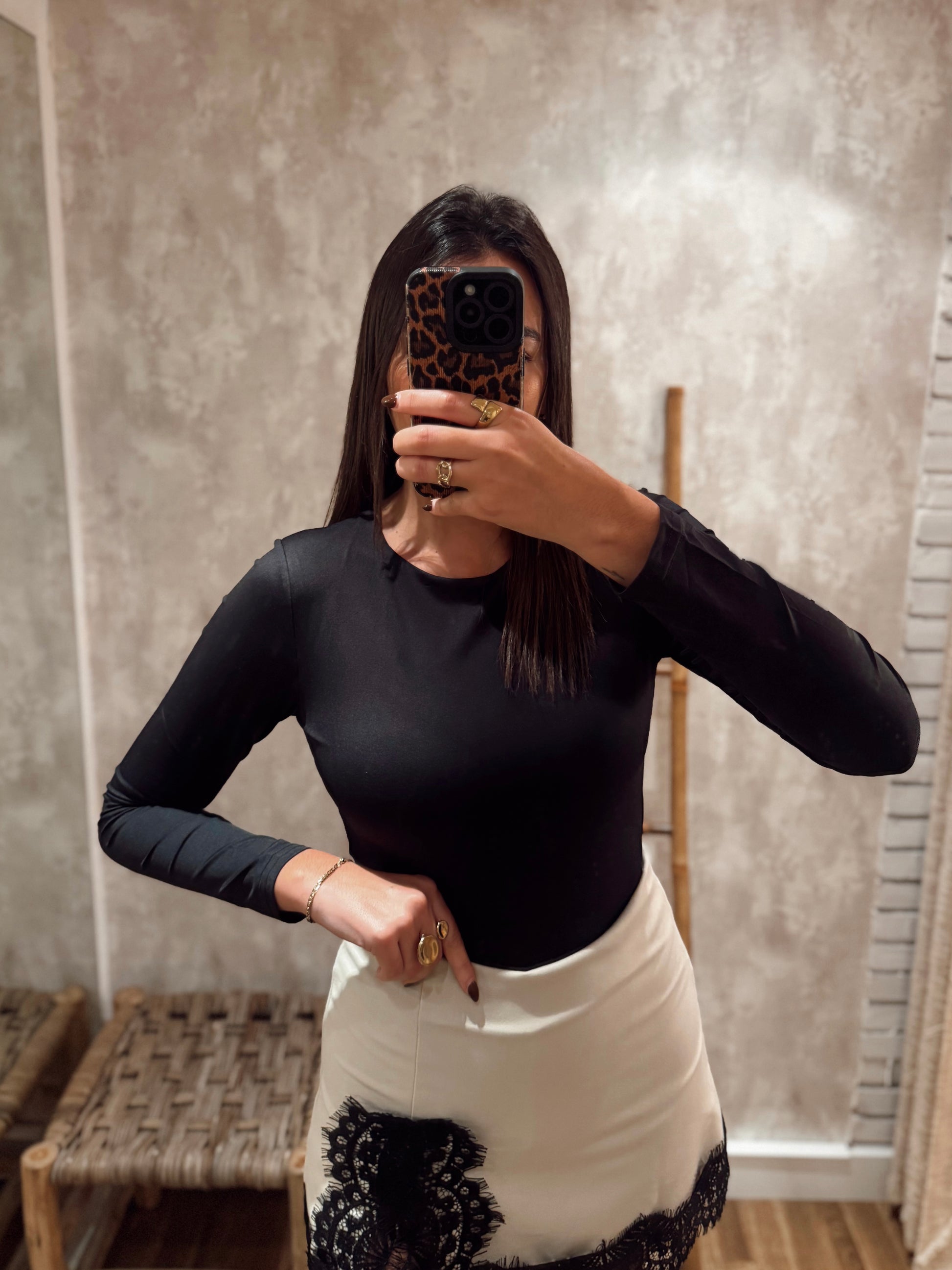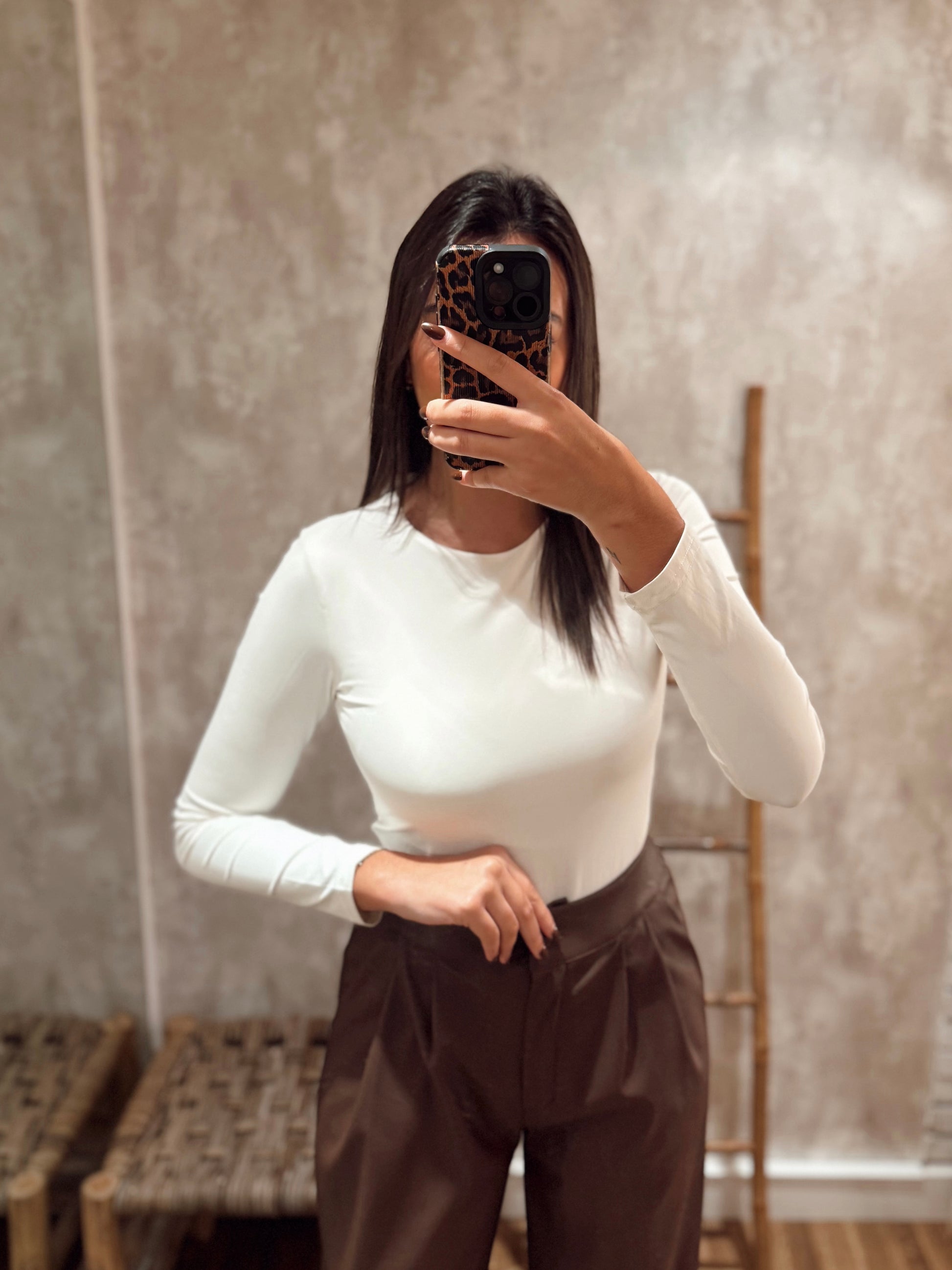 Body em lycra com duplo forro, de toque suave e corte justo que se adapta ao corpo com conforto. Apresenta decote redondo e mangas compridas, tornando-o uma peça essencial para combinar em qualquer look — desde o mais casual ao mais elegante. Disponível em bege, branco, preto e castanho.