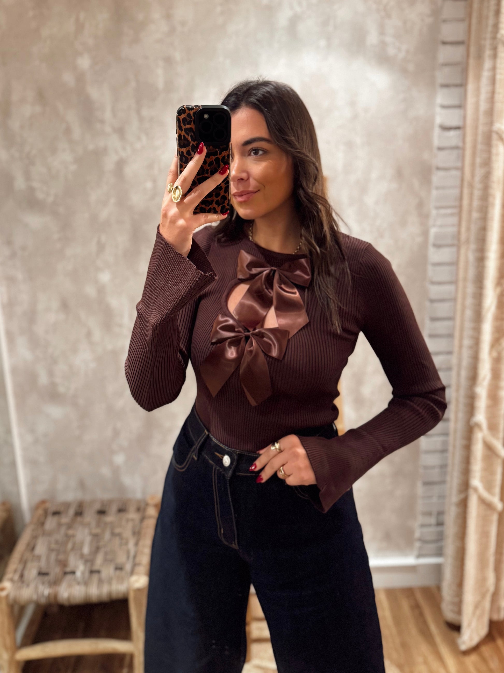 Body em malha canelada de toque suave, com uma abertura elegante no peito e dois lacinhos em cetim aplicados com alfinete — totalmente removíveis, para usares a peça de forma mais discreta ou mais marcante, conforme o look. O tecido assenta bem no corpo, alonga a silhueta e adapta-se ao movimento graças à elasticidade. Um básico com personalidade, disponível em várias cores fortes para destacar qualquer outfit.