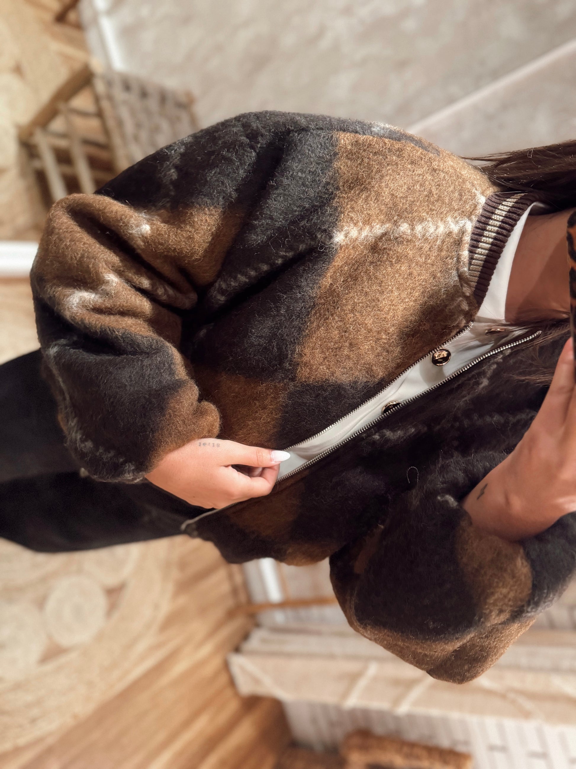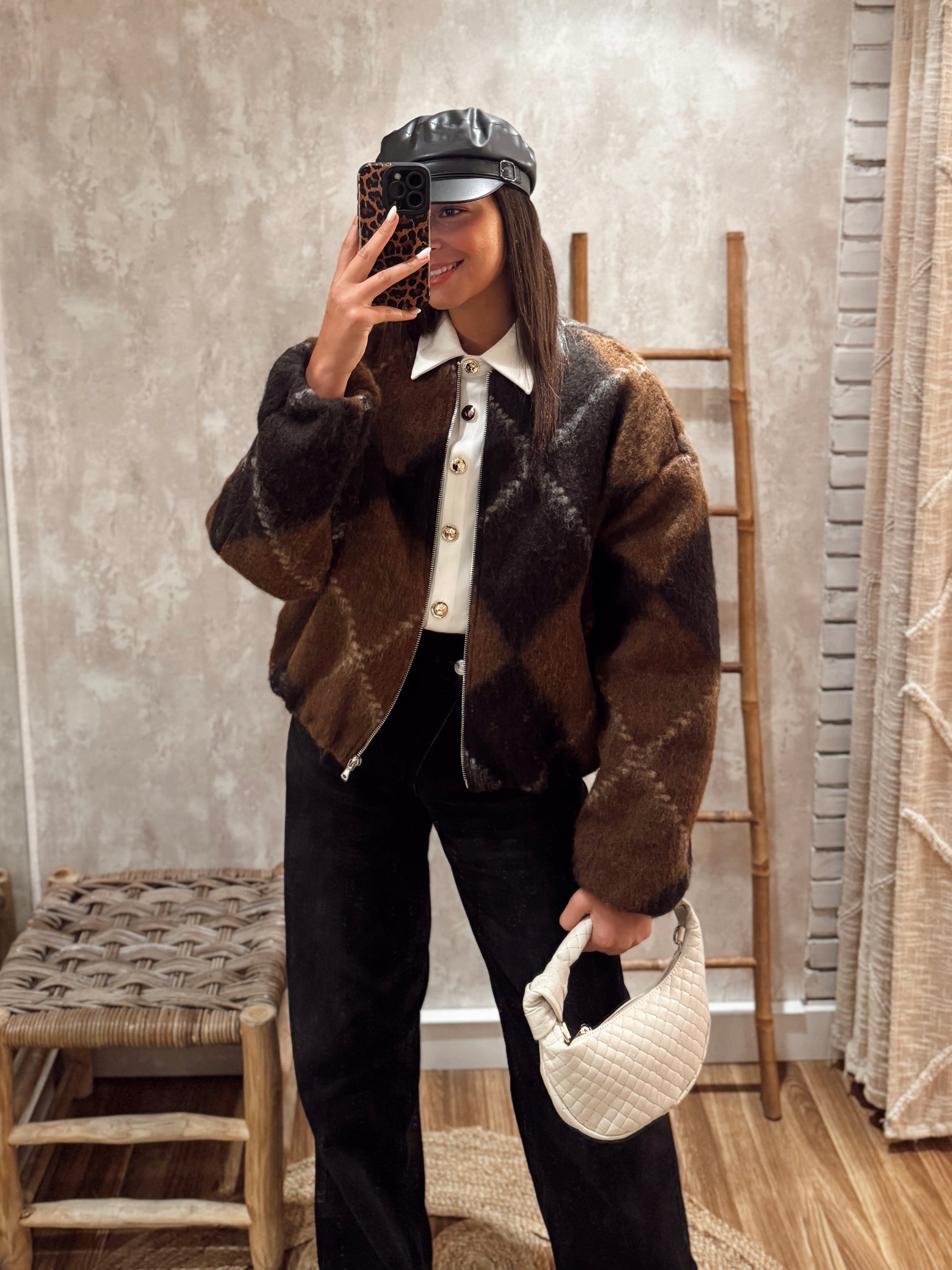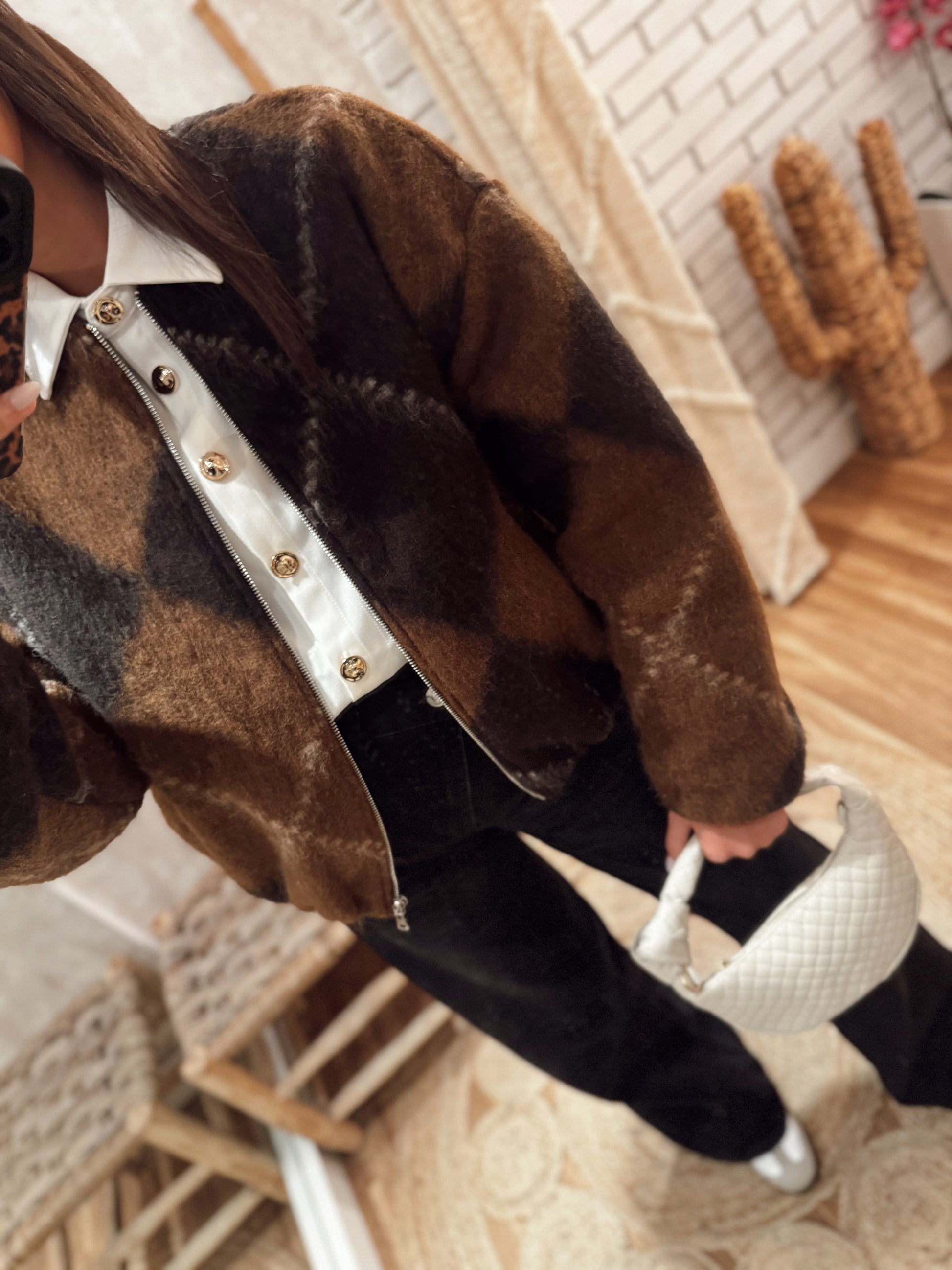 Um bomber super marcante, com o padrão geométrico nos tons de castanho que está em grande destaque este ano. O tecido tipo fazenda com pêlo cria um efeito abluado muito giro e uma textura que se nota ao vivo — aconchegante, suave e com aquele aspeto moderno que transforma qualquer look.