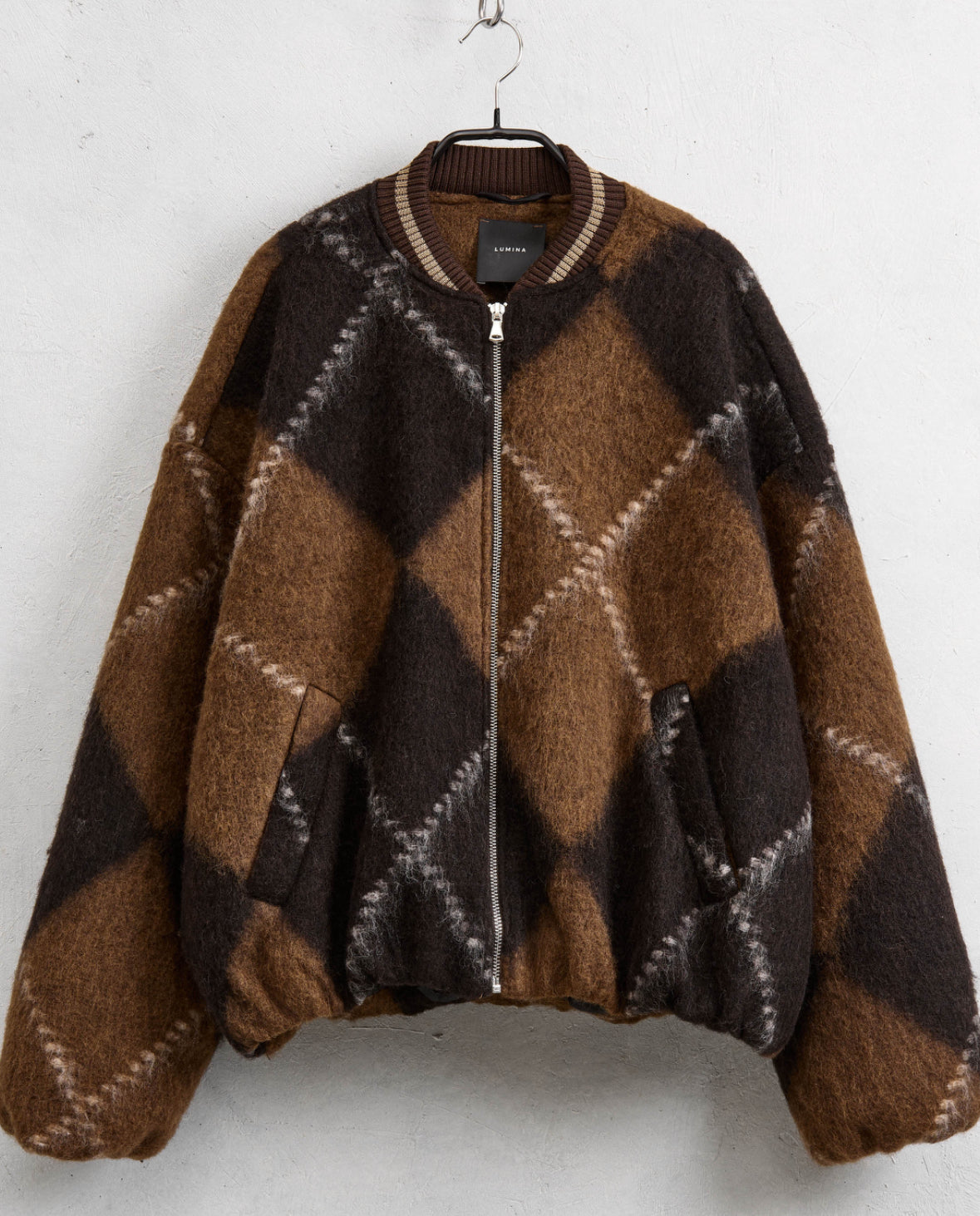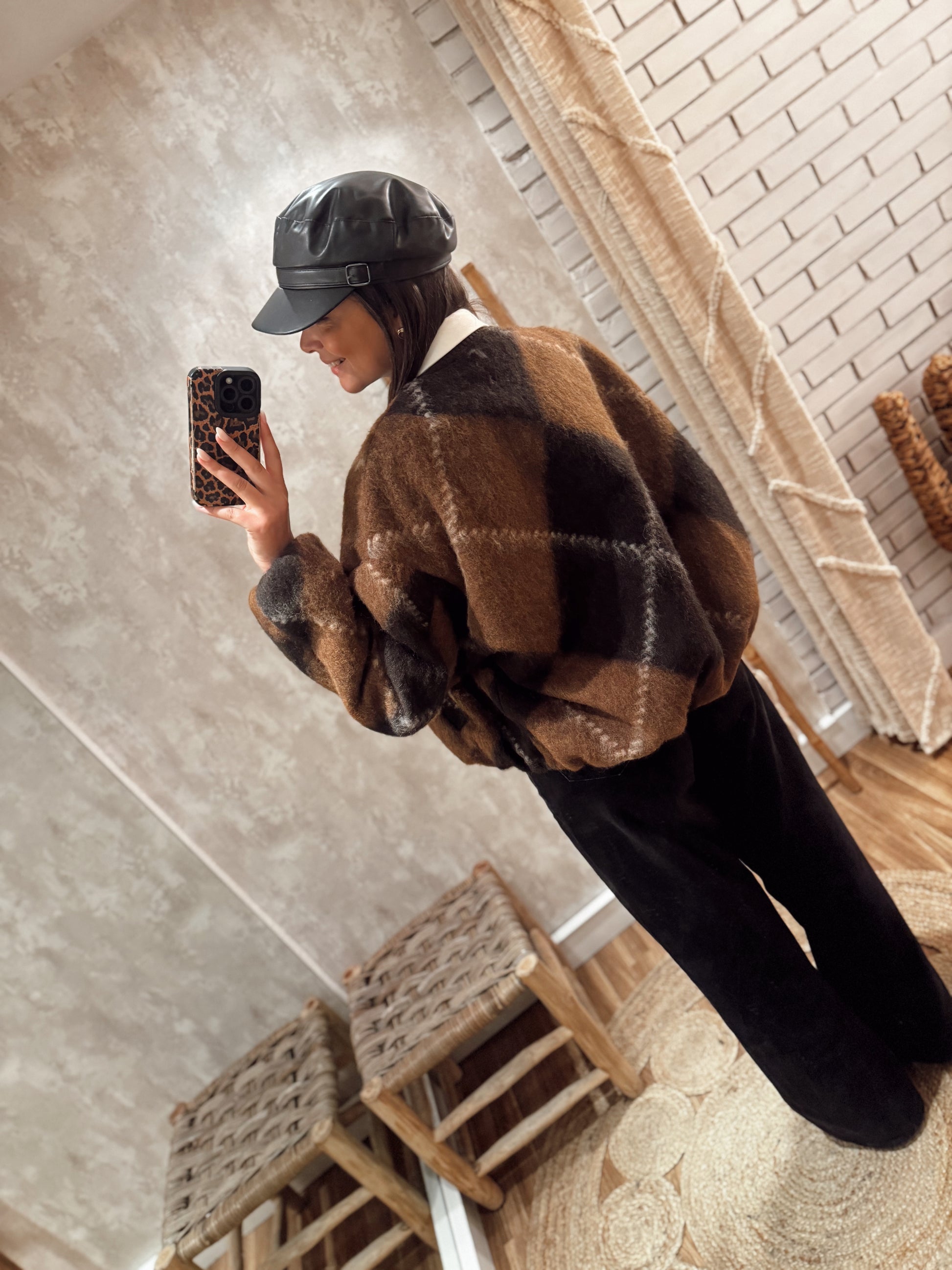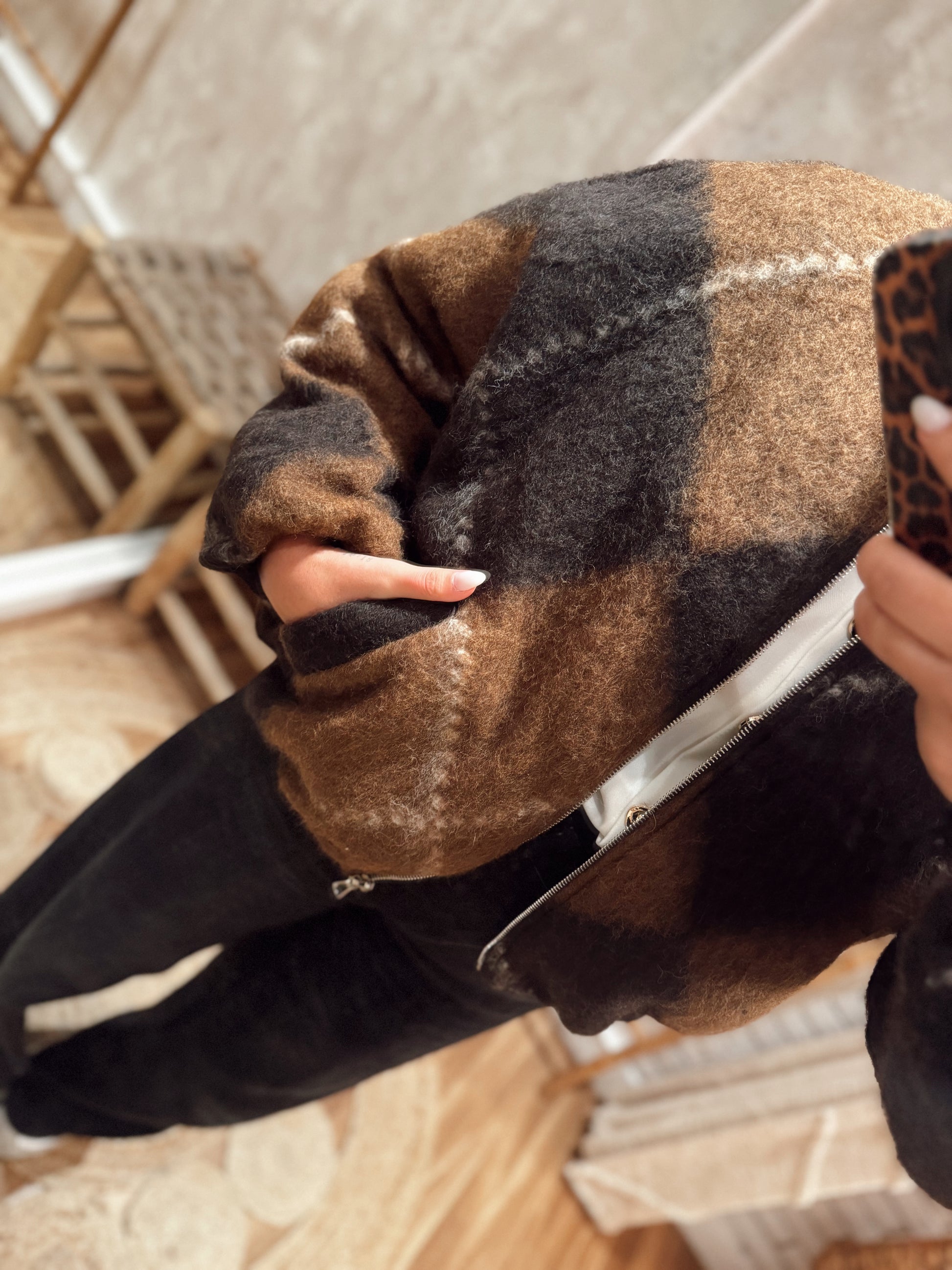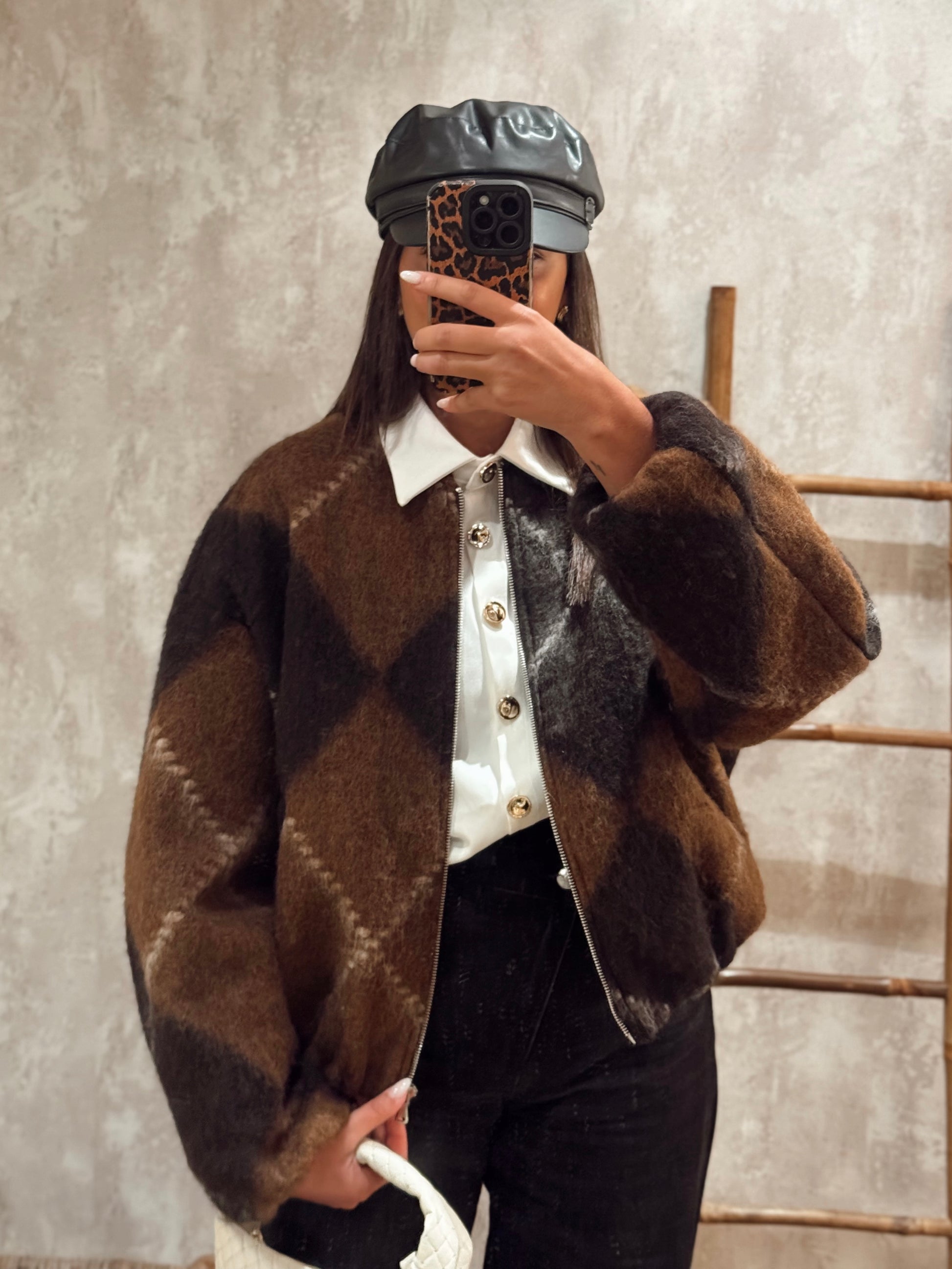 Um bomber super marcante, com o padrão geométrico nos tons de castanho que está em grande destaque este ano. O tecido tipo fazenda com pêlo cria um efeito abluado muito giro e uma textura que se nota ao vivo — aconchegante, suave e com aquele aspeto moderno que transforma qualquer look.