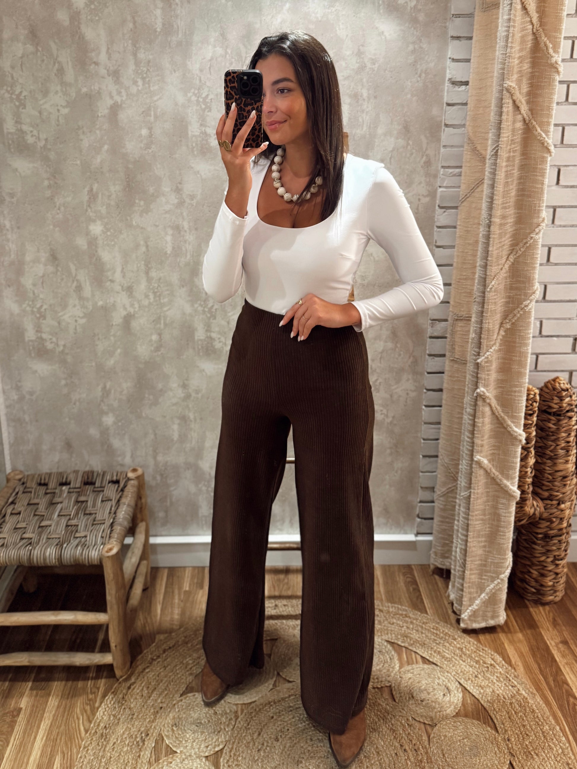 Calça pantalona bombazina aveludada, com um toque suave e elegante. O tecido aveludado confere sofisticação e conforto, enquanto o corte largo oferece liberdade de movimento e um look moderno.
