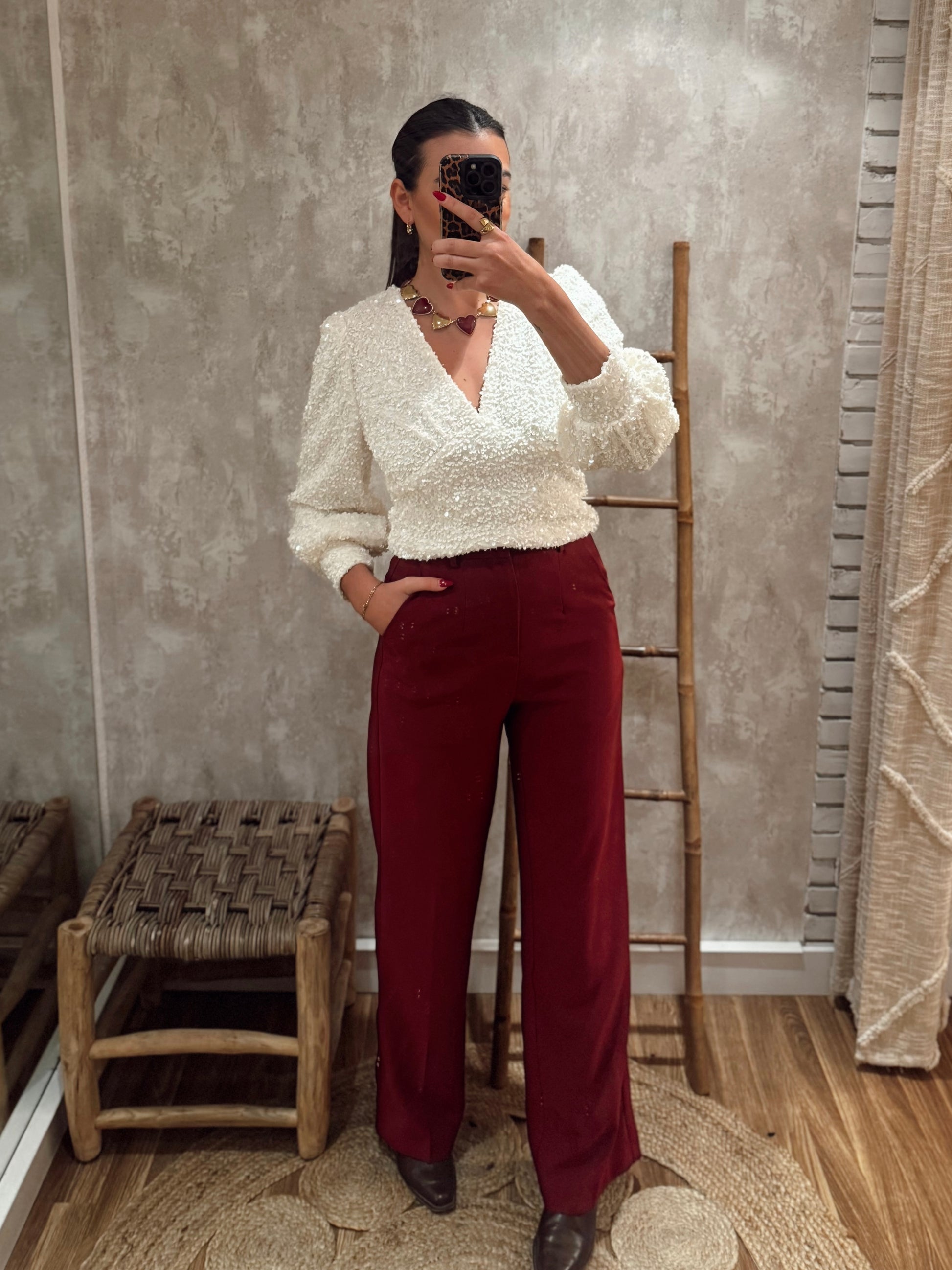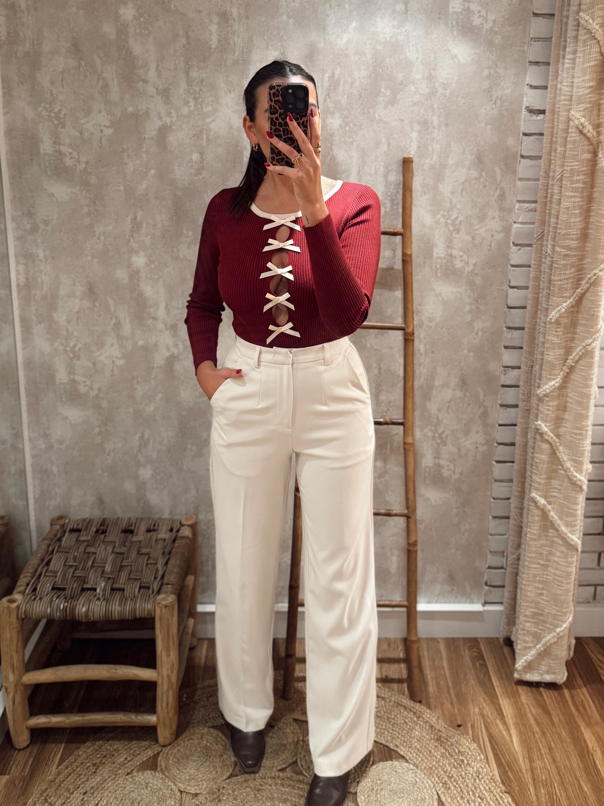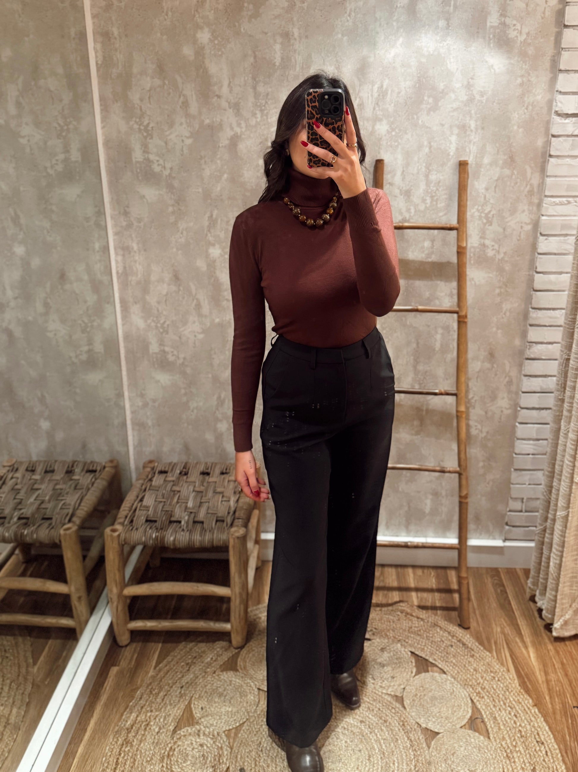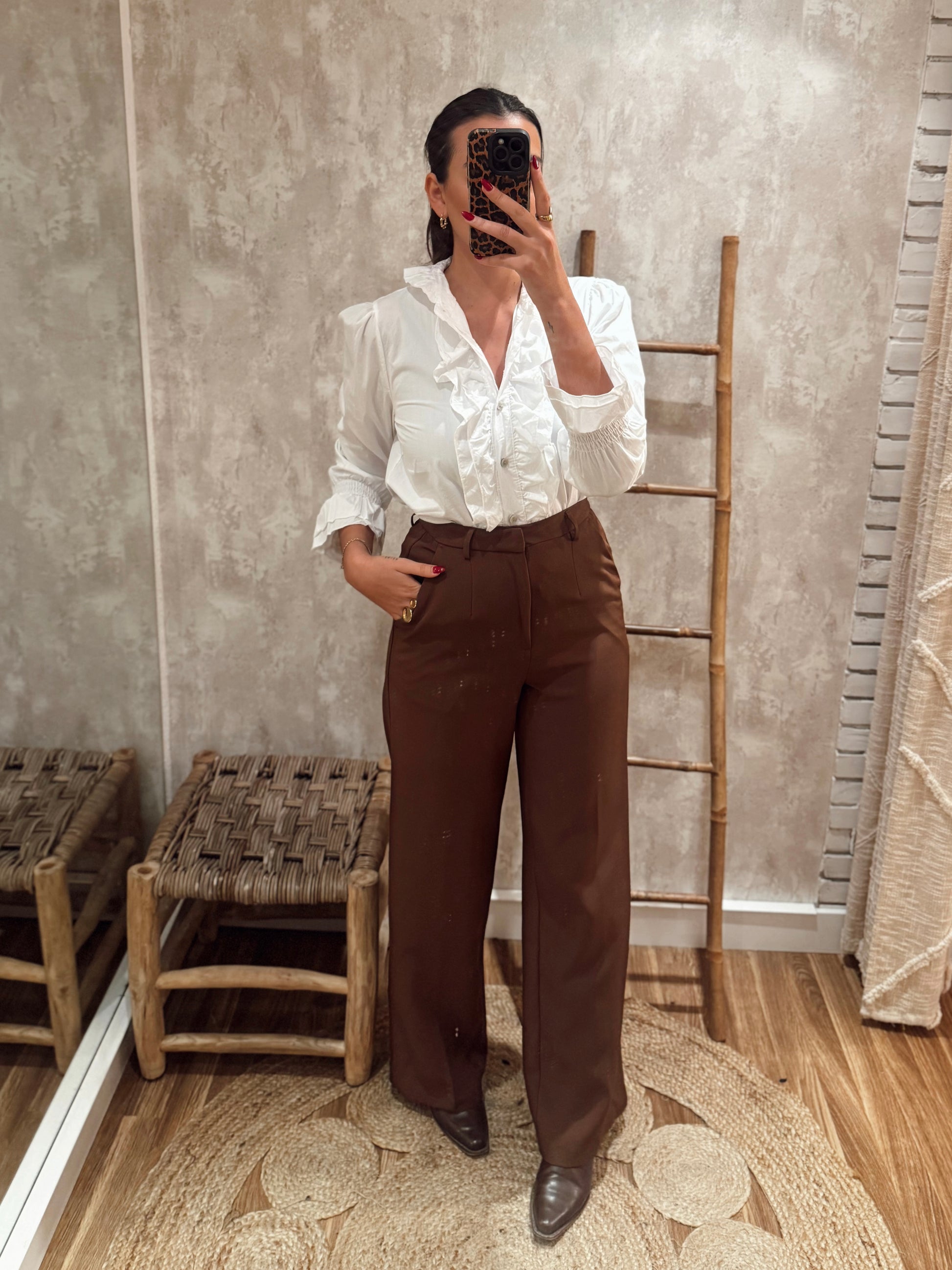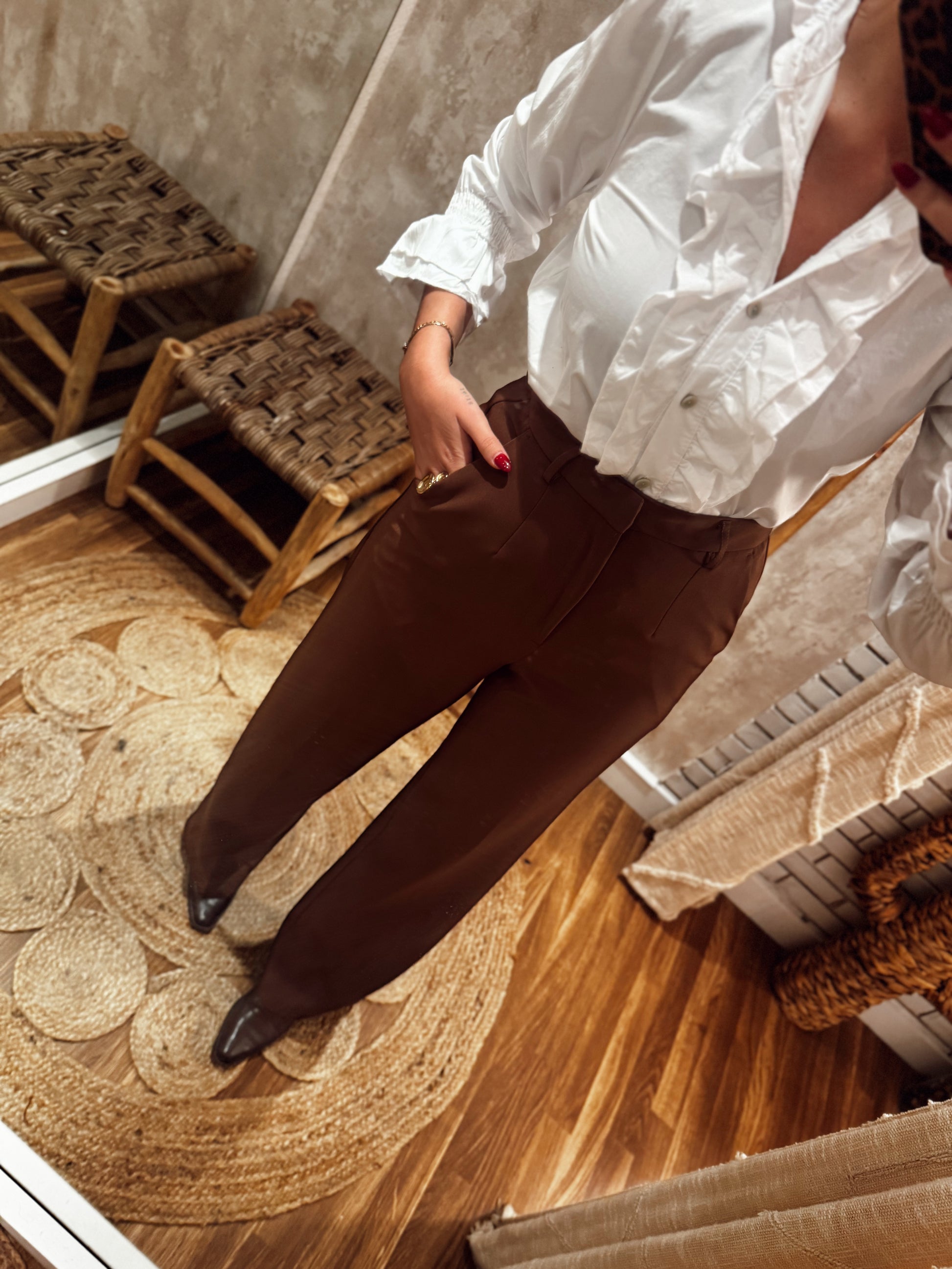 Calças de alfaiataria de cintura subida, com corte elegante e perna direita, pensadas para alongar a silhueta e criar um visual cuidado sem perder conforto. O tecido tem boa estrutura, assenta bem no corpo e mantém o formato ao longo do dia. Possuem bolsos laterais funcionais e um acabamento limpo, tornando-as uma peça versátil tanto para looks mais clássicos como para combinações descontraídas com malha ou blusas mais fluídas.