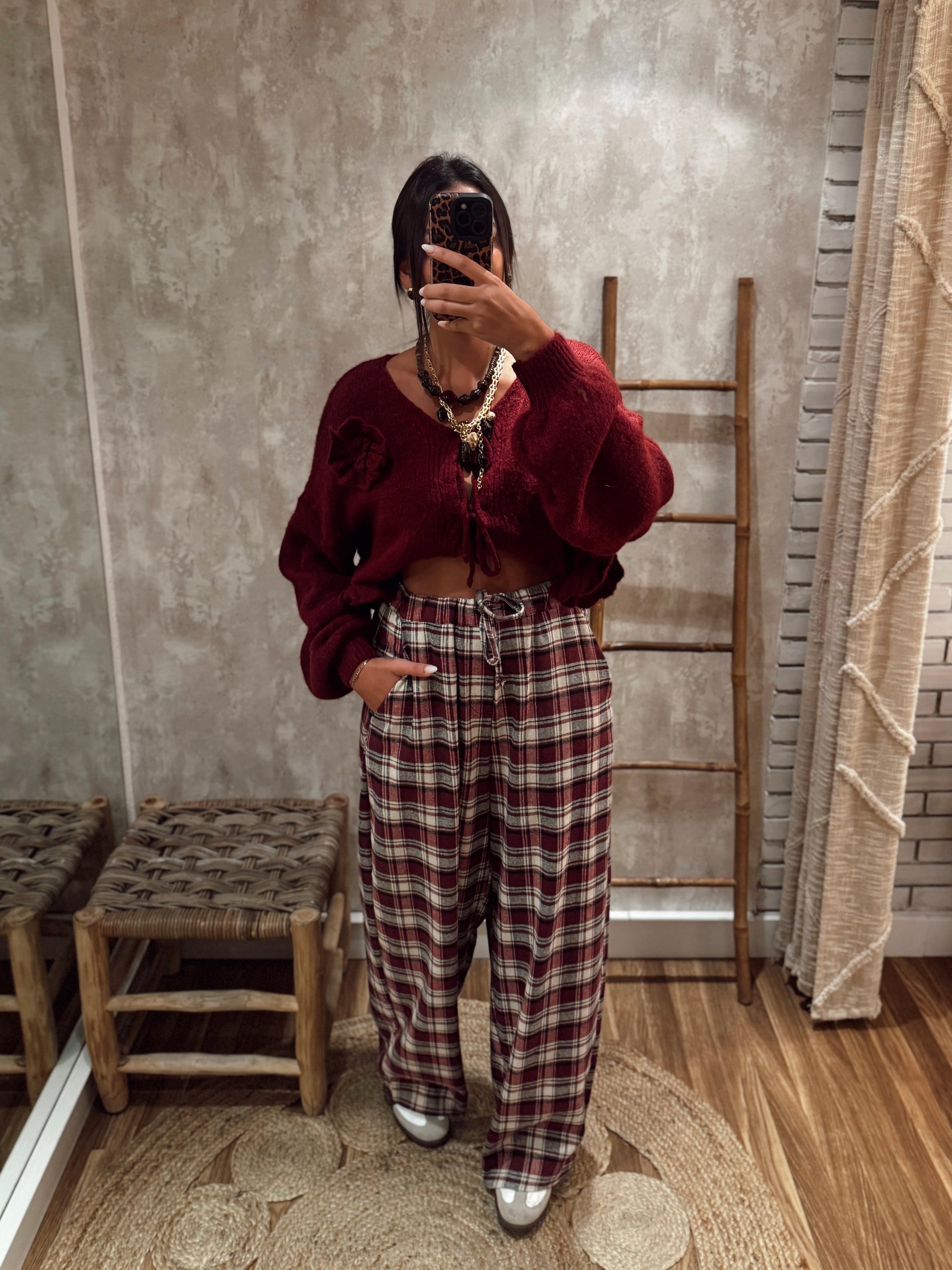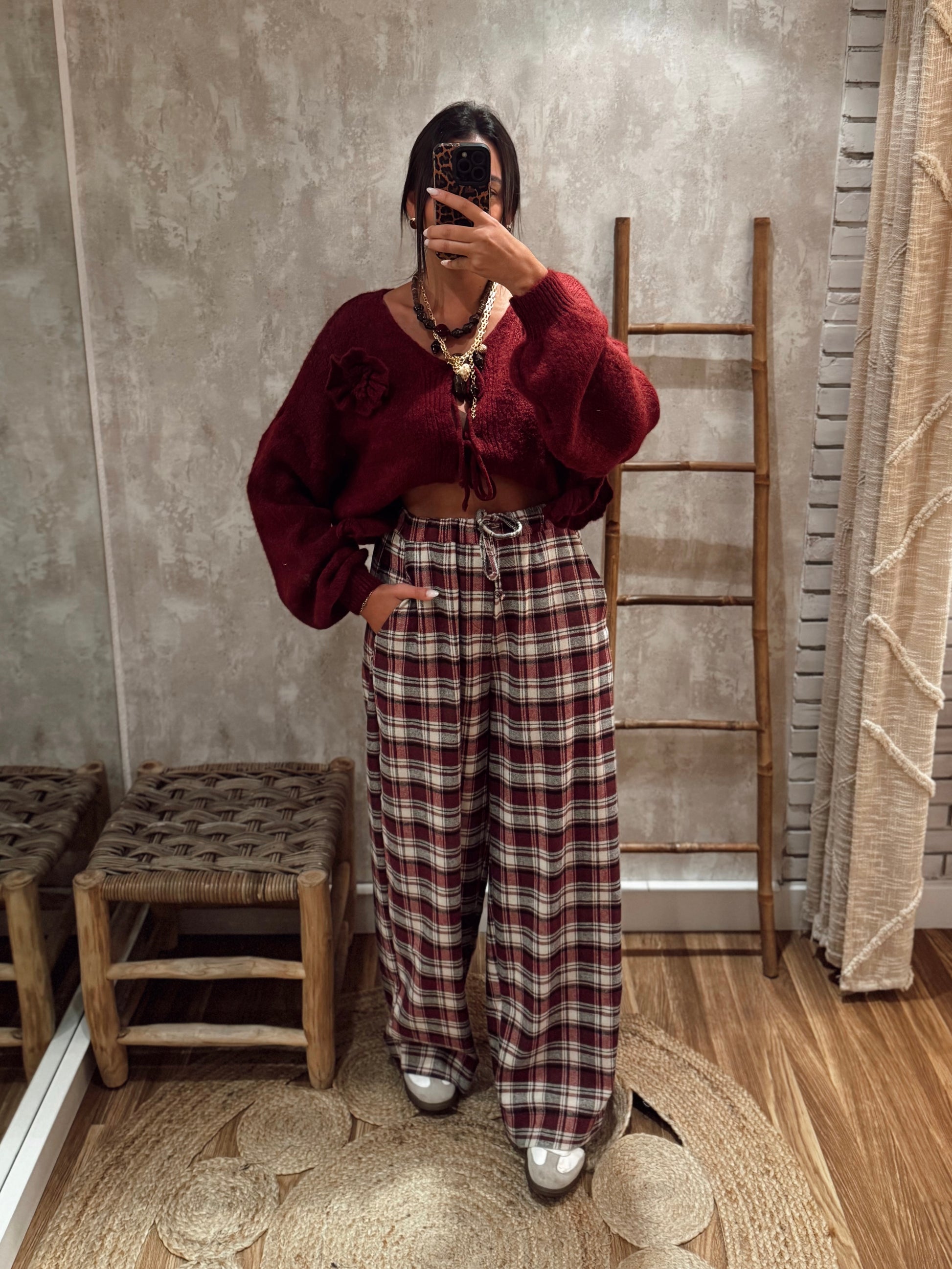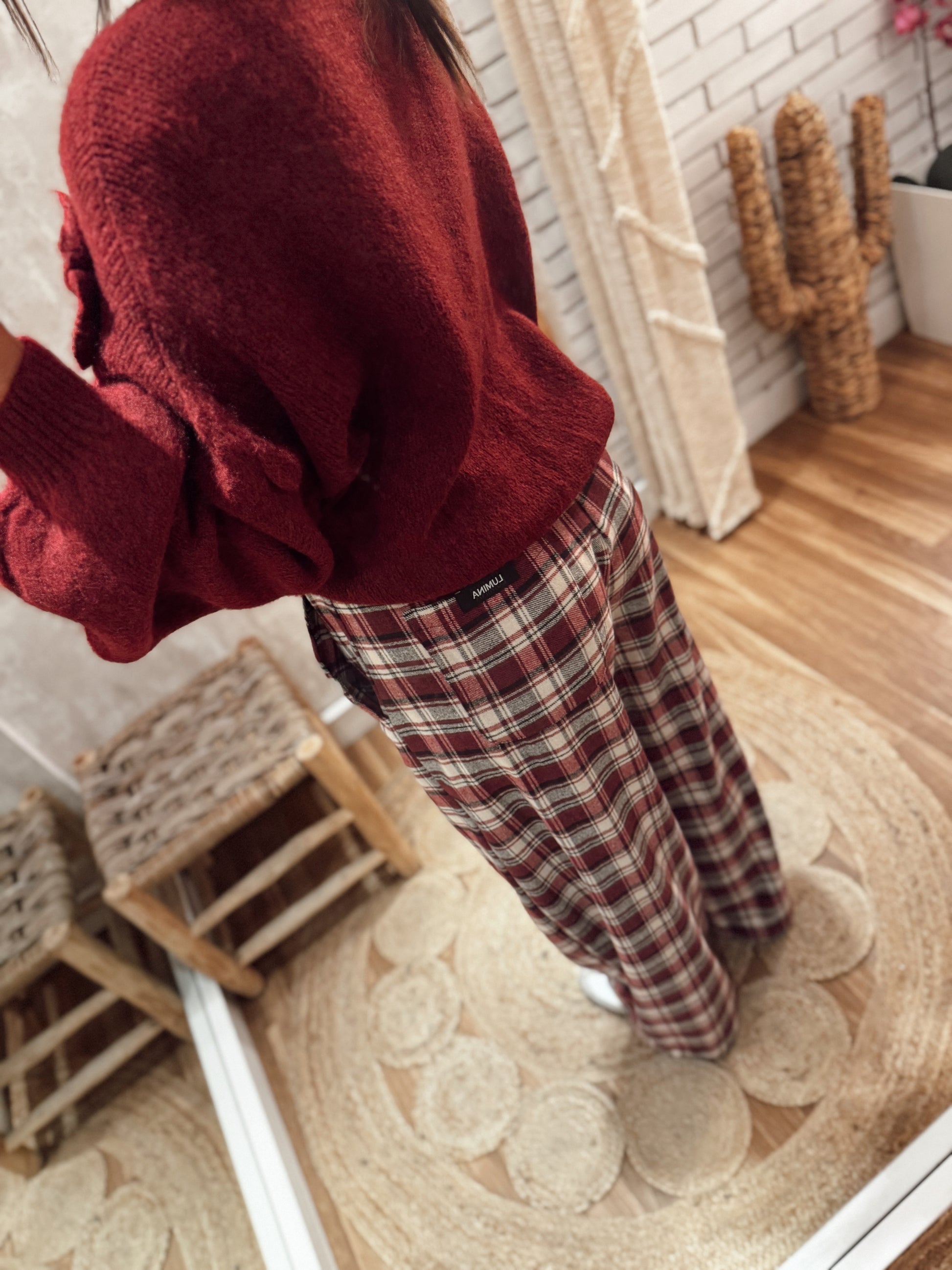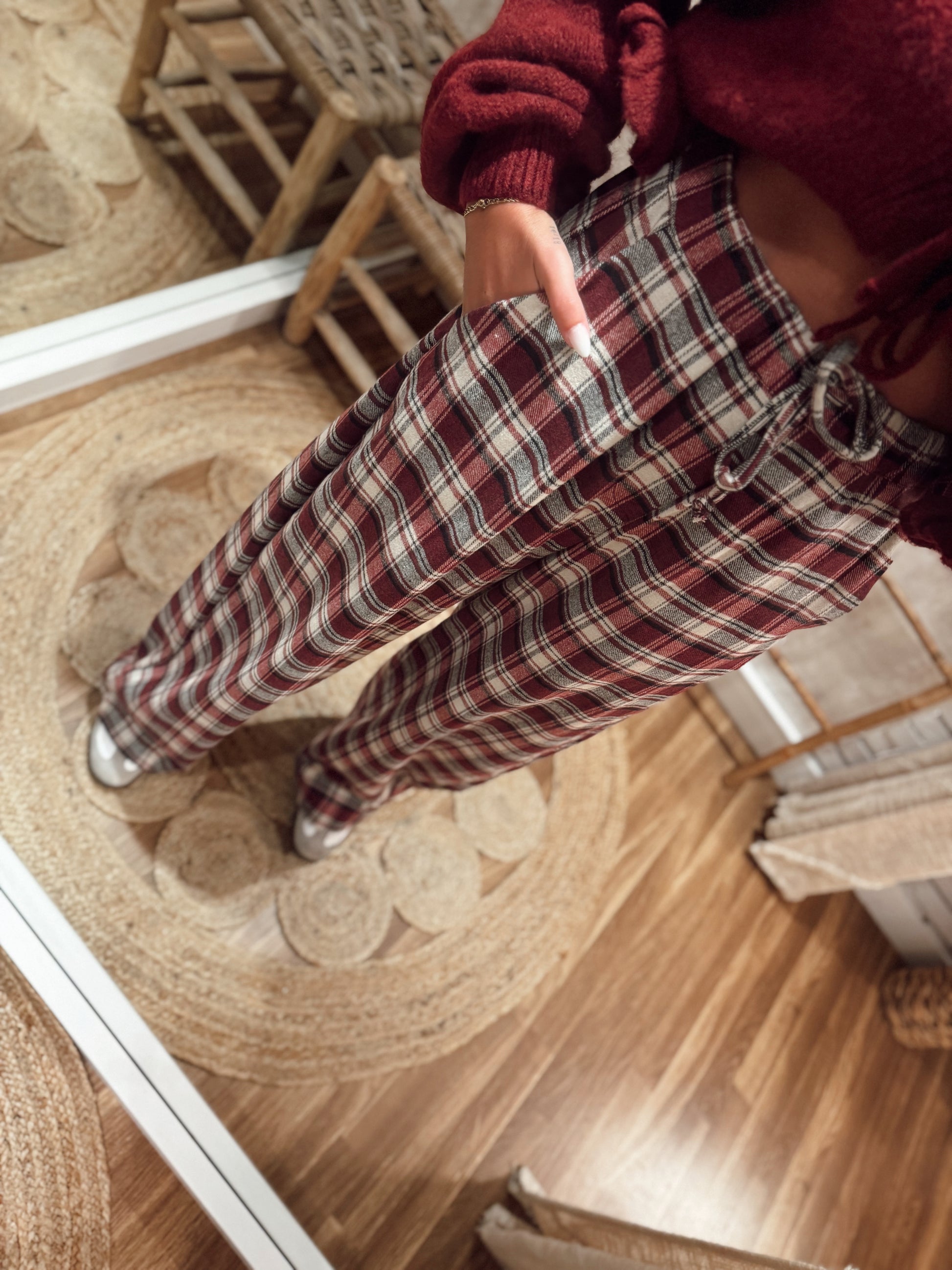 Calças da Lumina em padrão xadrez bordeaux, super tendência e com aquele ar cool que dá logo personalidade ao look. O tecido é macio e quentinho, com toque tipo flanela — perfeito para esta altura do ano e para quem privilegia conforto sem perder estilo.