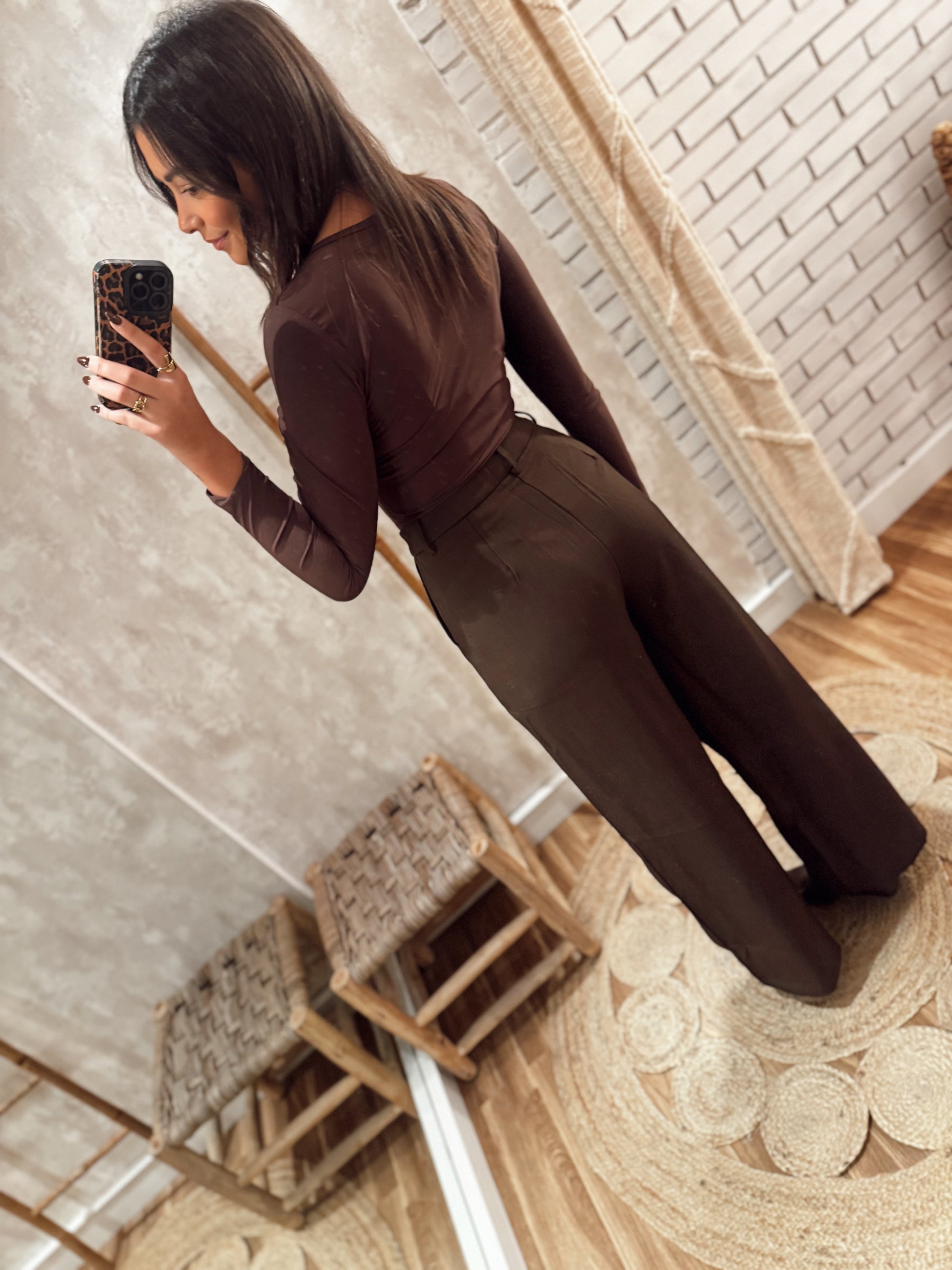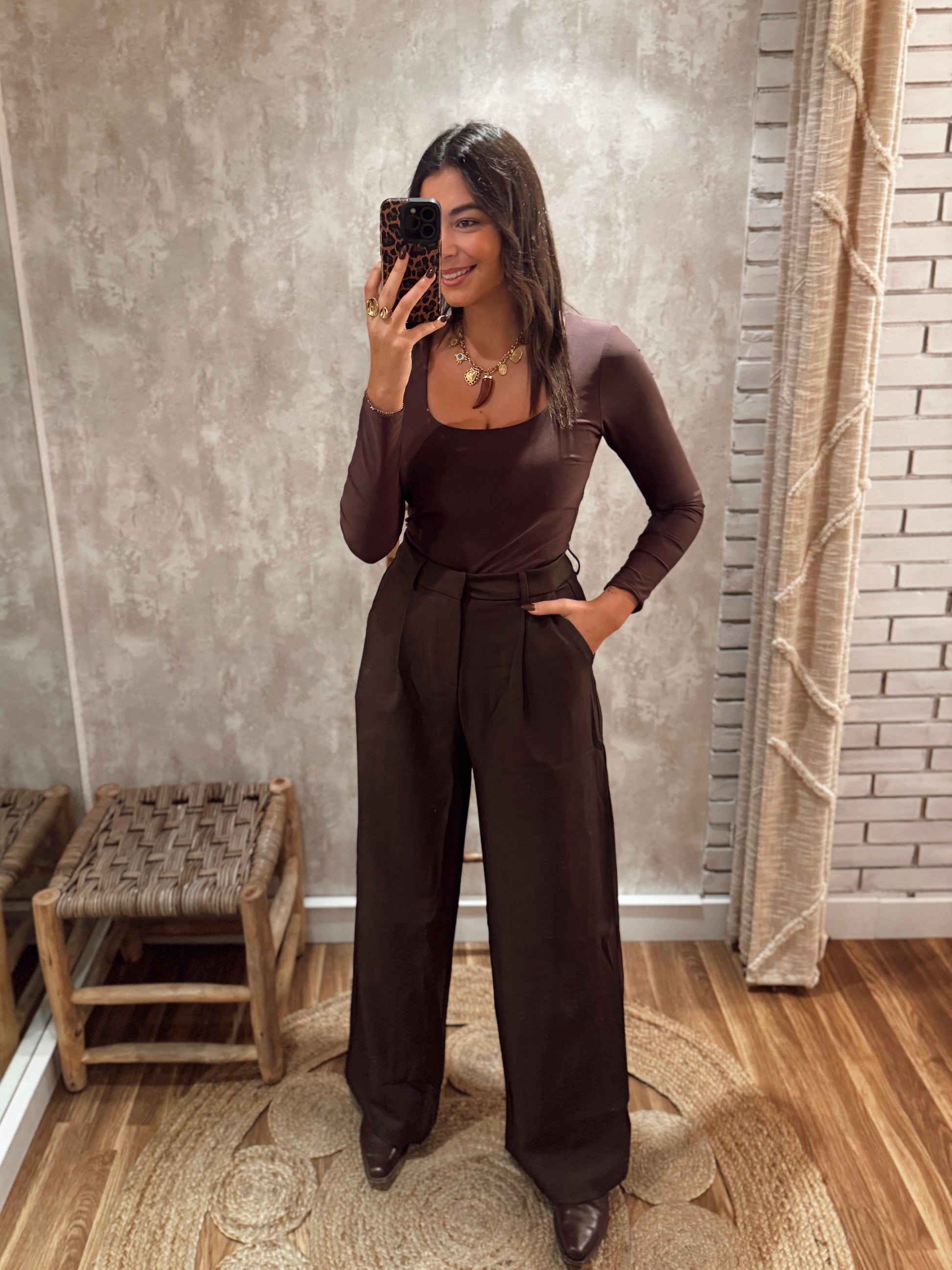 Calças de alfaiataria castanhas, com cintura subida, bolsos laterais e perna larga que alonga a silhueta e confere um toque elegante e moderno.