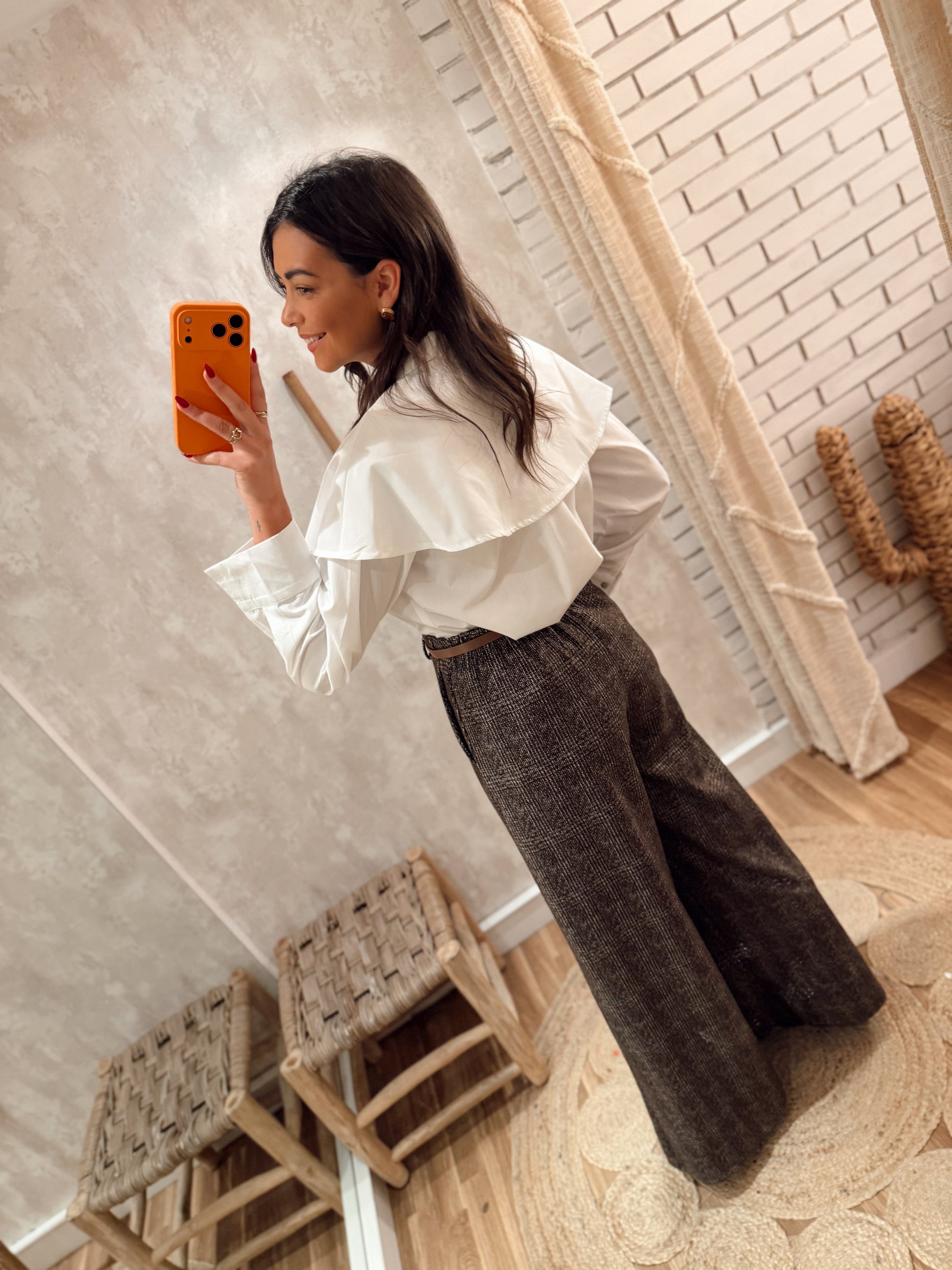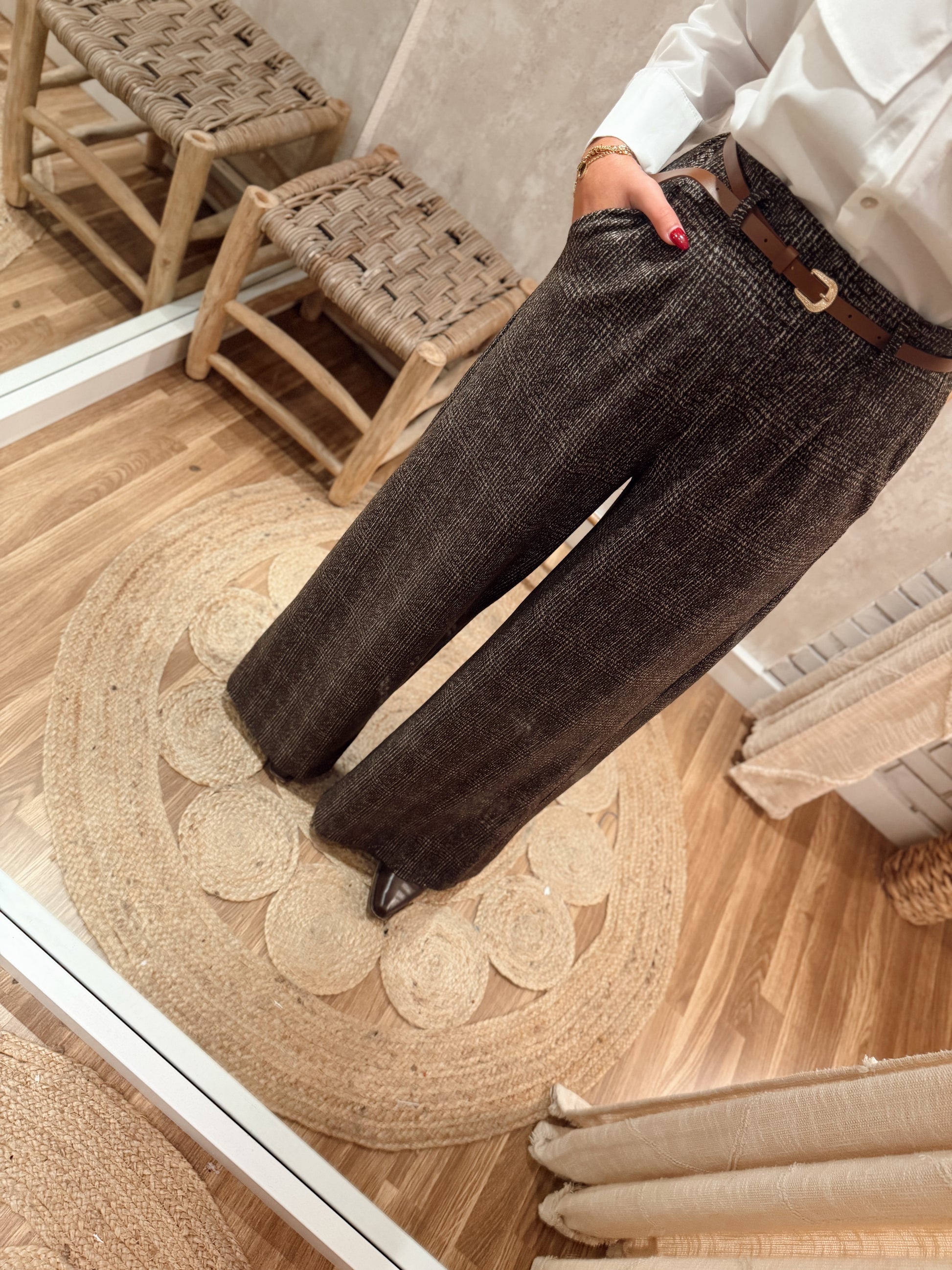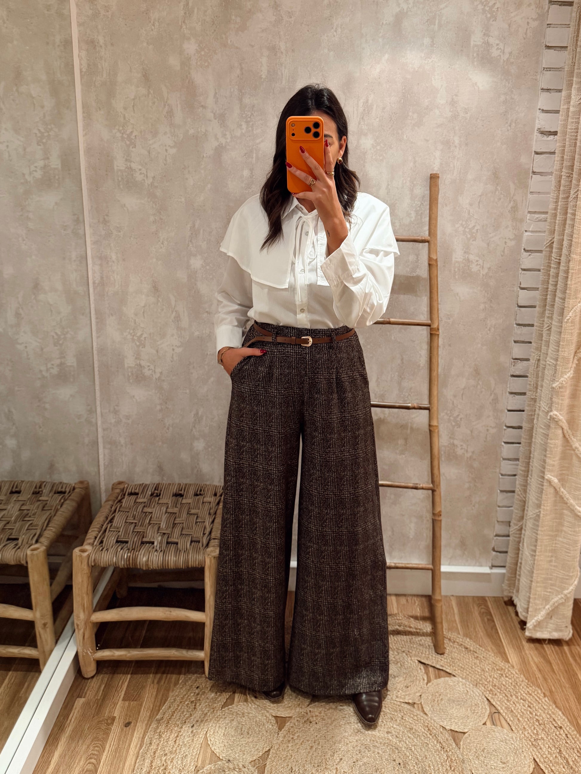 Calças de perna larga, em padrão xadrez nos tons de castanho e bege. Confeccionadas em tecido grosso e quentinho, oferecem conforto e estrutura ao mesmo tempo. Modelo de cintura subida, com bolsos laterais, ideal para criar looks elegantes e aconchegantes nos dias mais frios.