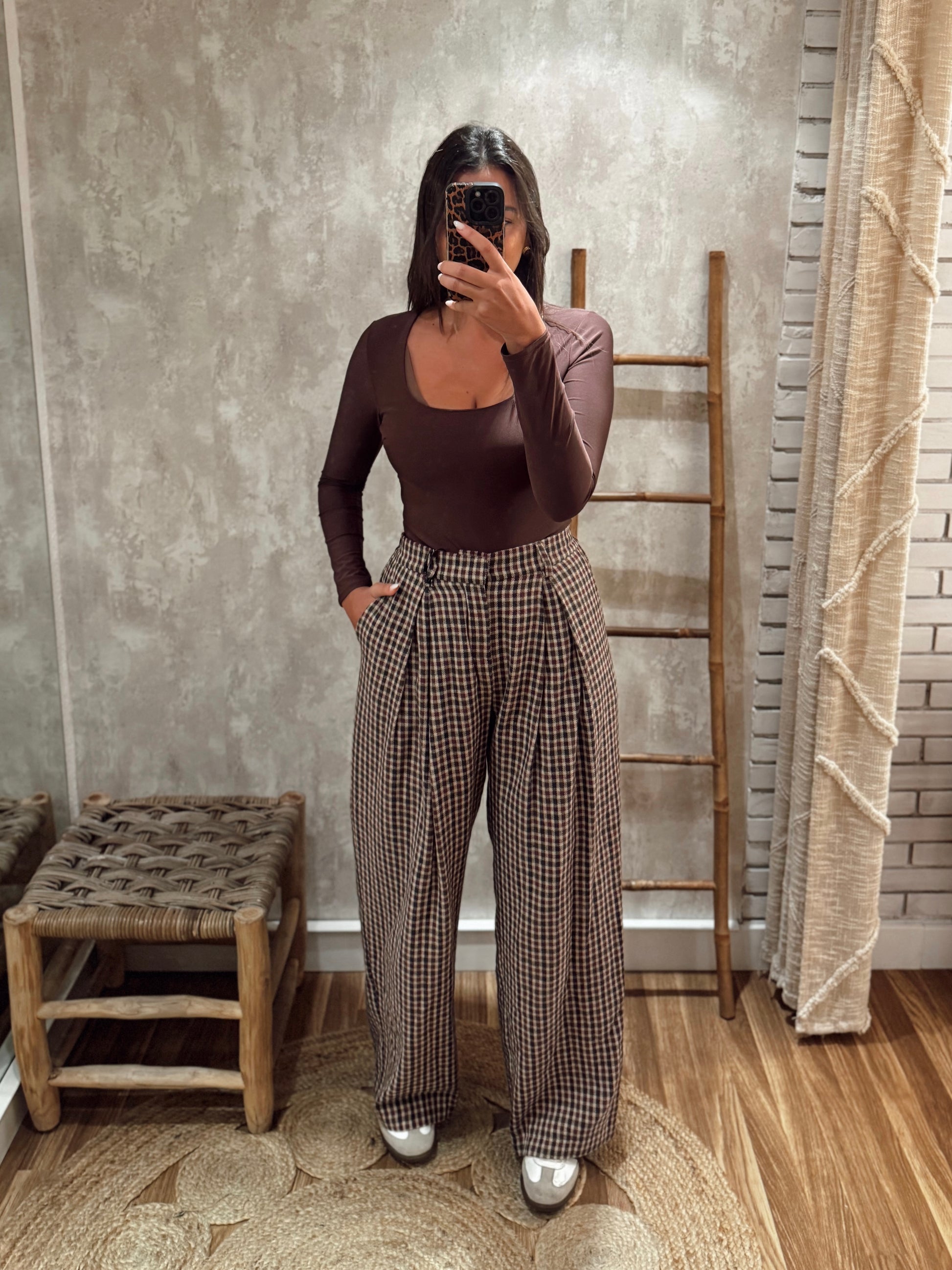 Calças Lumina em padrão xadrez pequeno, com tons bordeaux e castanhos, em tecido grosso e quentinho tipo “flannel wool blend”.