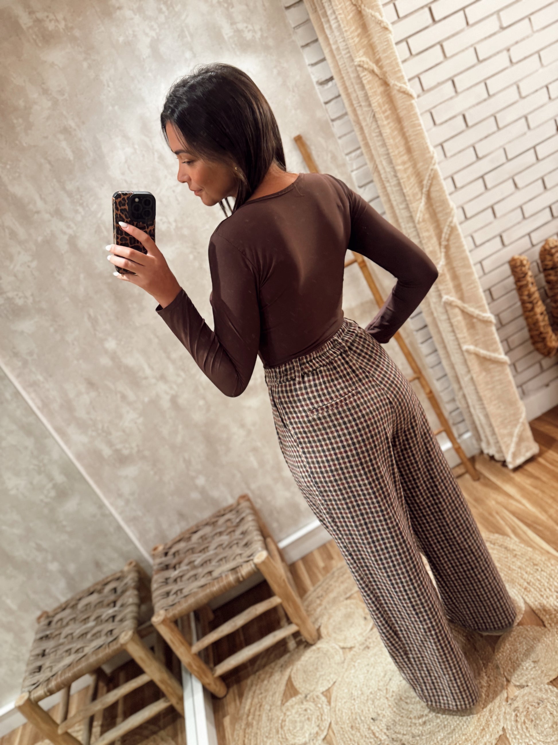 Estas calças têm aquele padrão xadrez em miniatura que está super em alta e combina lindamente com os tons da estação. O tecido é encorpado, macio e com toque quente — semelhante a uma mistura de lã estilo flanela, ideal para dias frios sem abdicar do conforto.