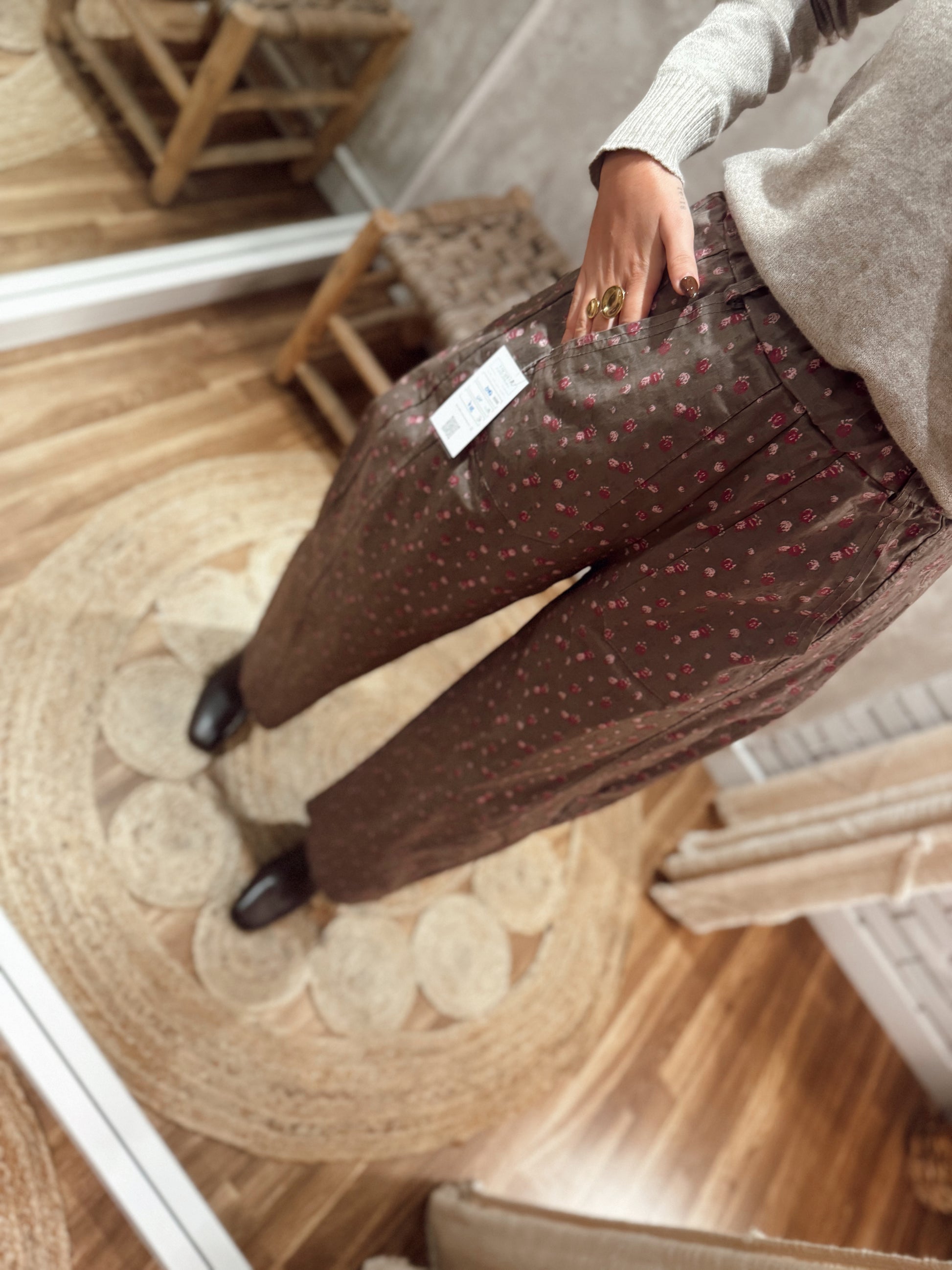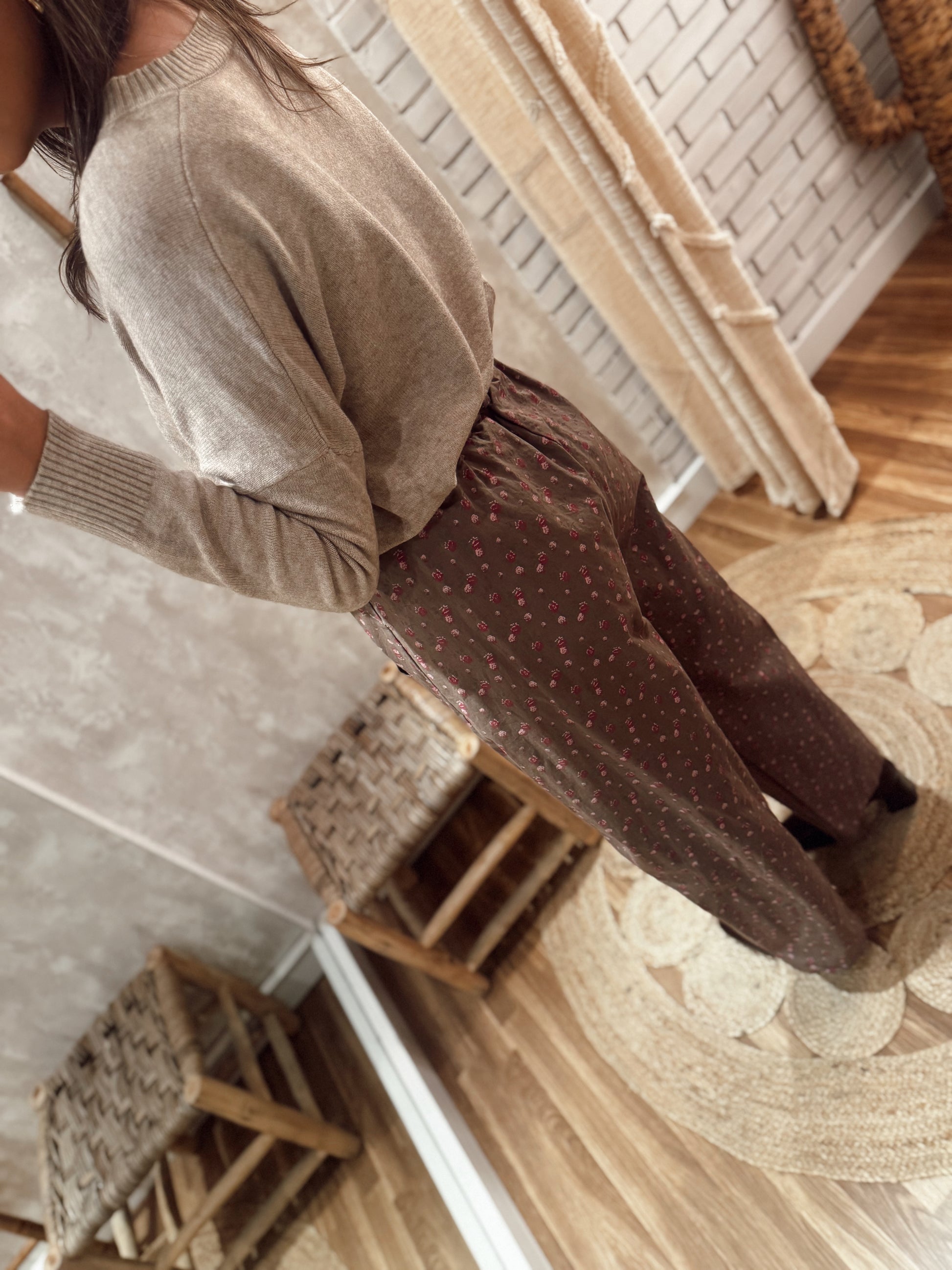 Calças modelo Balloon em tecido de sarja leve, com padrão floral minimalista, disponíveis em fundo branco e fundo castanho.