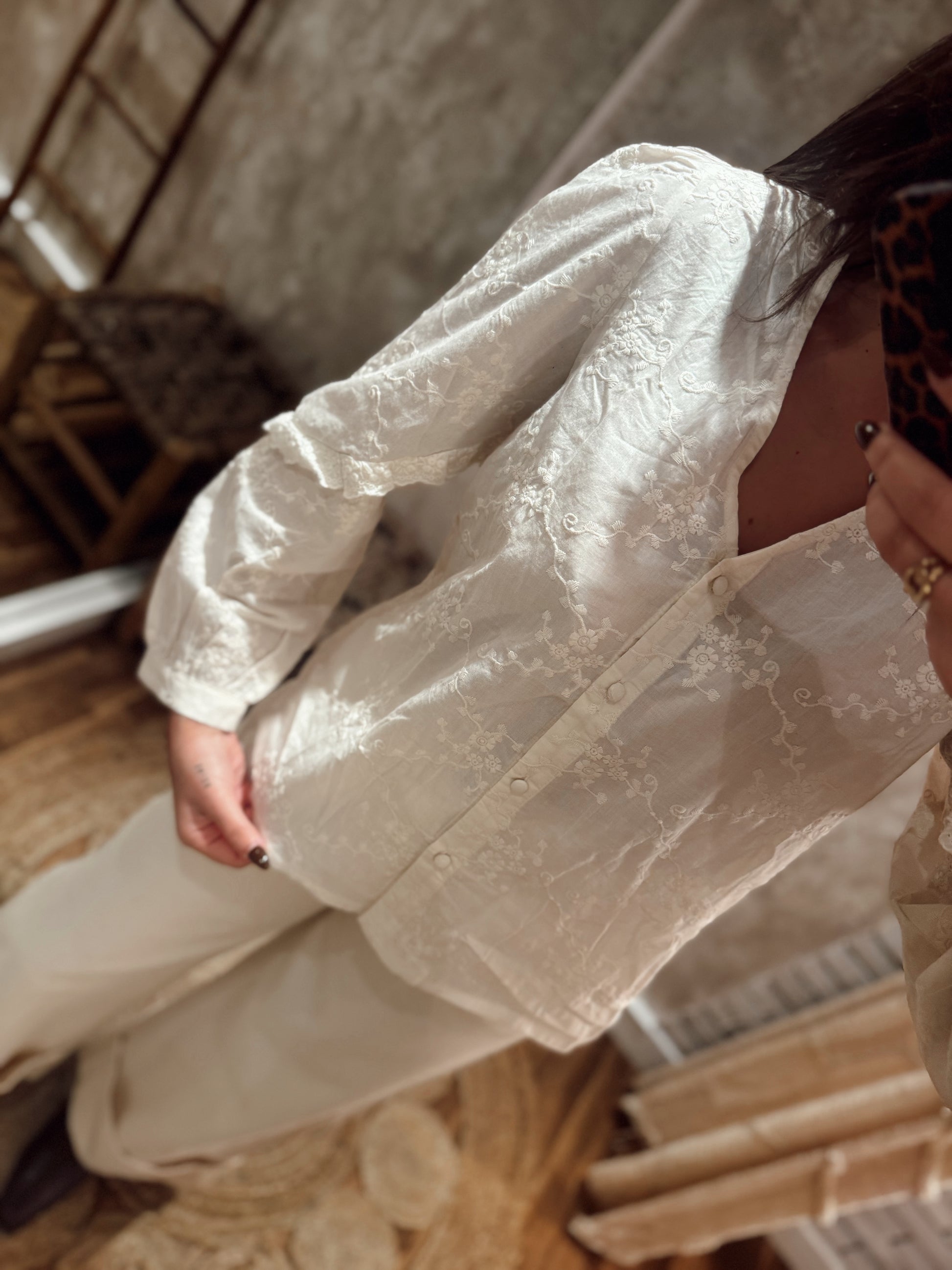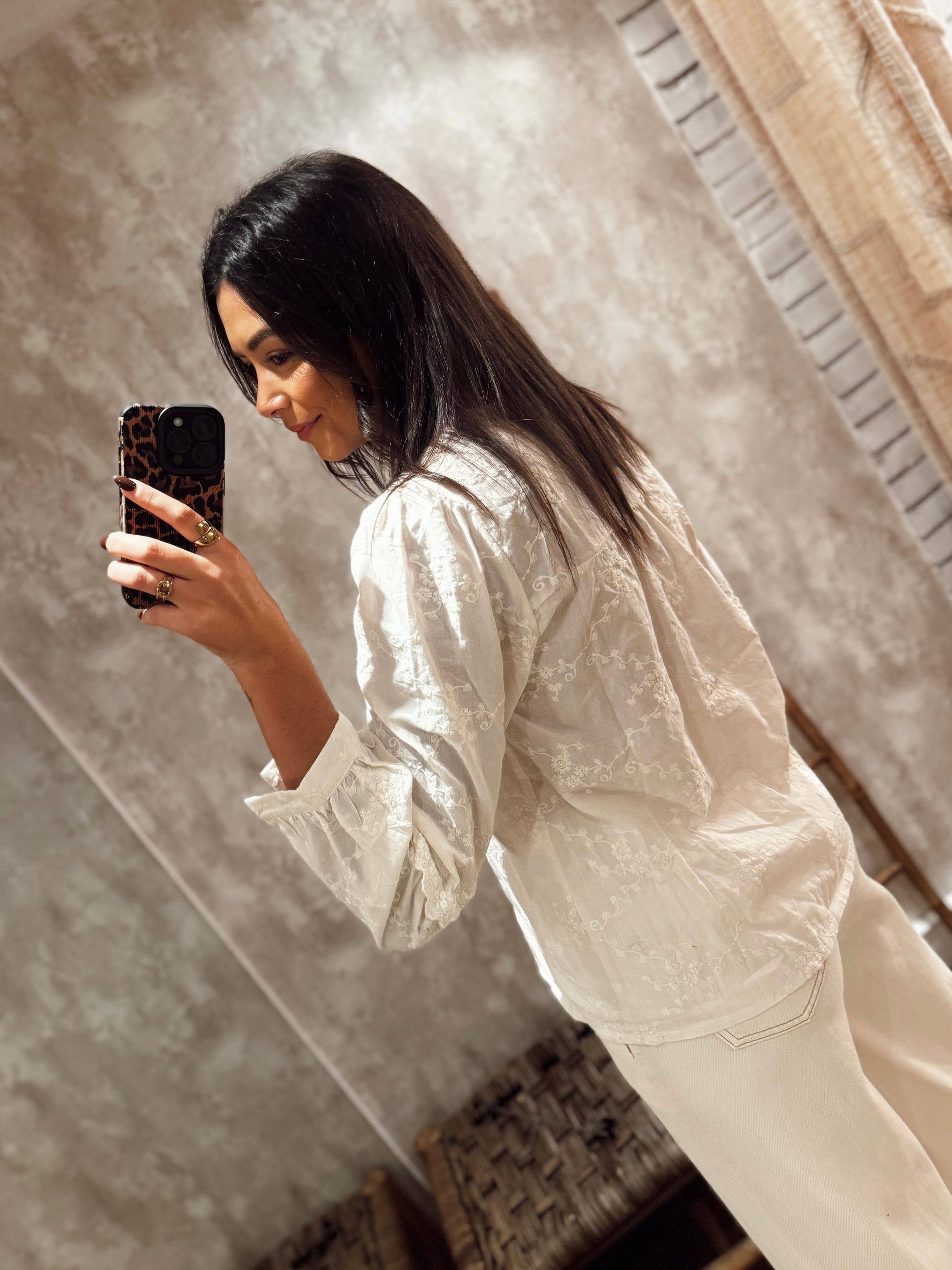 Camisa em tecido leve com delicado bordado floral, num modelo sem colarinho que lhe dá um toque romântico e moderno.