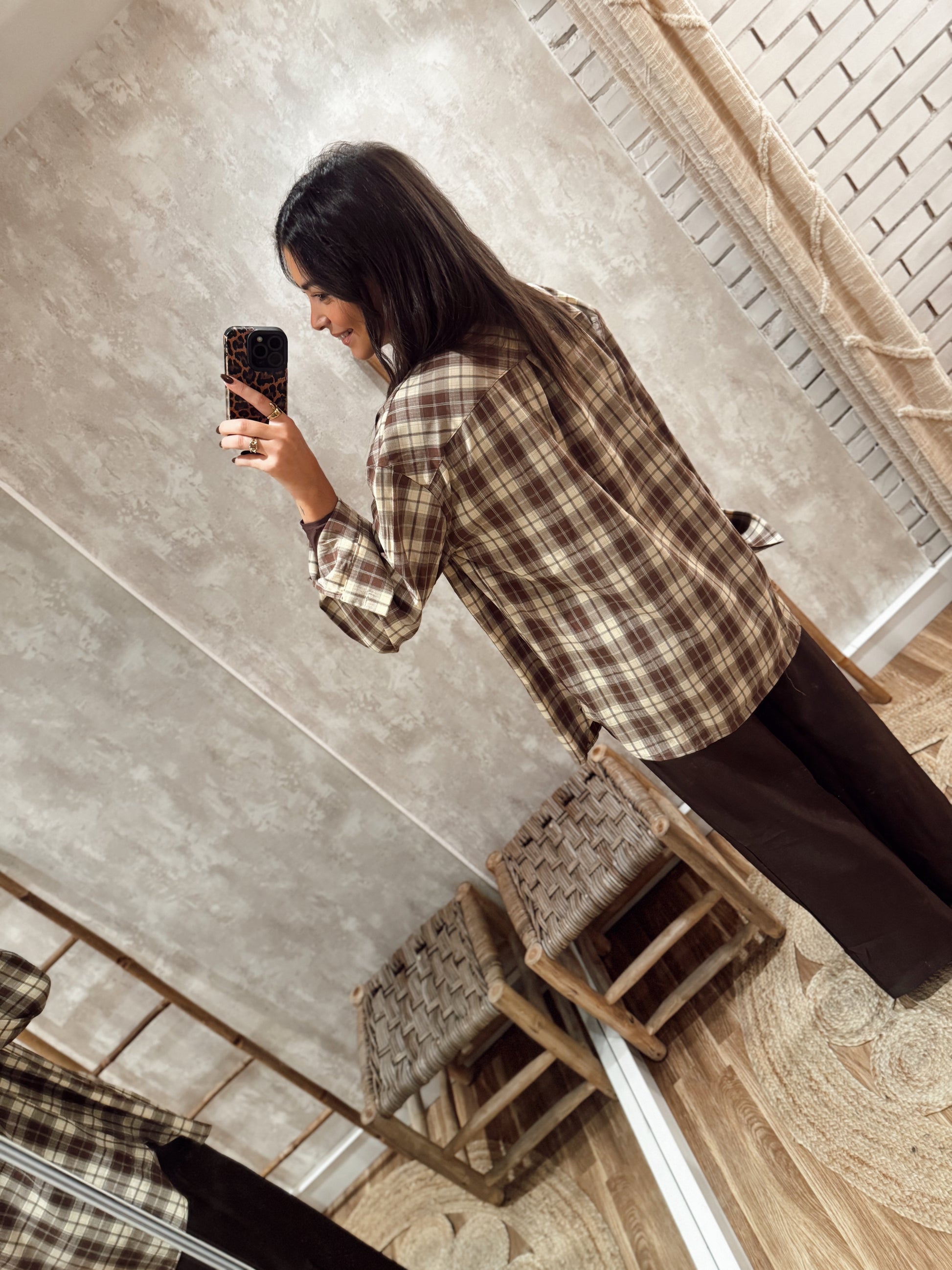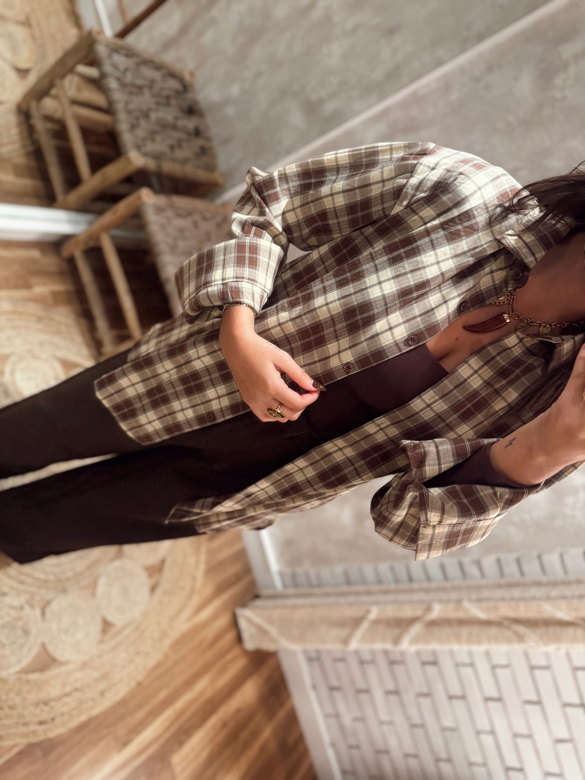 Camisa em tecido leve e suave, com padrão xadrez e corte reto, perfeita para um look casual e descontraído.