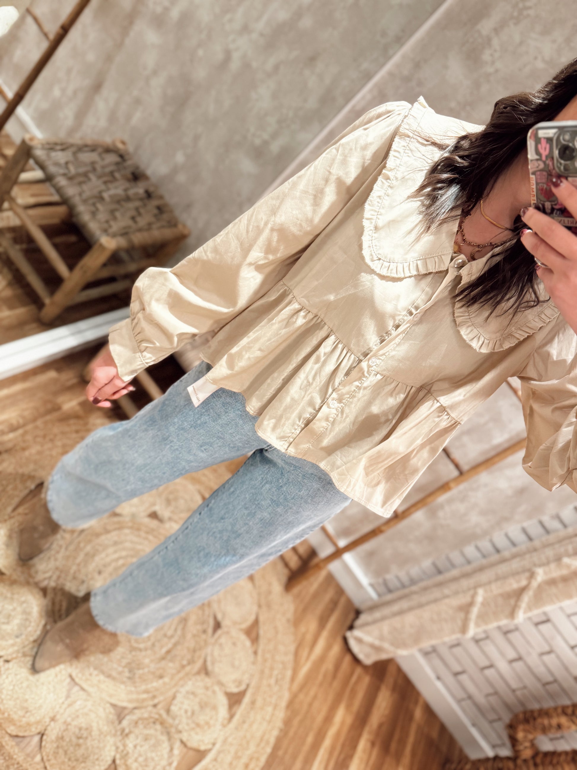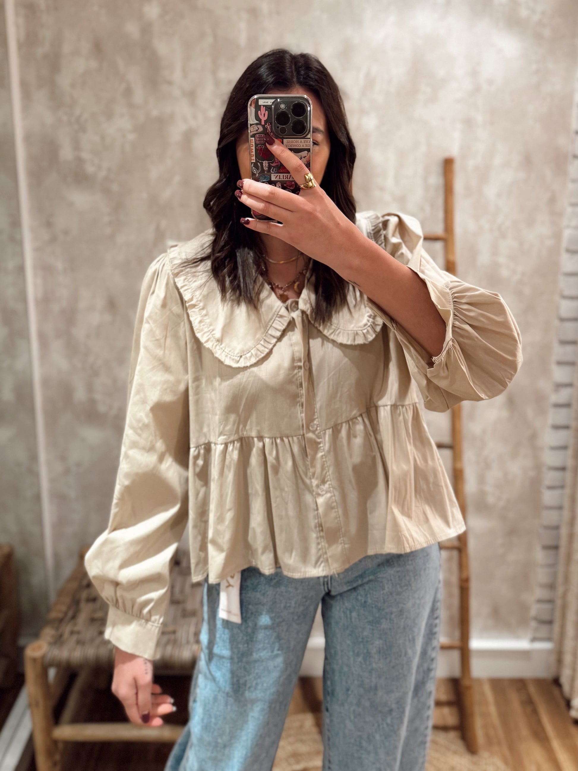 Camiseiro em poplina, com gola babete e detalhe de folho na barra. Modelo elegante, com mangas estilo balão para um toque sofisticado. Disponível em bege.
