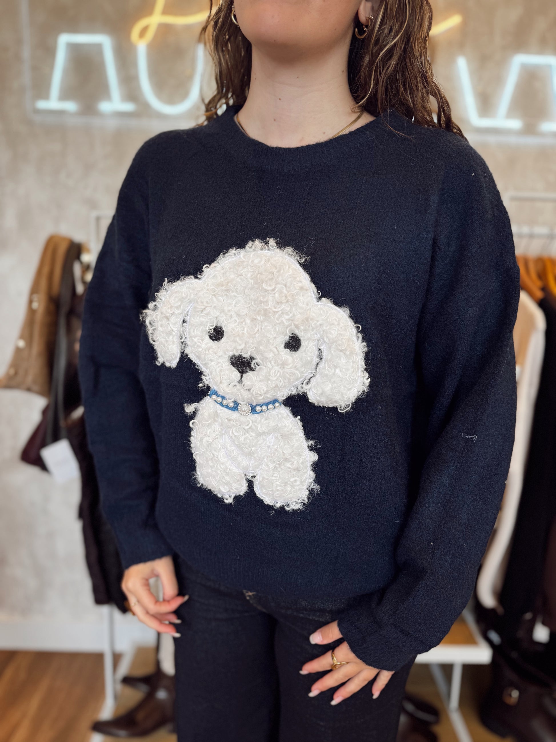 Camisola de malha macia com aplicação em relevo de pêlo na parte da frente, formando um cão super fofo e detalhado. O pormenor do colar com pérolas adiciona um toque especial e divertido à peça. Corte confortável, perfeita para looks quentinhos do dia-a-dia.