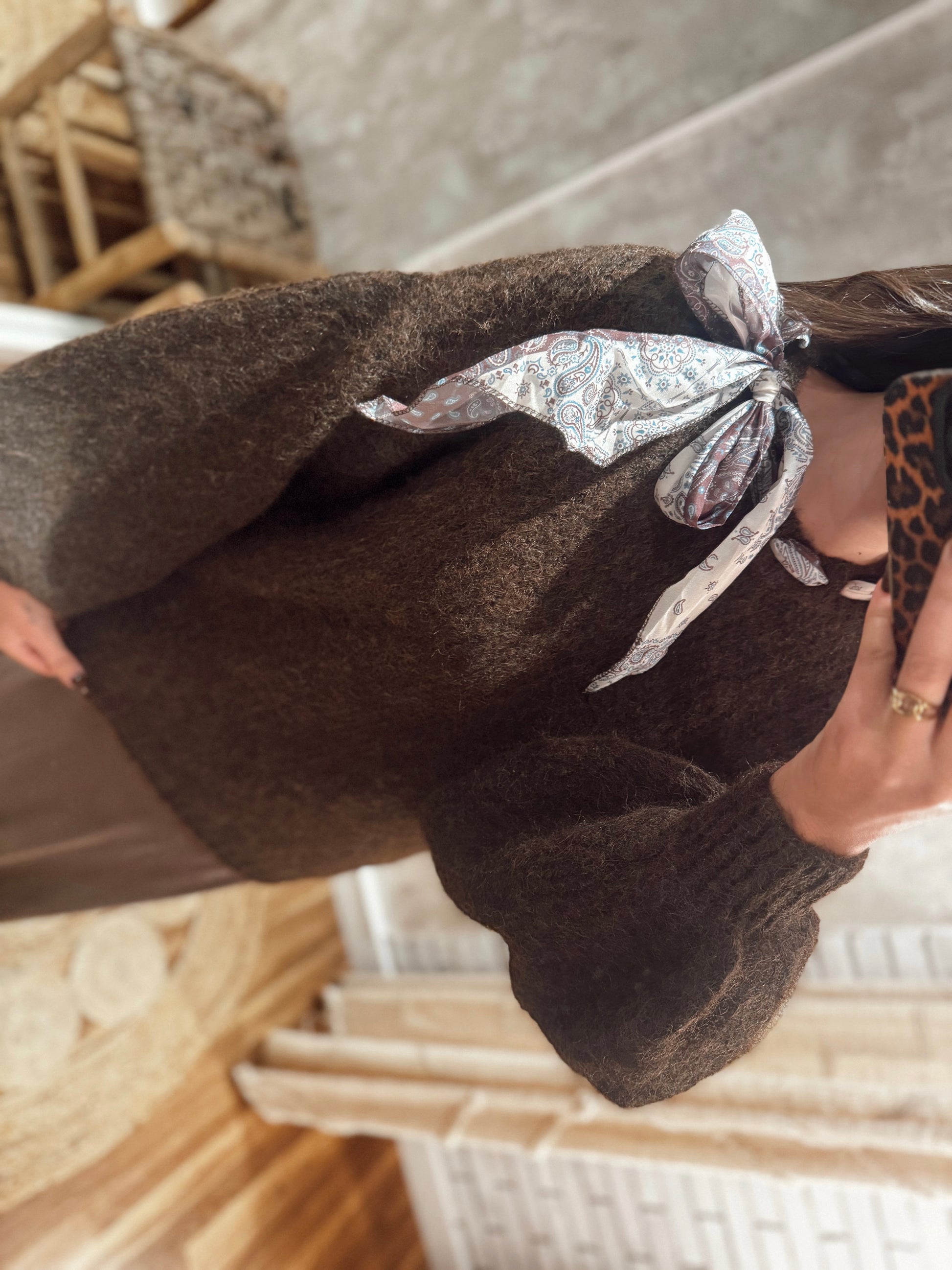 O destaque vai para o lenço acetinado incorporado na gola, um detalhe elegante que torna a peça ainda mais especial.