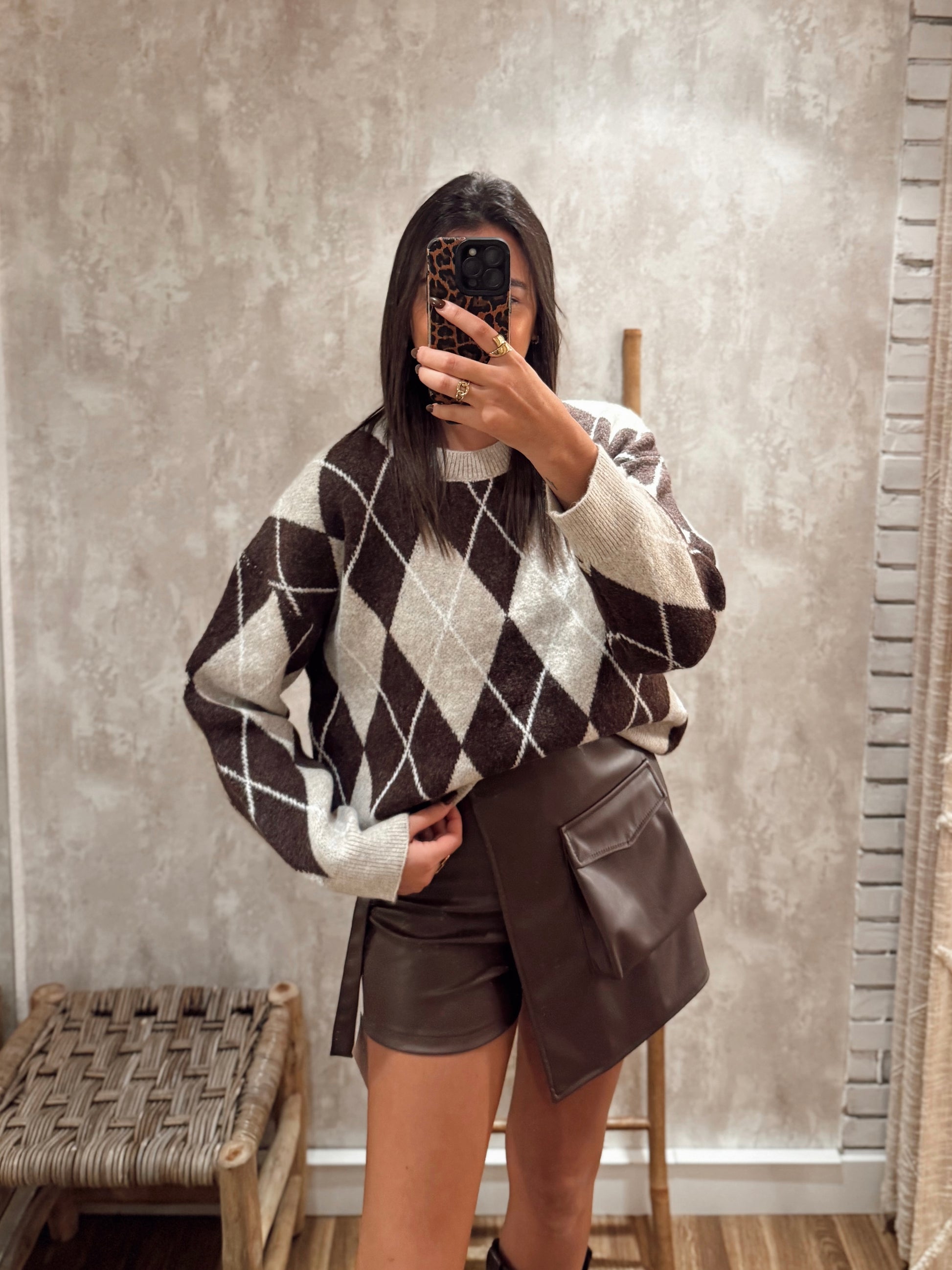 Camisola de malha macia com padrão losango em tons de castanho e bege, um clássico intemporal que adiciona um toque preppy ao look. Modelo confortável, de corte ligeiramente descontraído e gola redonda. Perfeita para combinar com saias, calções ou jeans, criando visuais cheios de estilo.