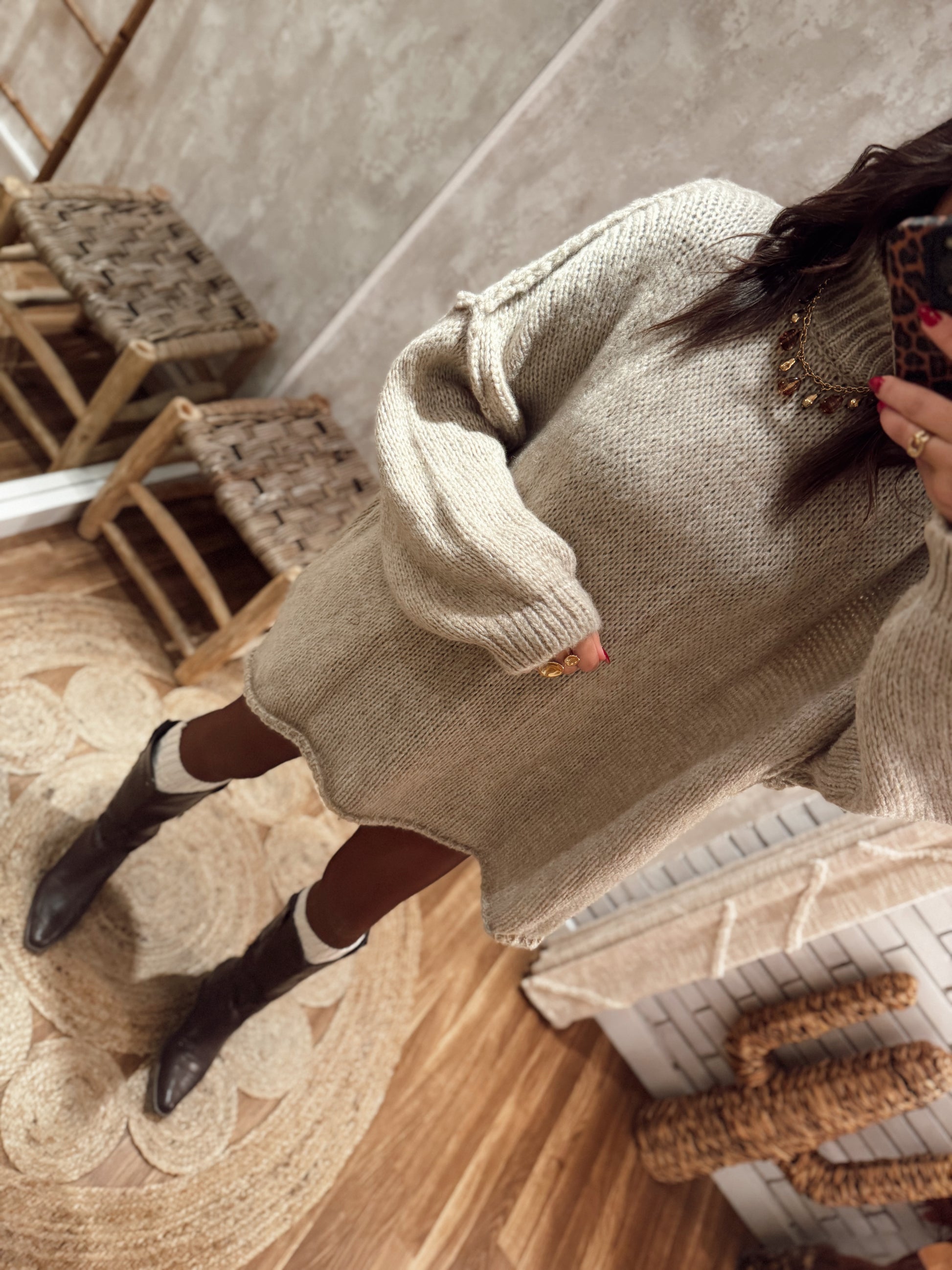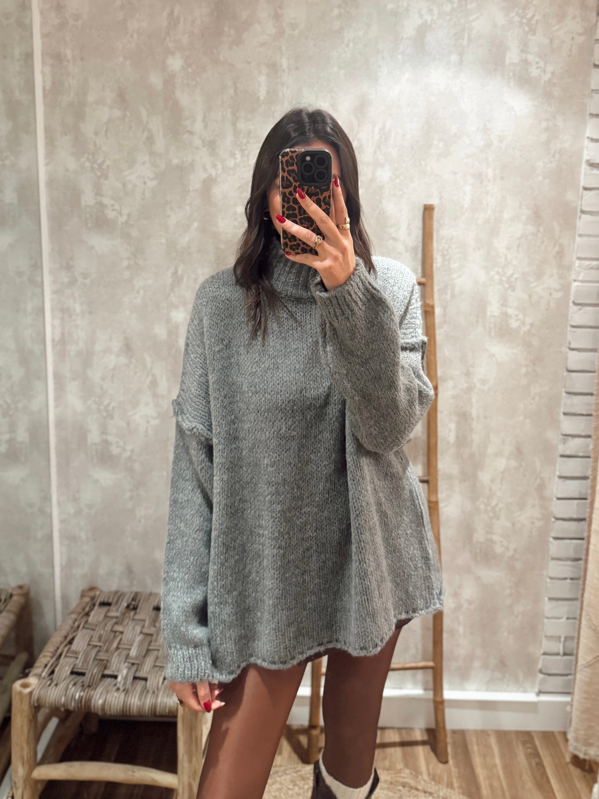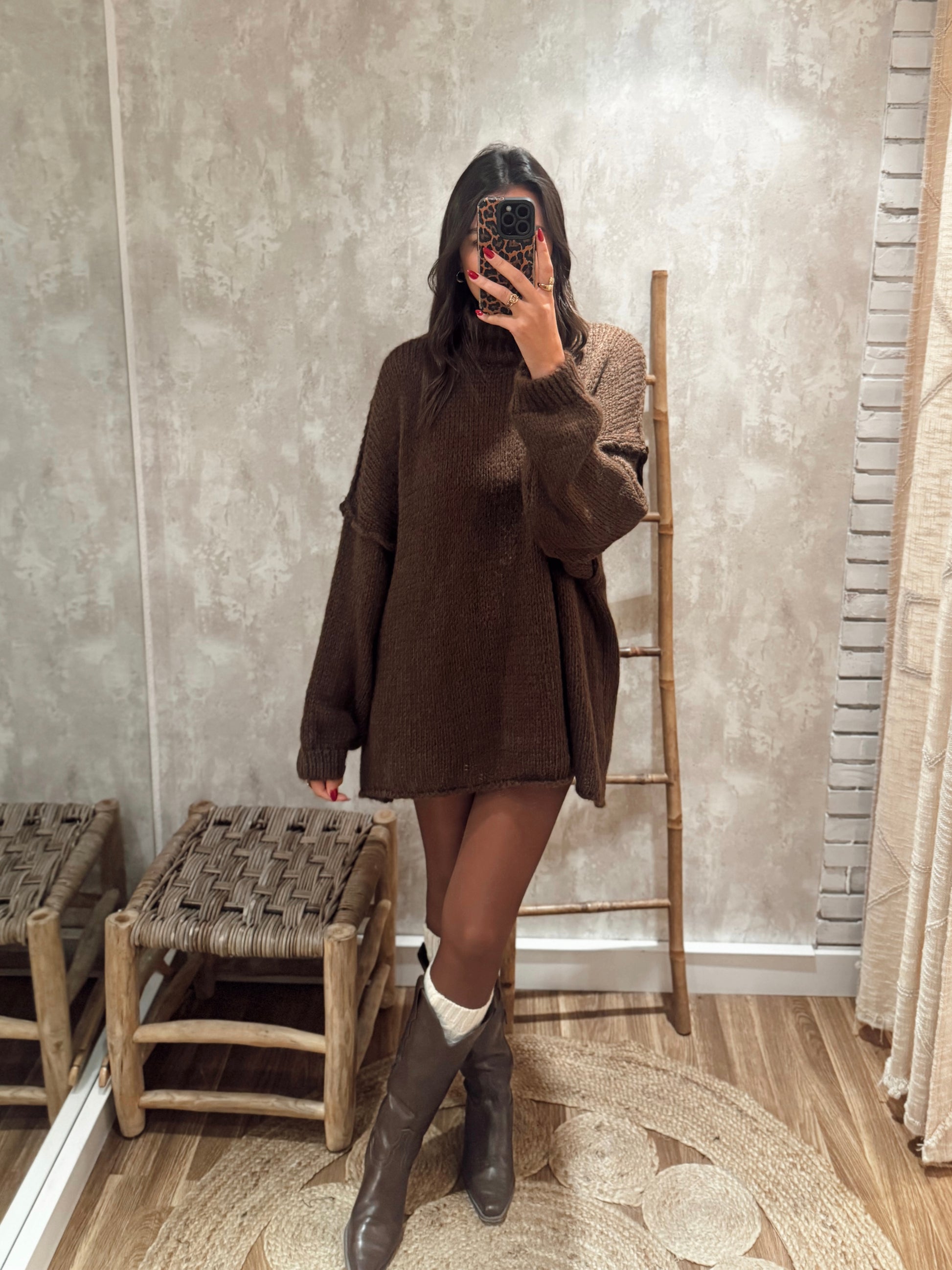 Camisolão em malha de corte amplo, comprido ao ponto de poder ser usado como vestido. Tem gola alta, manga larga e aquele ar cosy ideal para dias frios sem perder estilo.