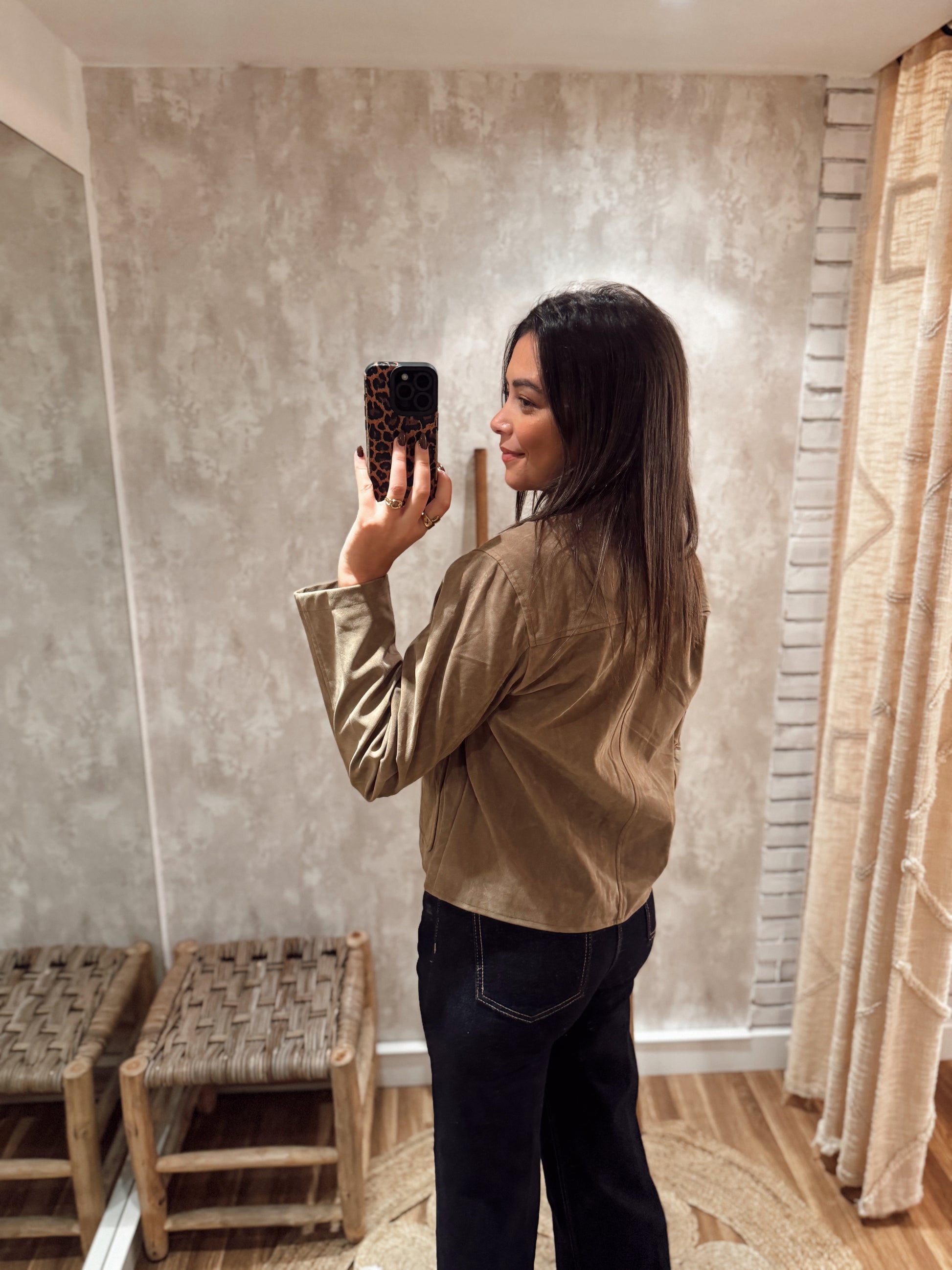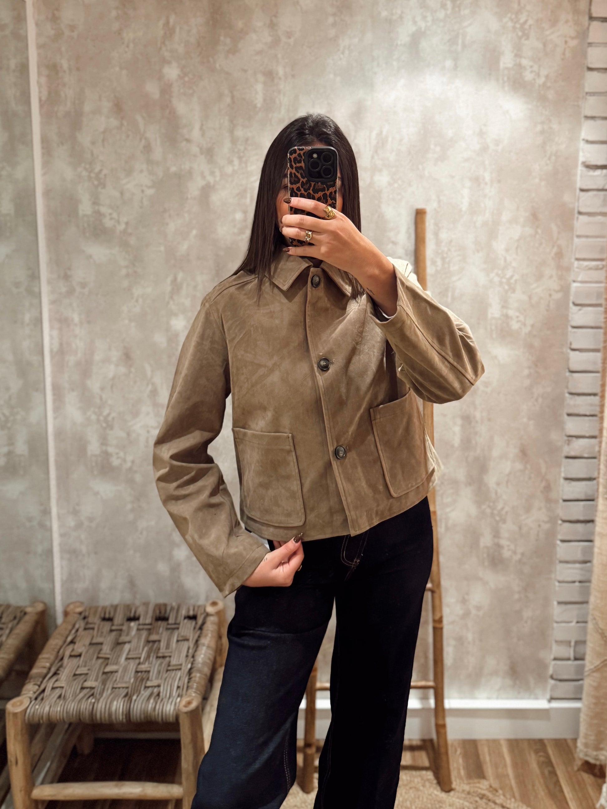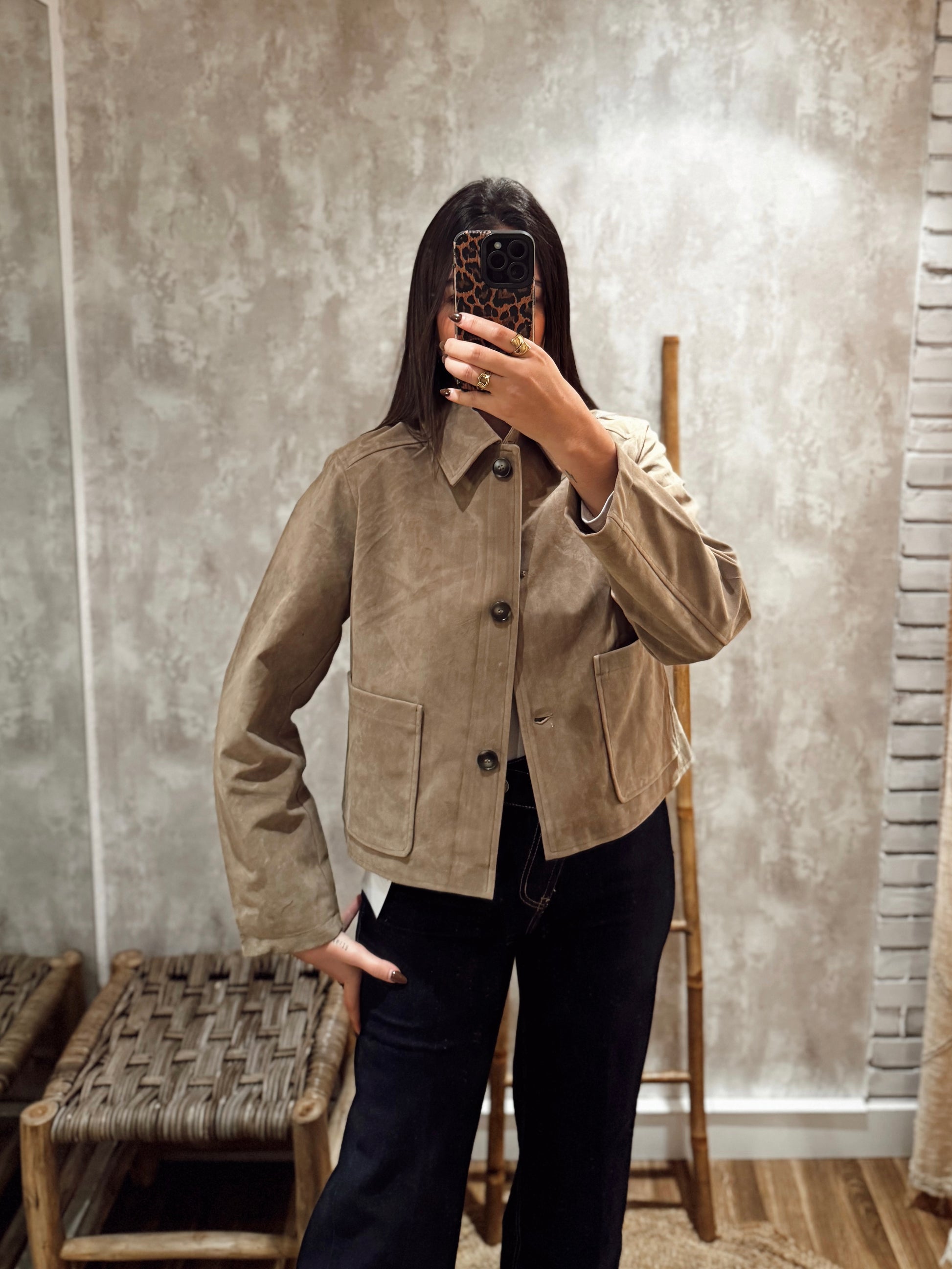 Casaco curto em tecido com toque de pele de pêssego, suave e agradável ao tato. Modelo com gola clássica, bolsos frontais e fecho com botões, perfeito para um look casual e elegante. O corte reto e o acabamento delicado tornam esta peça uma escolha versátil para o dia-a-dia.
