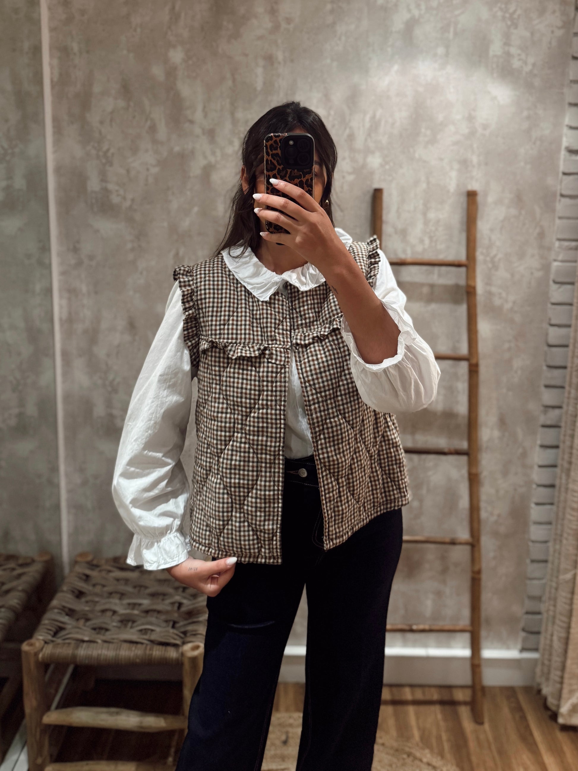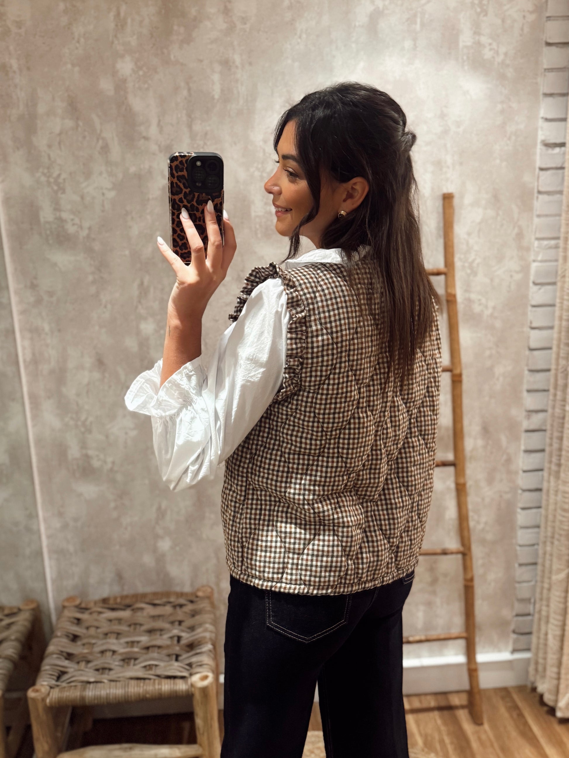 Colete acolchoado super leve e confortável, num padrão quadrado clássico em tons neutros que combinam com tudo. O tecido tem um toque macio e mantém-te quentinha sem pesar, perfeito para jogar por cima de camisas, malhas ou até vestidos.