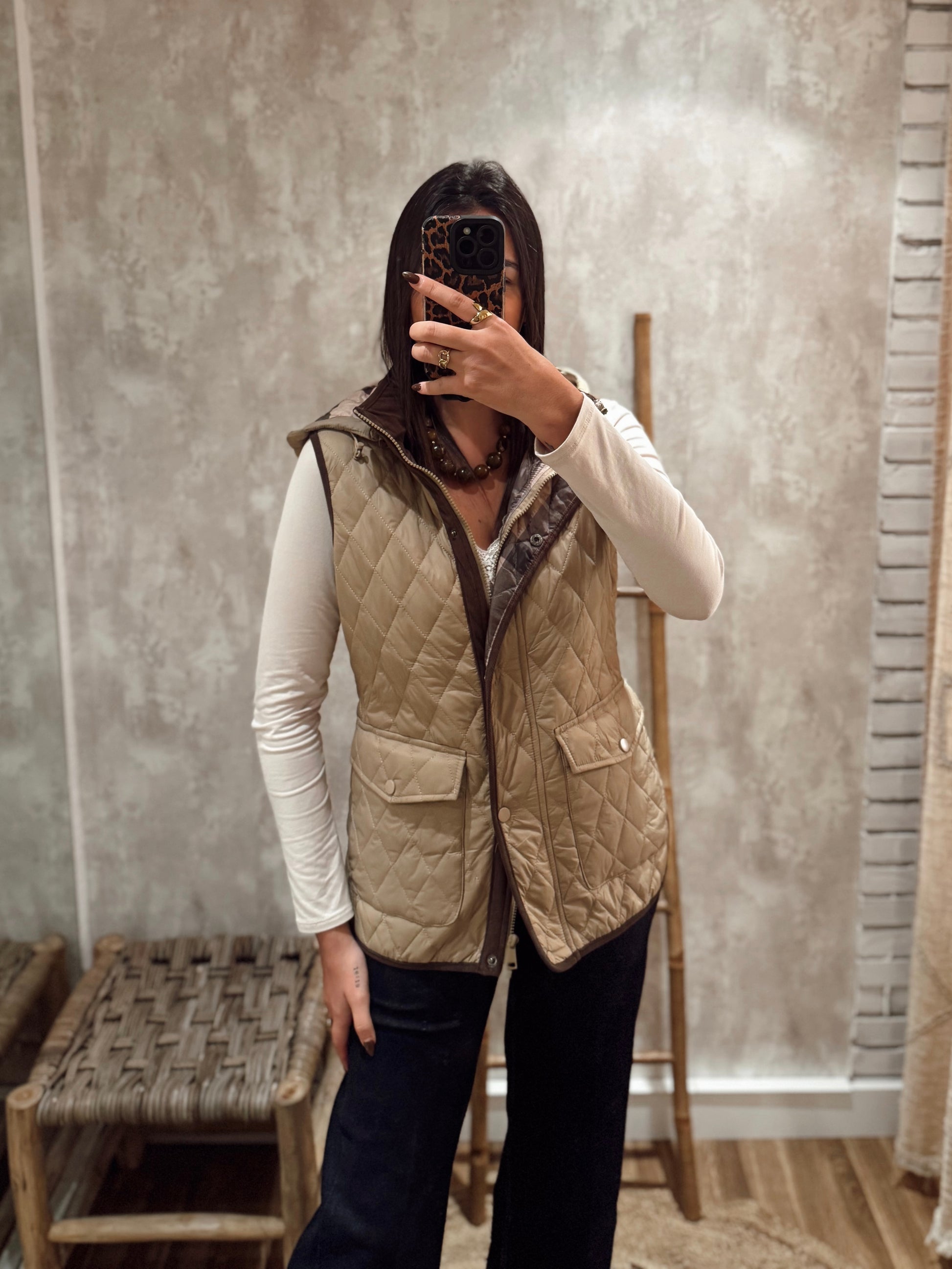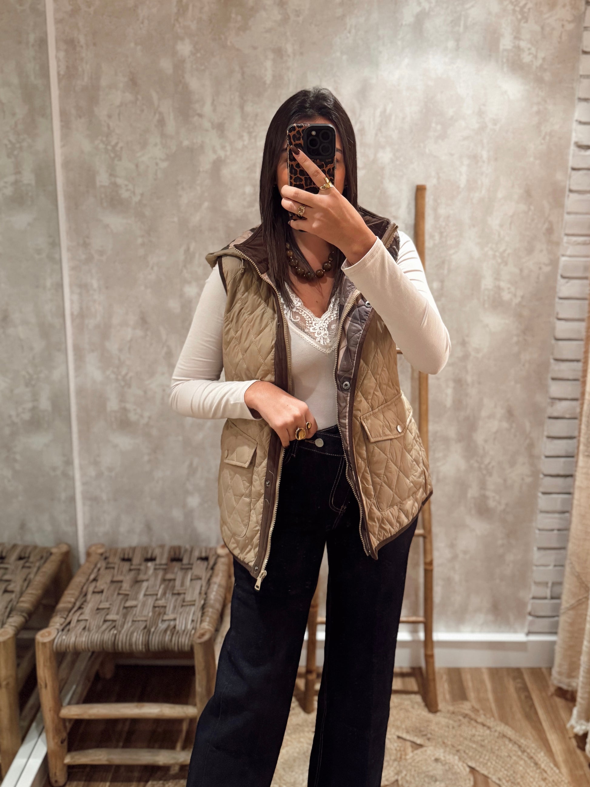 Colete acolchoado em tecido impermeável, leve e confortável. Apresenta fecho frontal com molas, bolsos funcionais e capuz com delicado padrão tipo xadrez no interior, que adiciona um toque distinto e elegante. Perfeito para sobrepor em looks de dia-a-dia e manter o estilo nos dias mais frescos. Disponível em bege, castanho e preto.