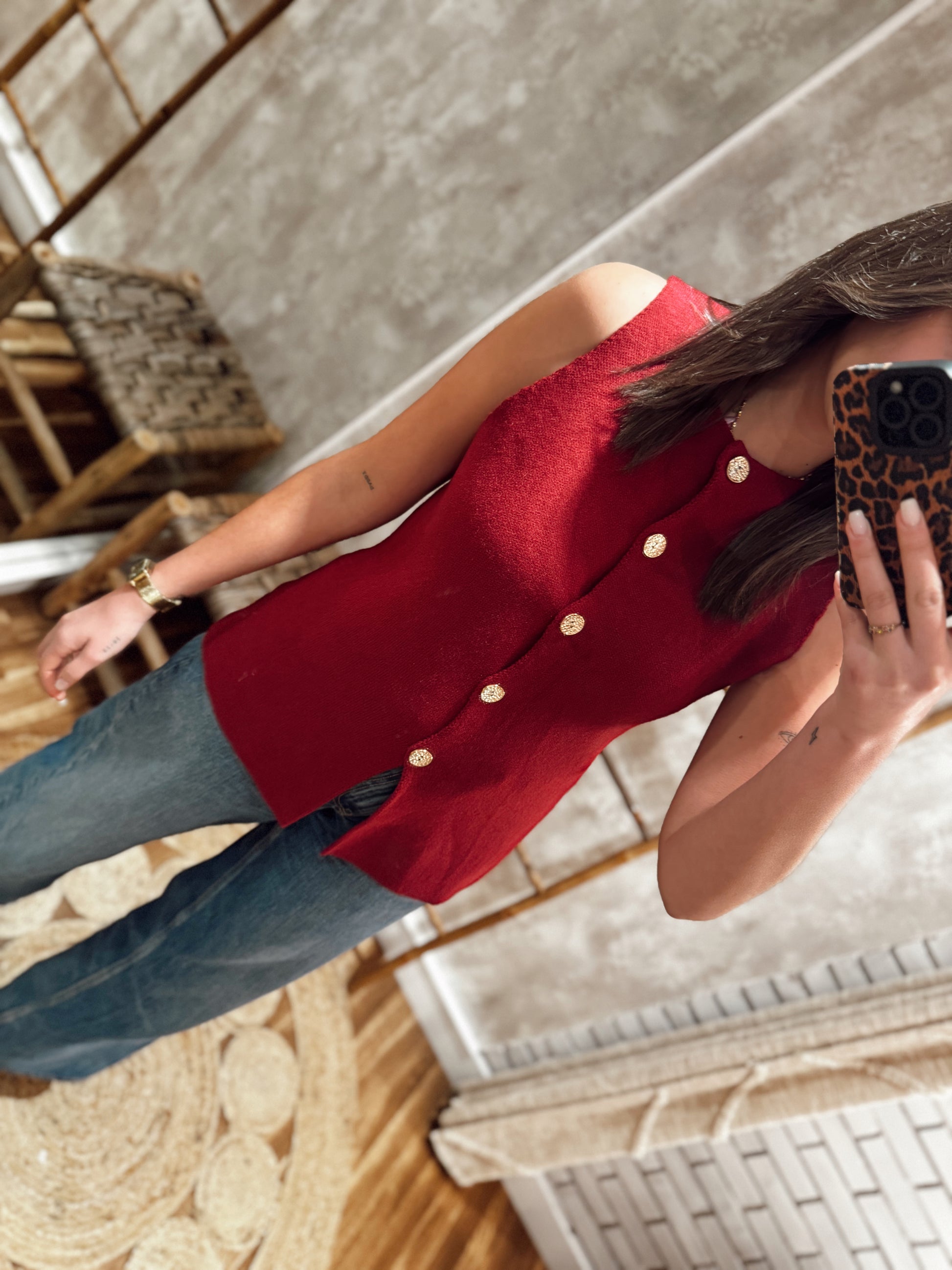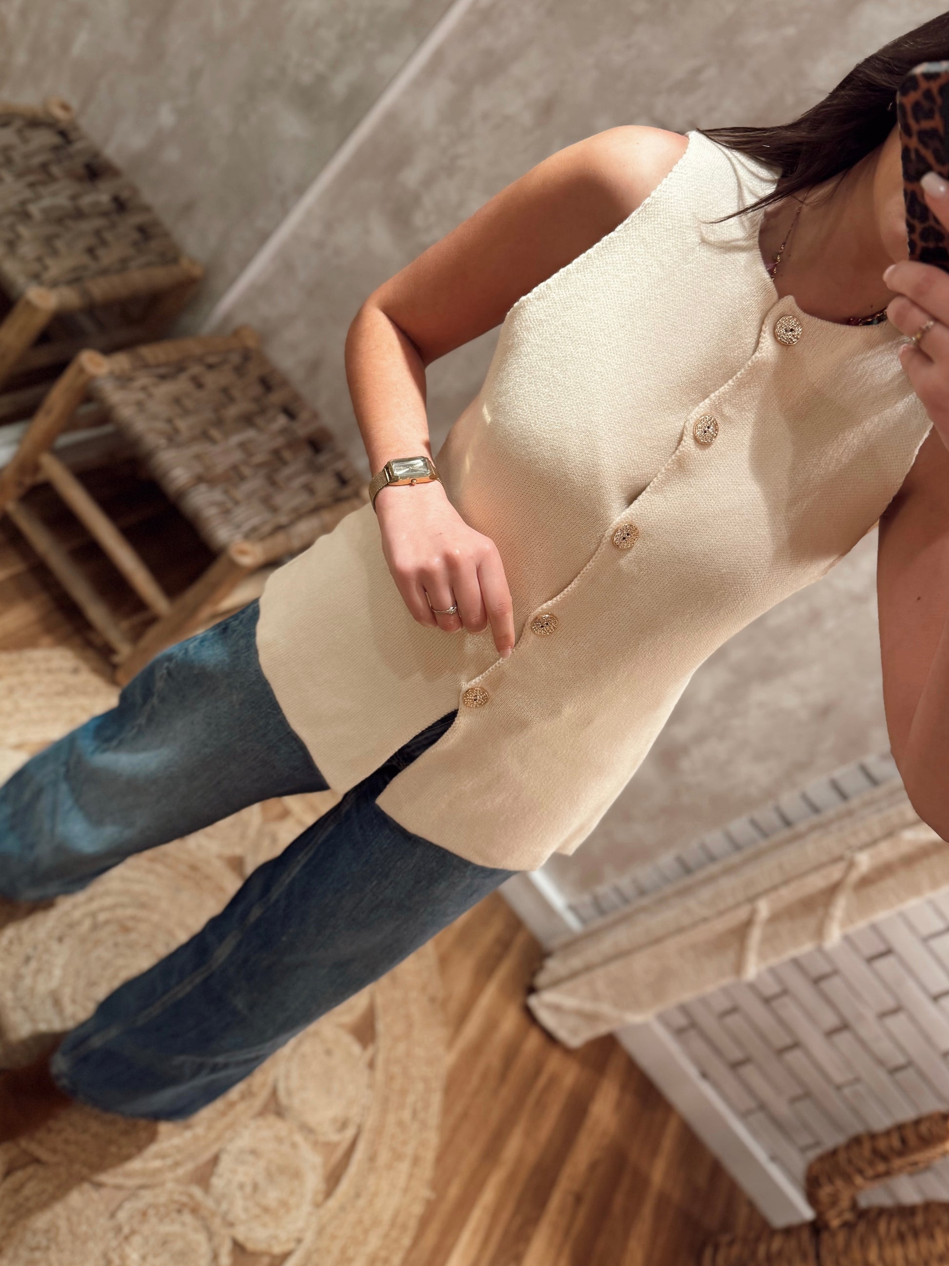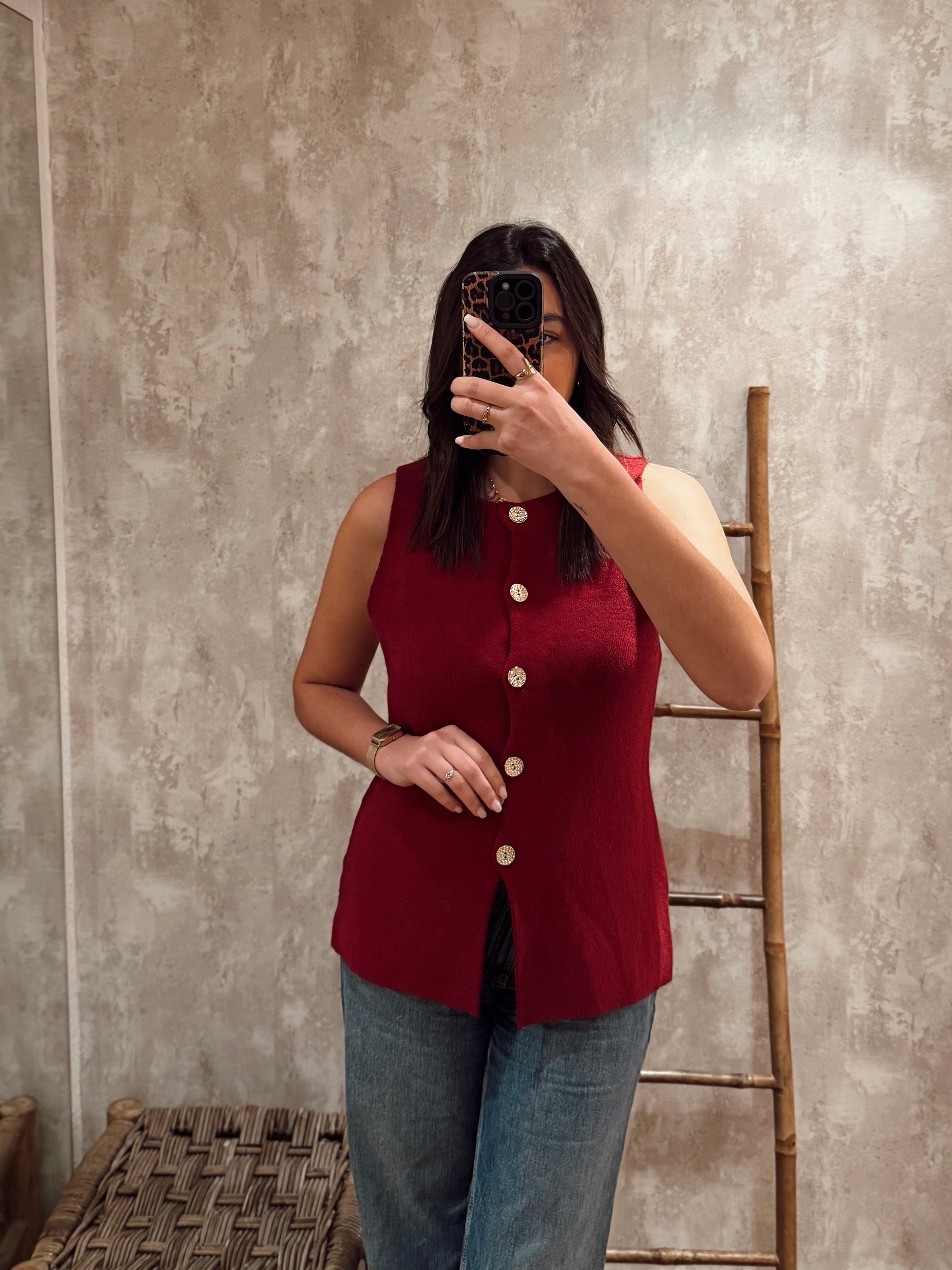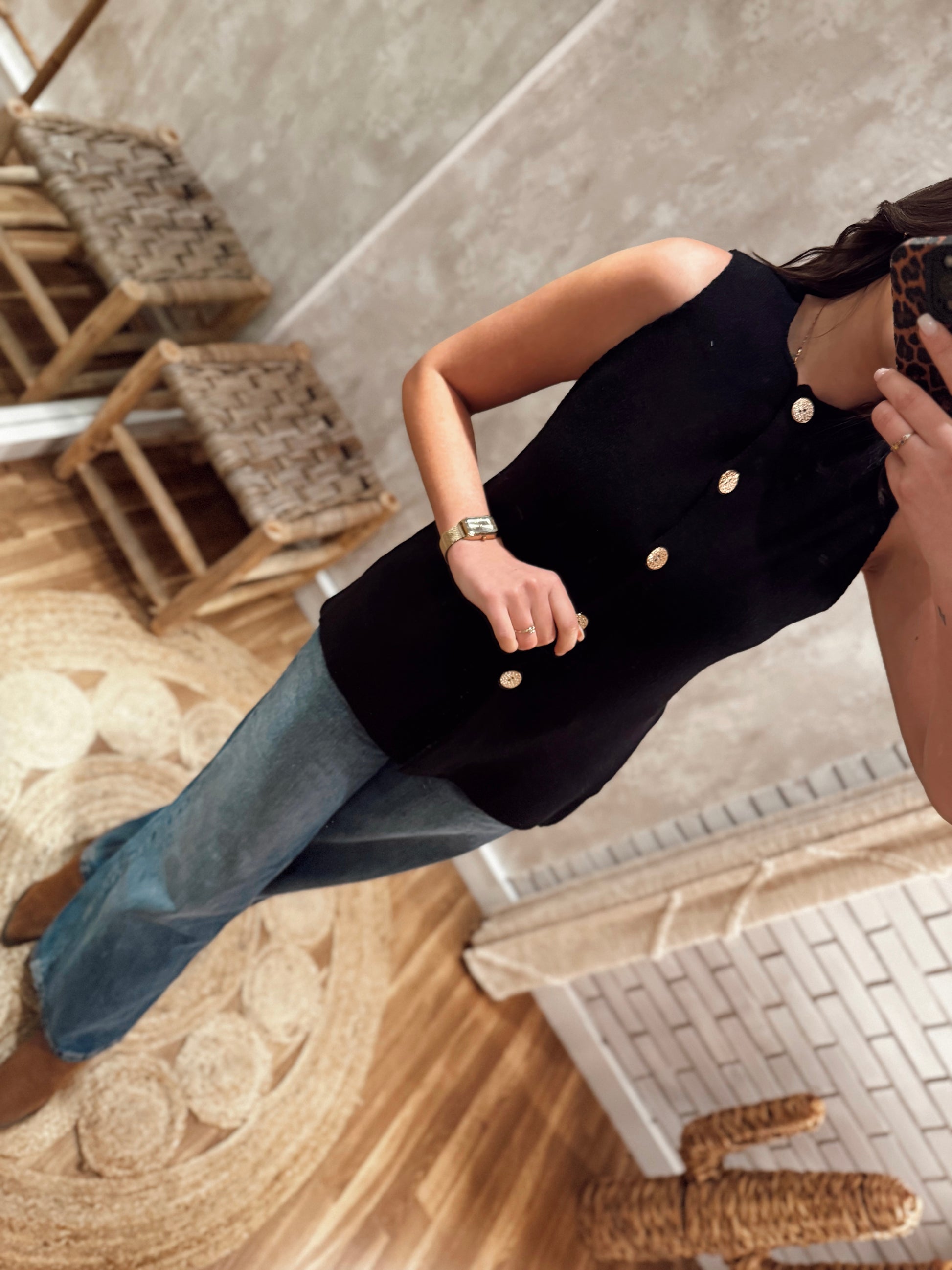 Colete em malha com botões dourados, decote clássico subido e corte alongado abaixo da cintura. Modelo elegante e versátil , ideal para complementar qualquer look com um toque sofisticado.