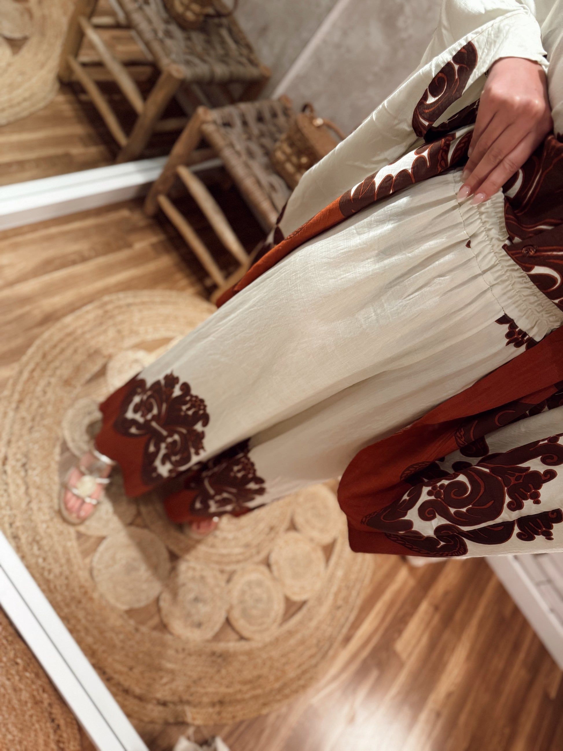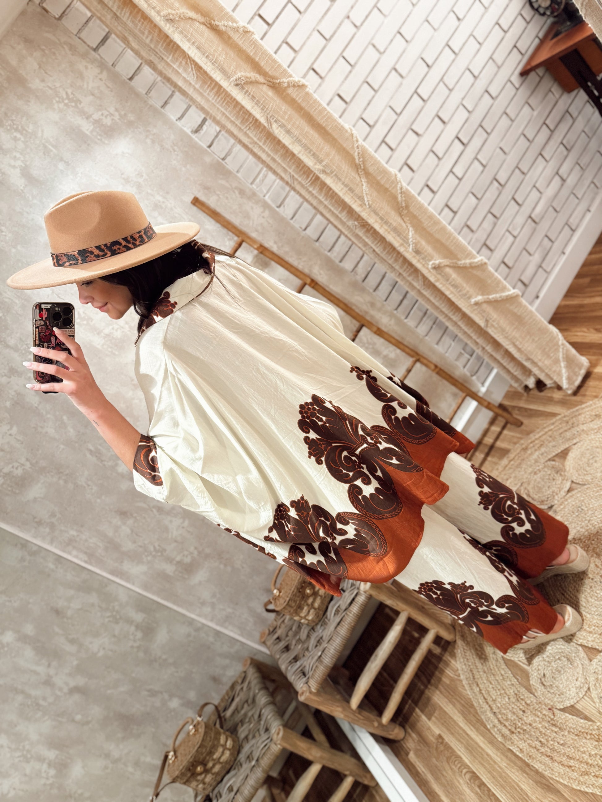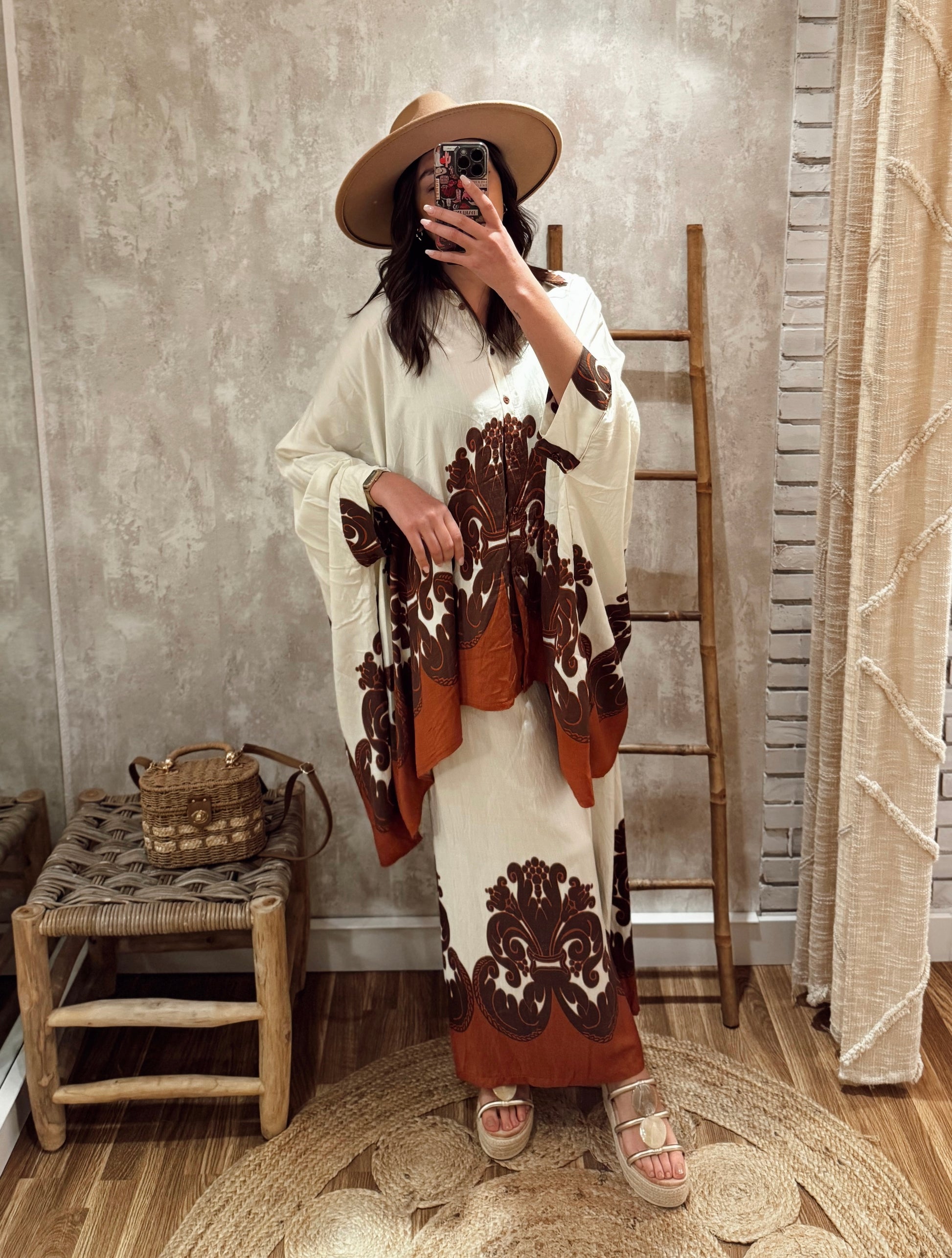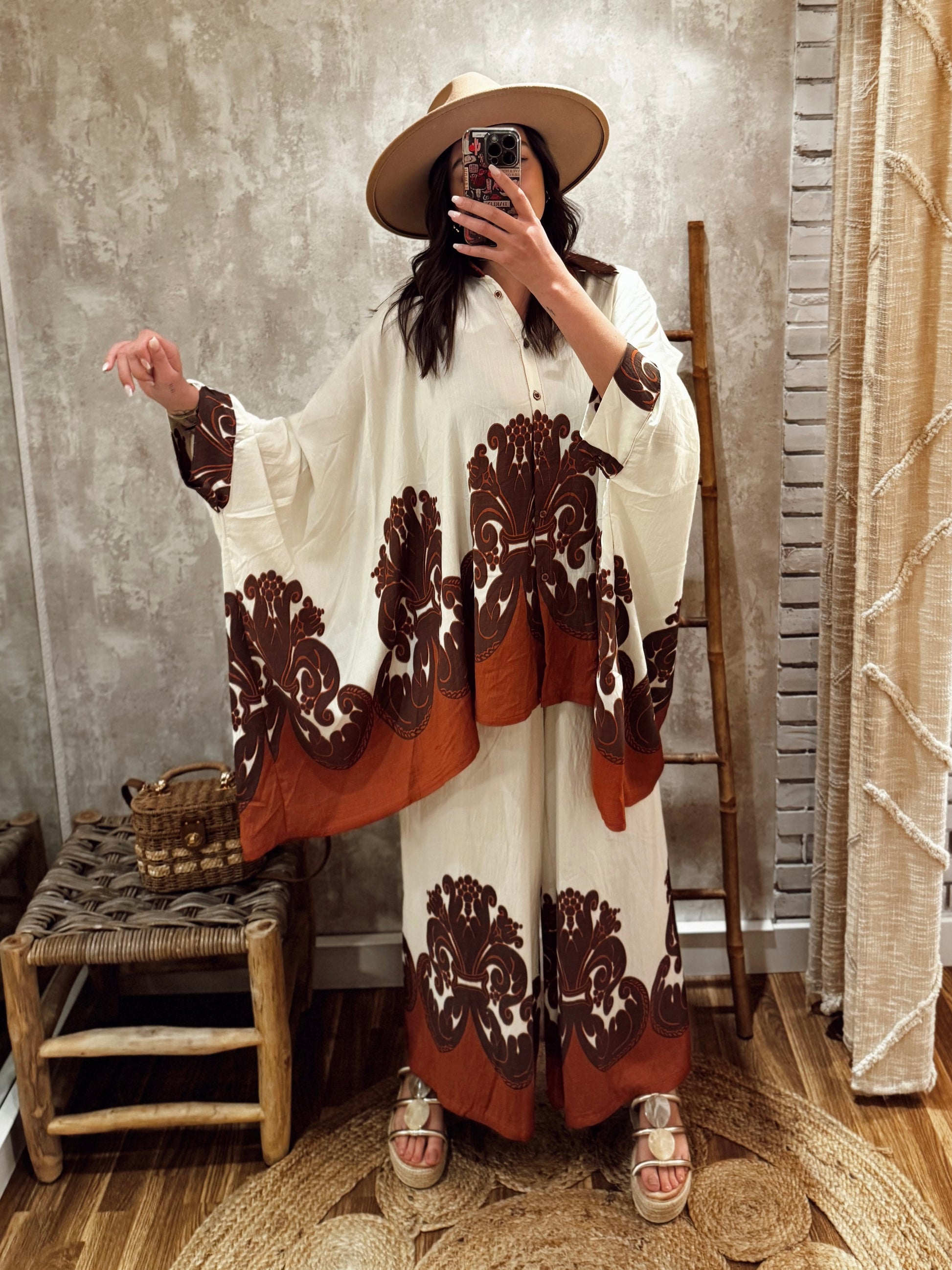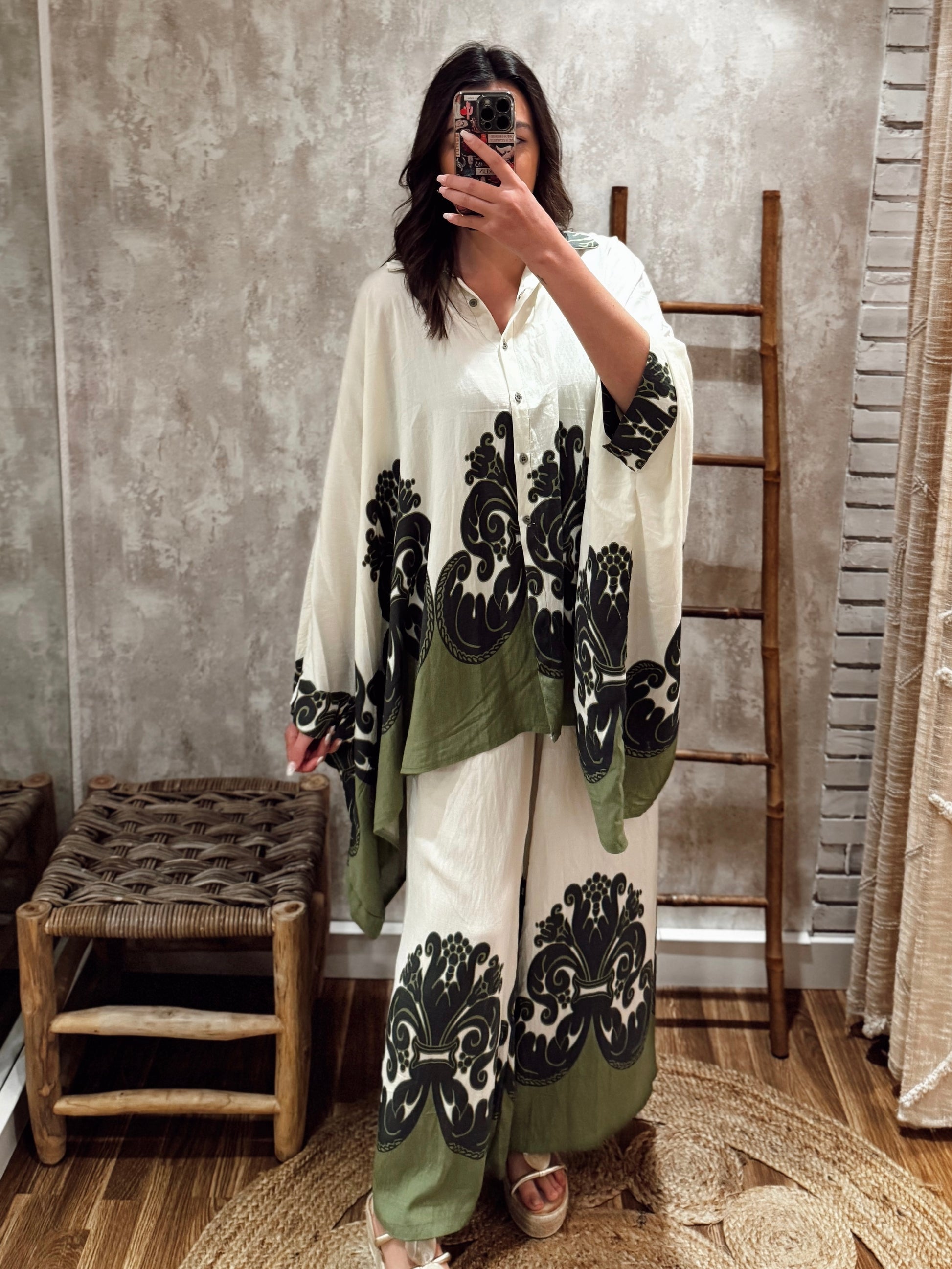 Conjunto fluido composto por camisa estilo kaftan e calça larga, ambos em tecido leve e confortável. O padrão maxi em contraste dá-lhe um toque boho-chic e elegante. A camisa tem abotoamento frontal e manga larga, perfeita para um look descontraído mas com impacto. Disponível em dois tons: terracota e verde-oliva.