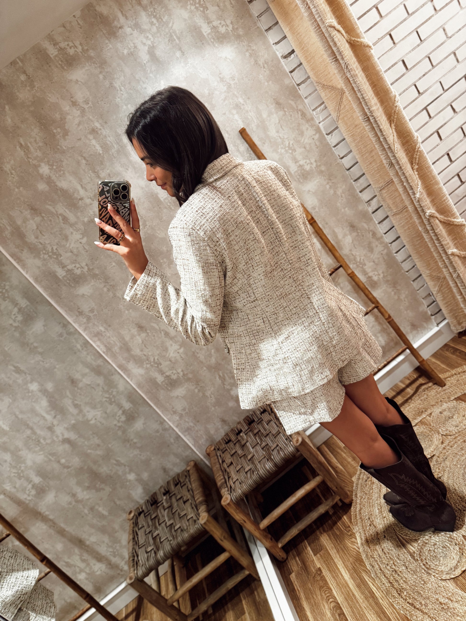 Conjunto estilo tweed composto por blazer e calção- Bege