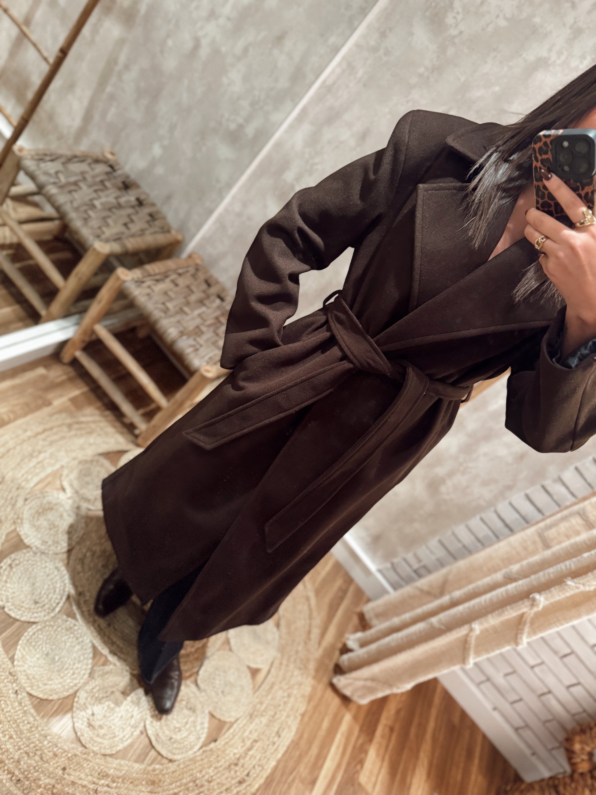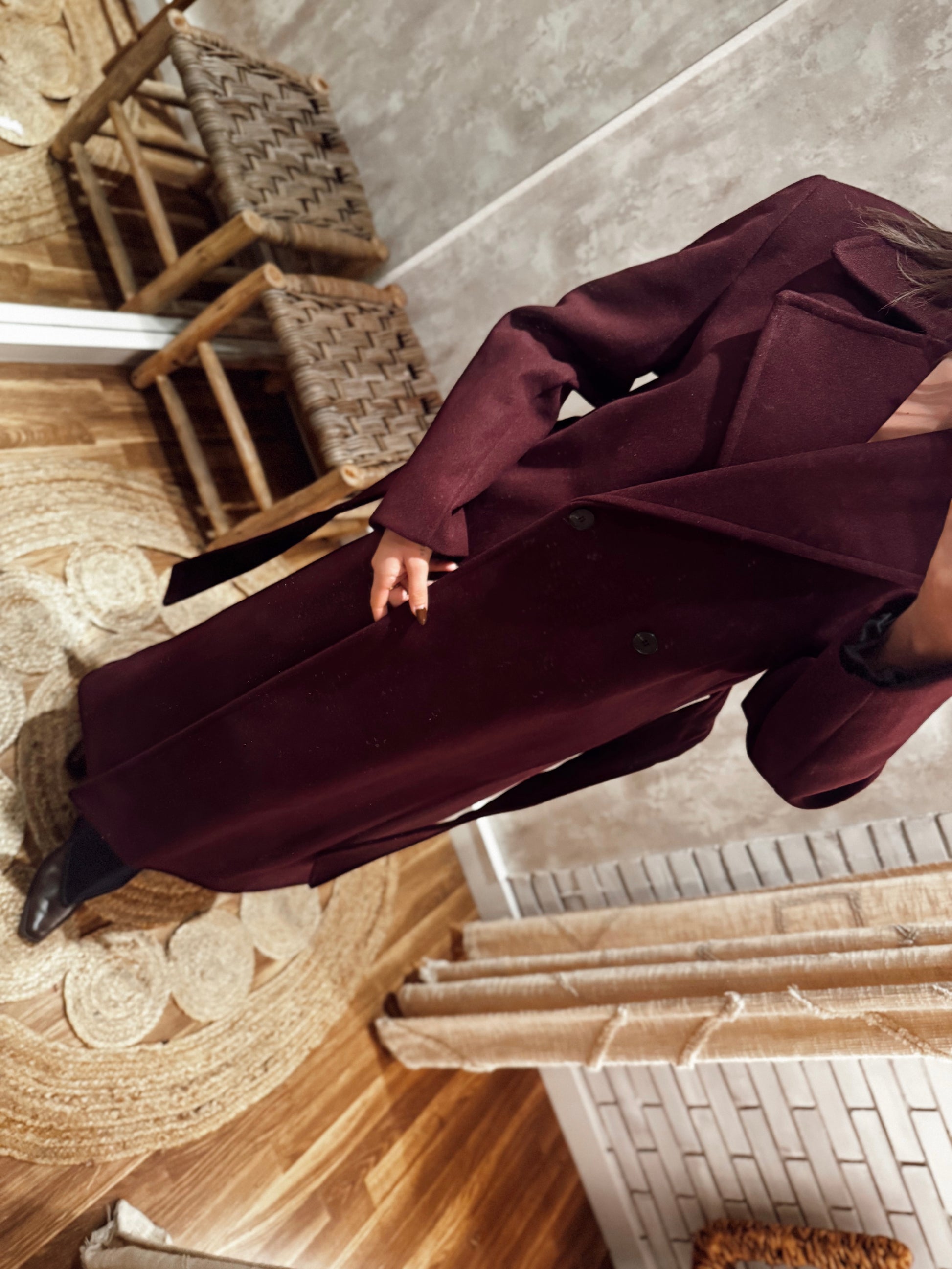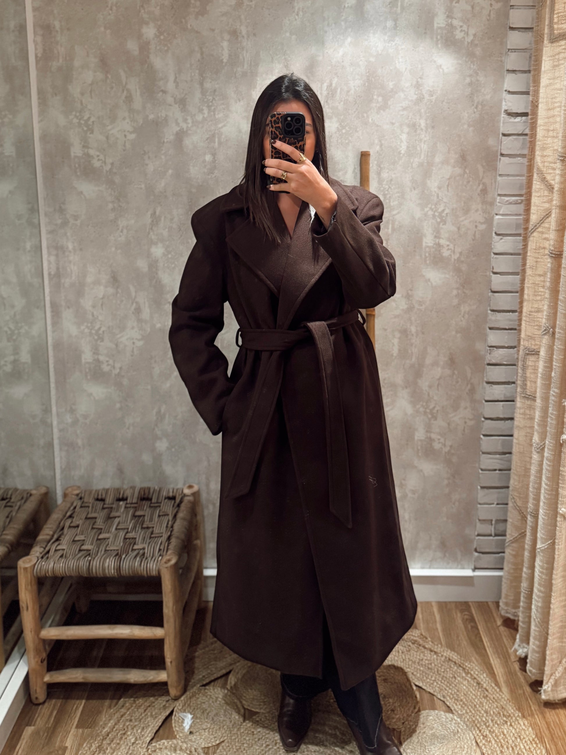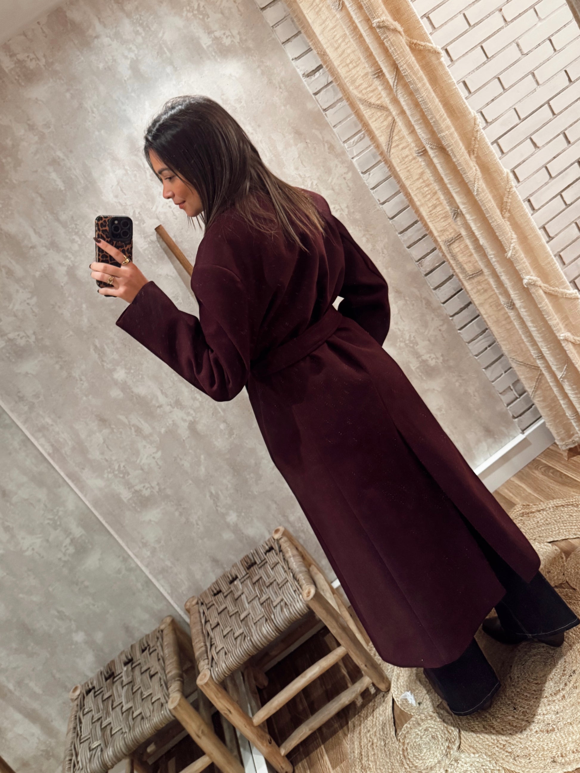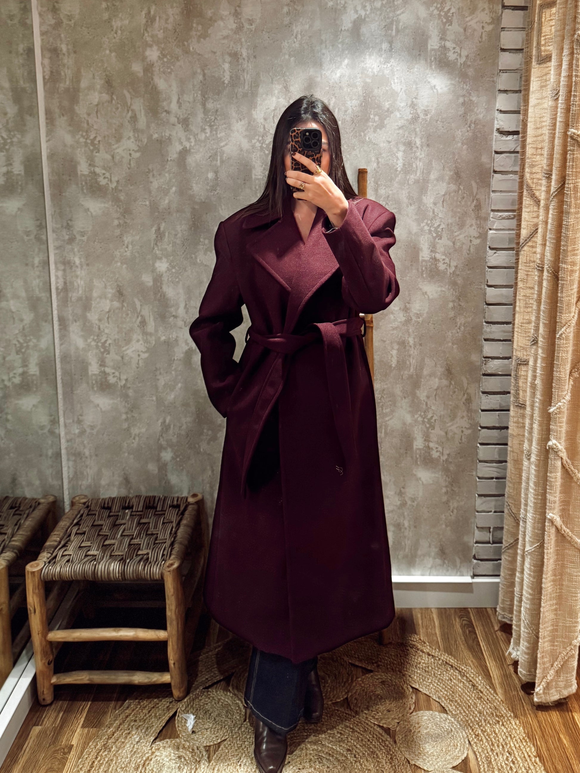 Sobretudo comprido em tecido de fazenda, com corte elegante e toque suave. Modelo de lapela larga, bolsos laterais e cinto do mesmo tecido para ajustar na cintura. Um clássico da Lumina, ideal para quem procura um look sofisticado e intemporal. Disponível em duas cores — bordo e castanho.