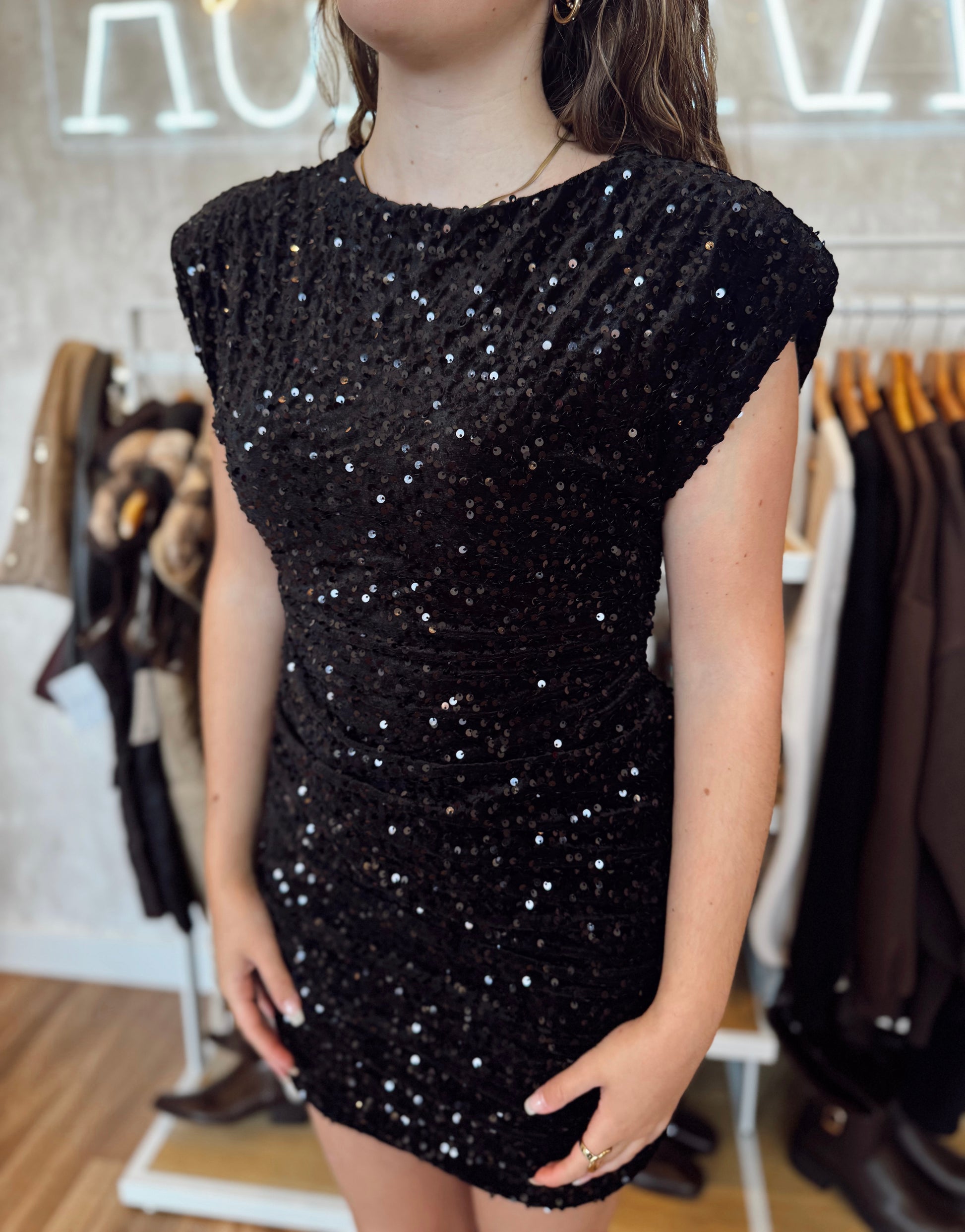 Vestido curto em tecido aveludado com lentejoulas aplicadas, com ombreiras e efeito franzido que favorece a silhueta.