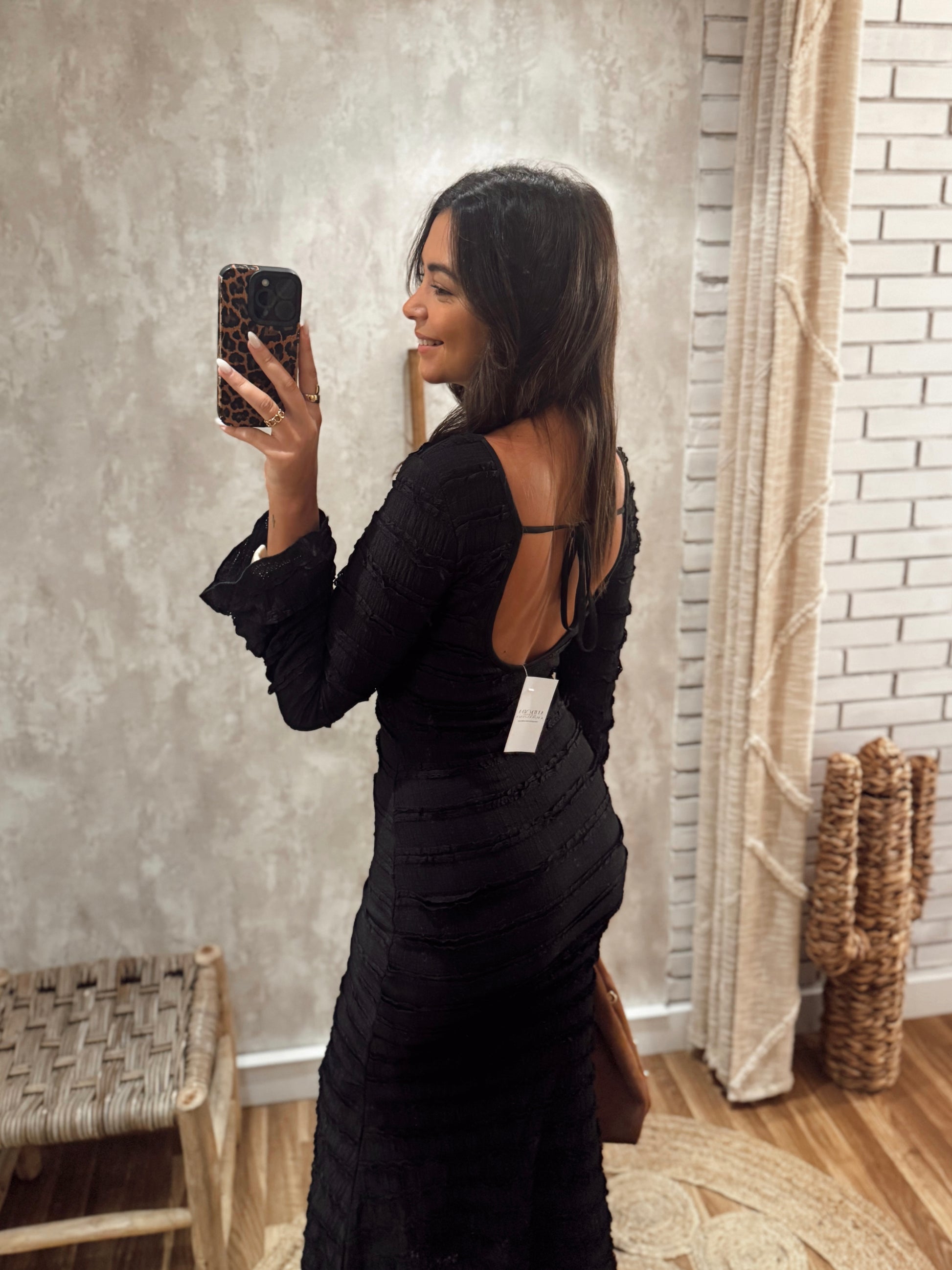 Vestido comprido em tecido estruturado preto, com manga comprida e corte justo que realça a silhueta. O detalhe em textura horizontal dá-lhe um toque sofisticado e moderno. As costas abertas com laço fino tornam-no ainda mais elegante e feminino — perfeito para ocasiões especiais ou jantares mais requintados.